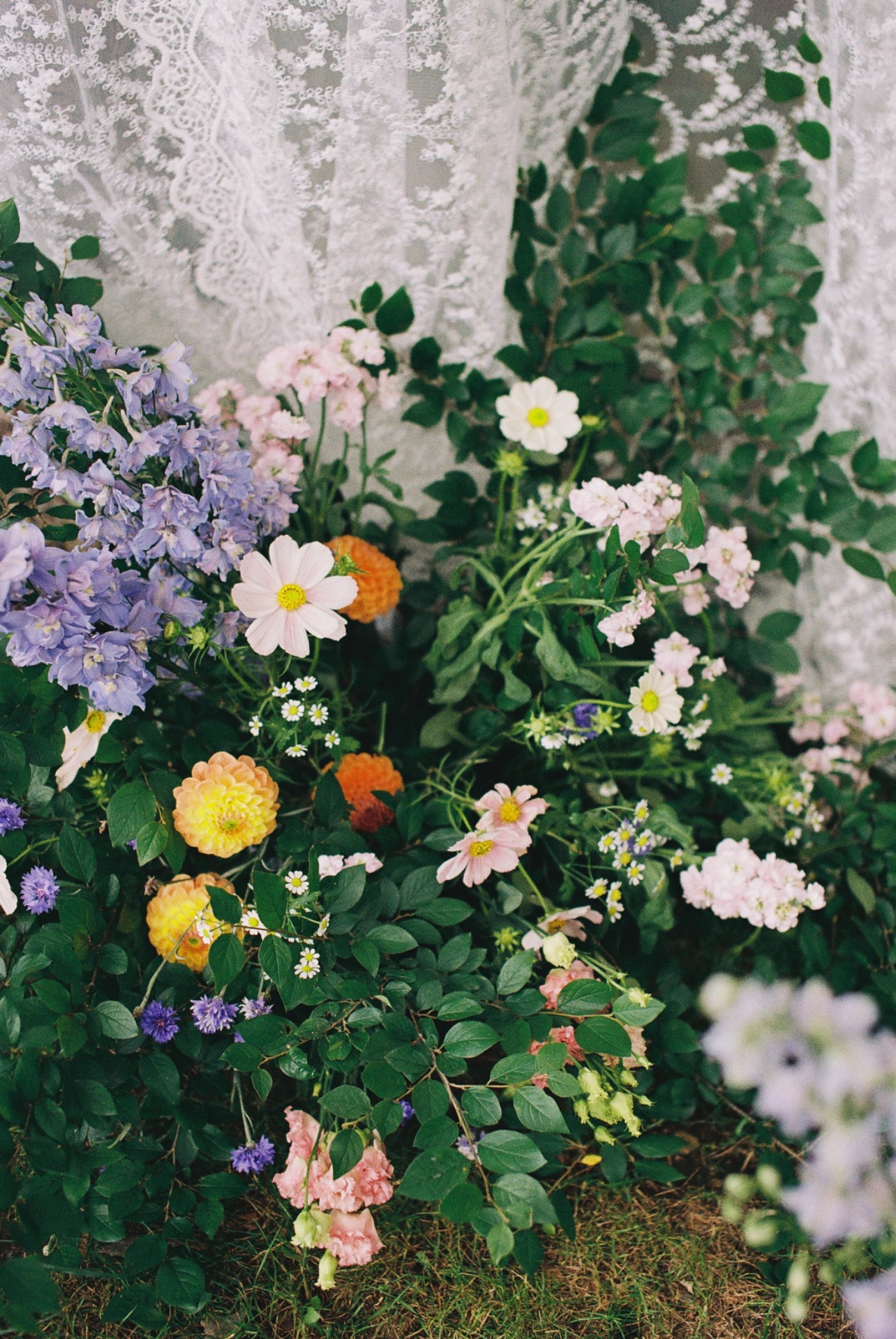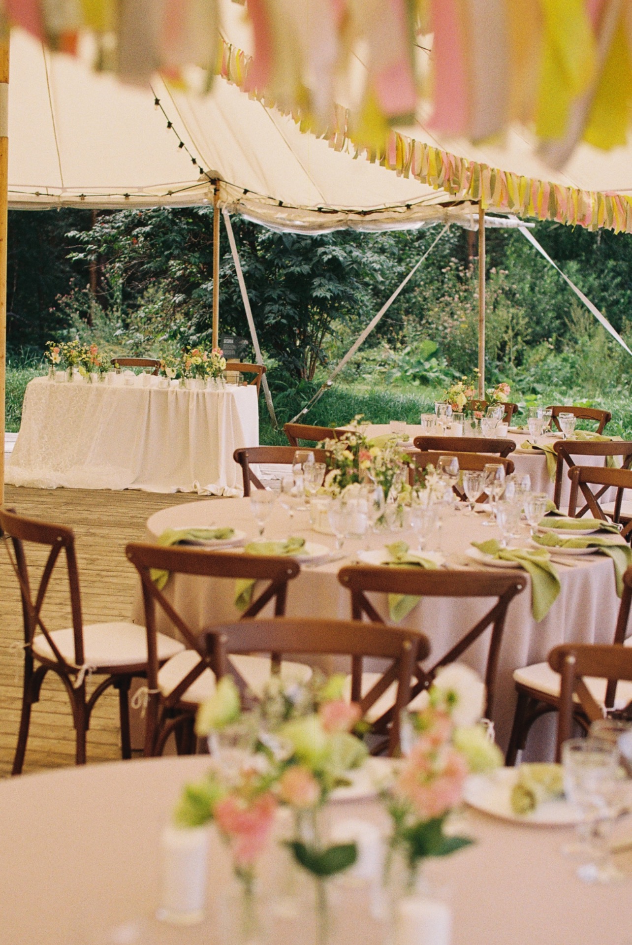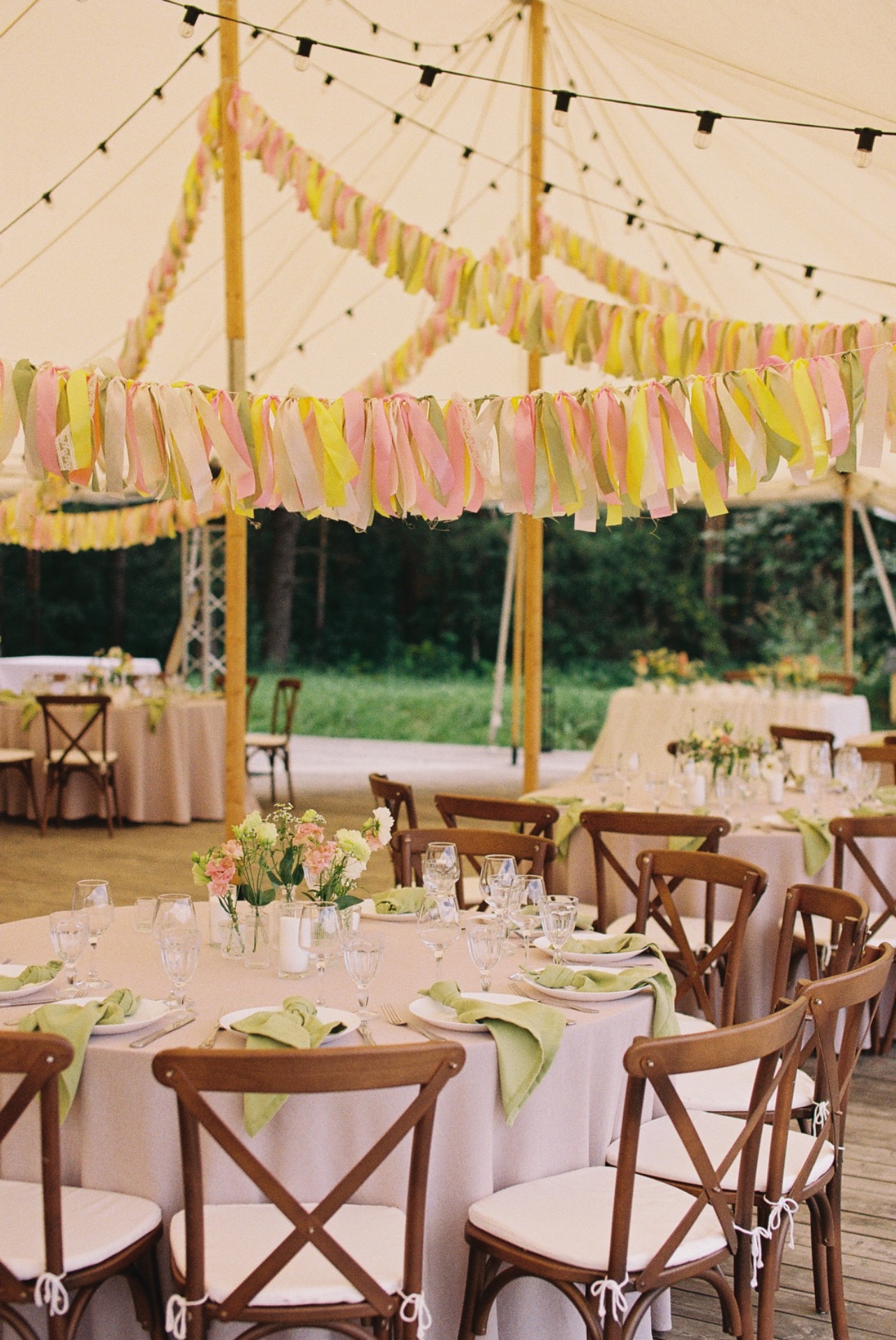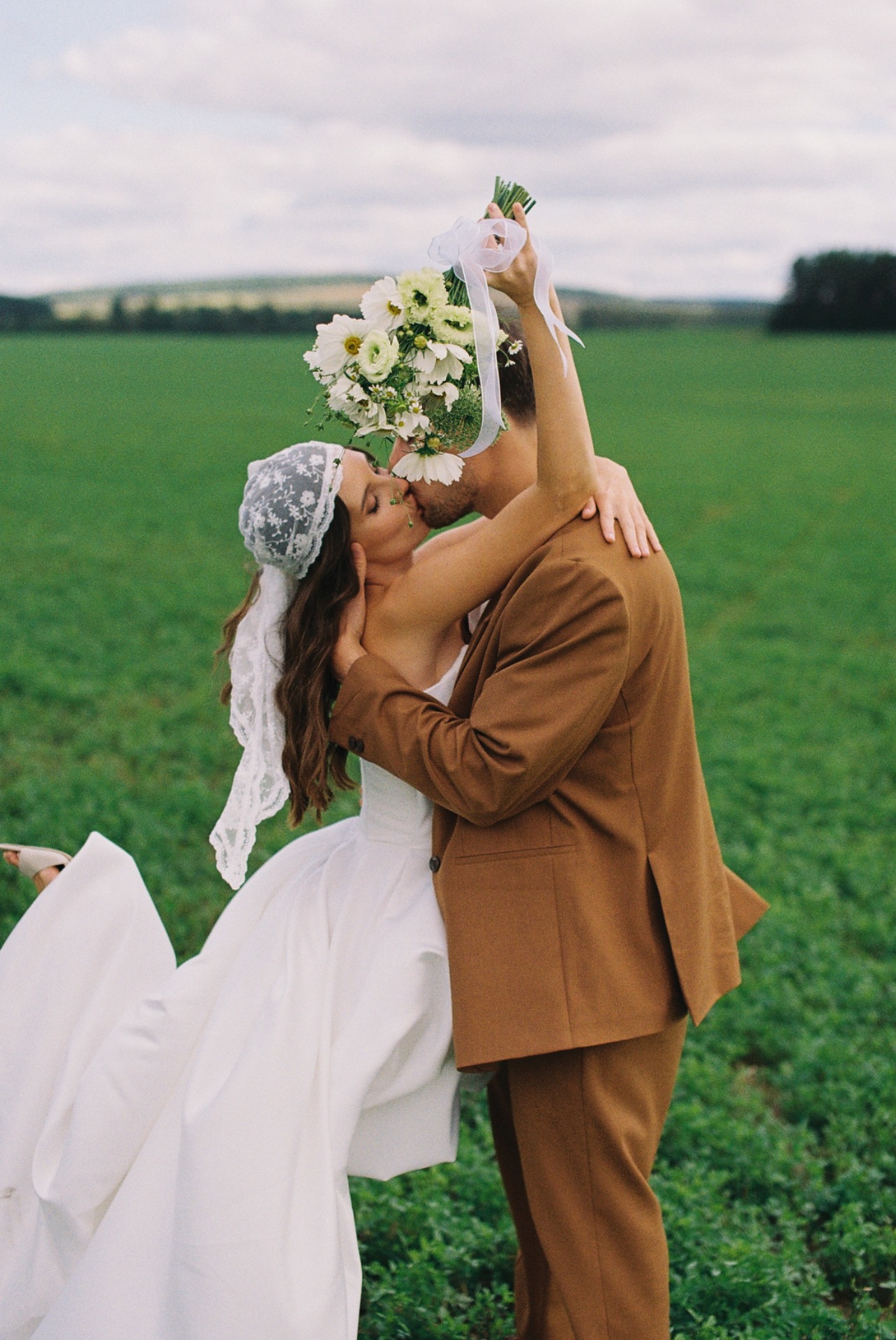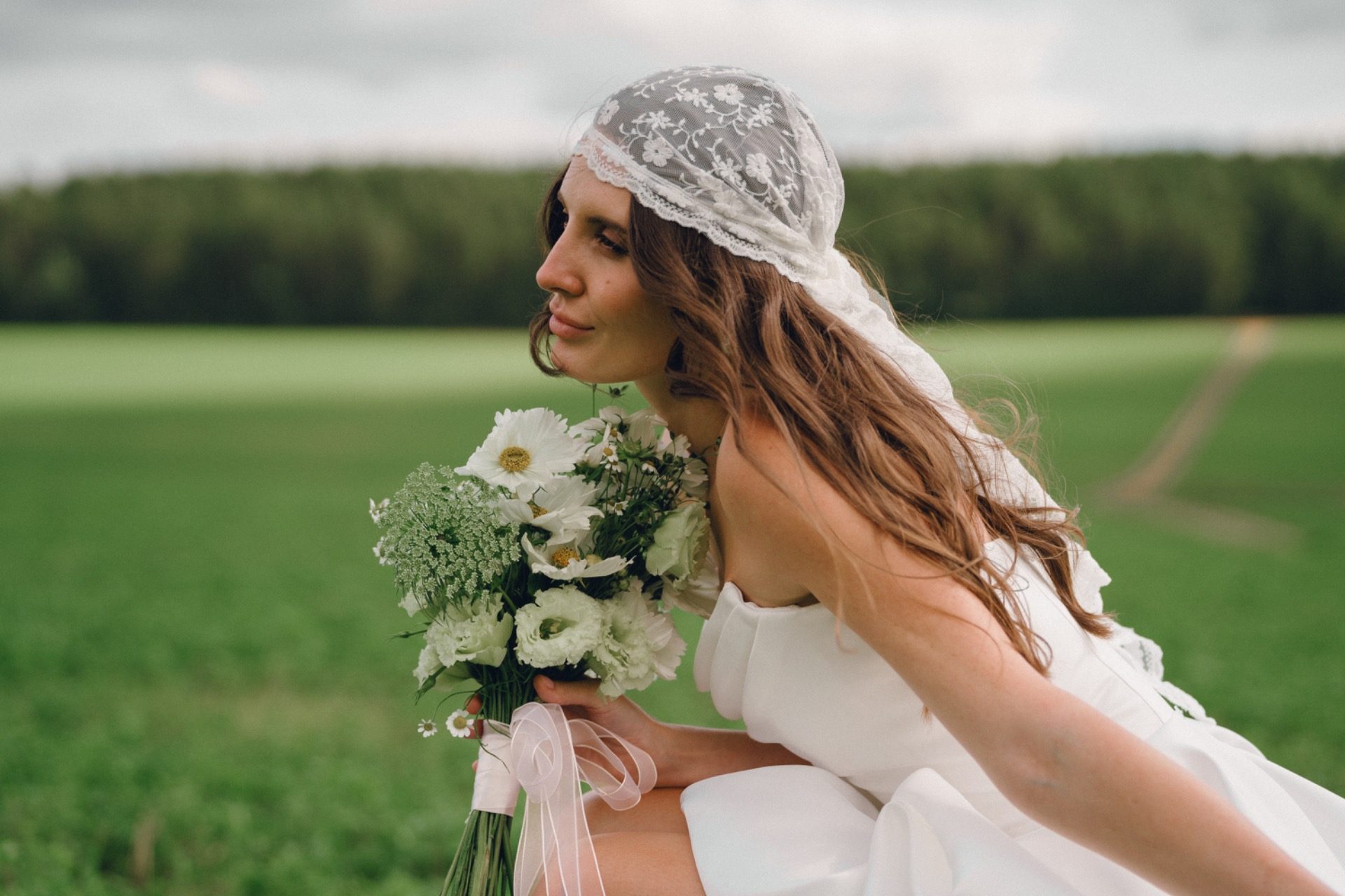 Площадка в поле подсказала нам настроение и палитру нашего дня: лёгкий ретро-вайб и полевые цветы. Оттенки мы выбрали приглушённые, словно слегка затронутые сепией, как старые фотографии, но в современном прочтении.