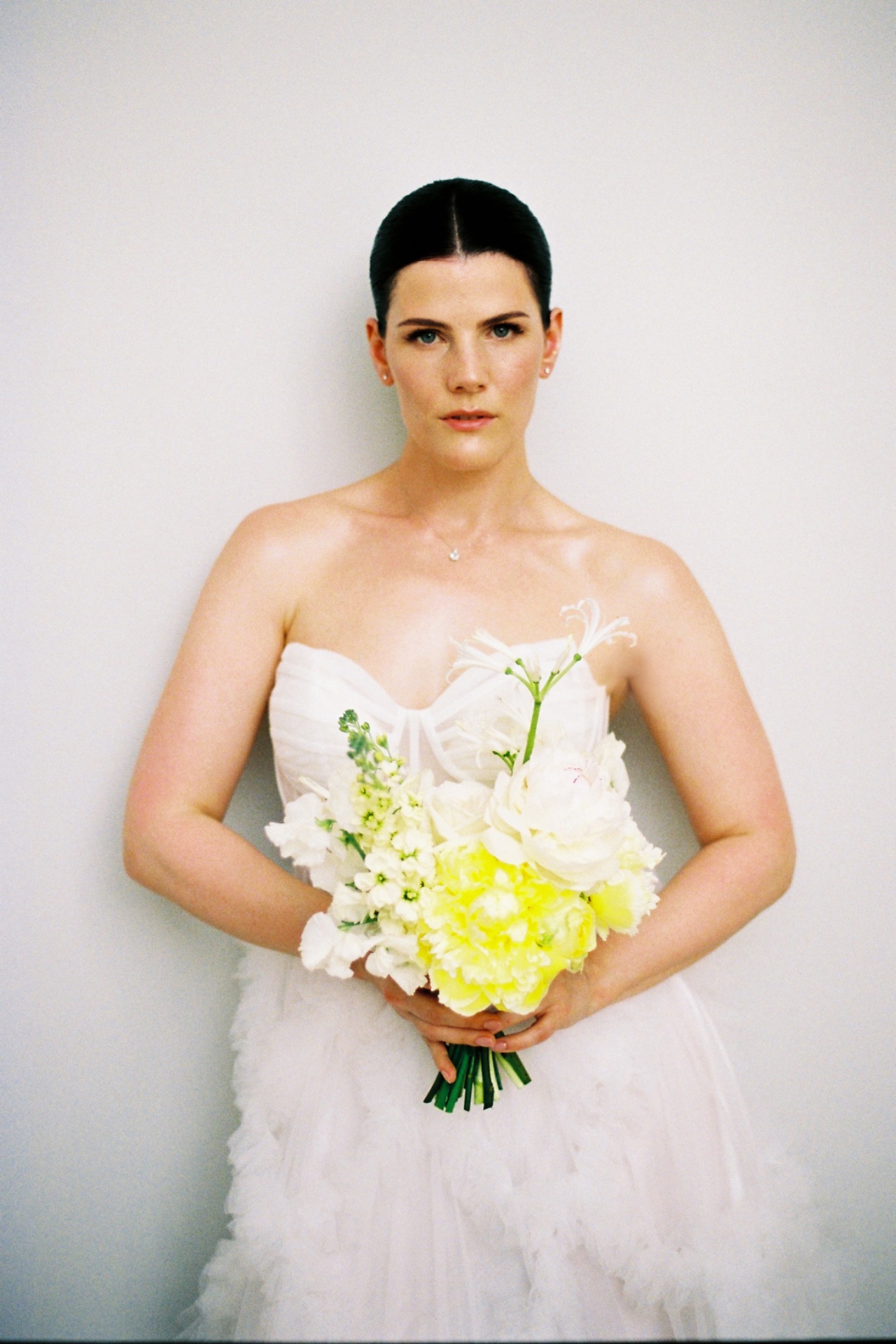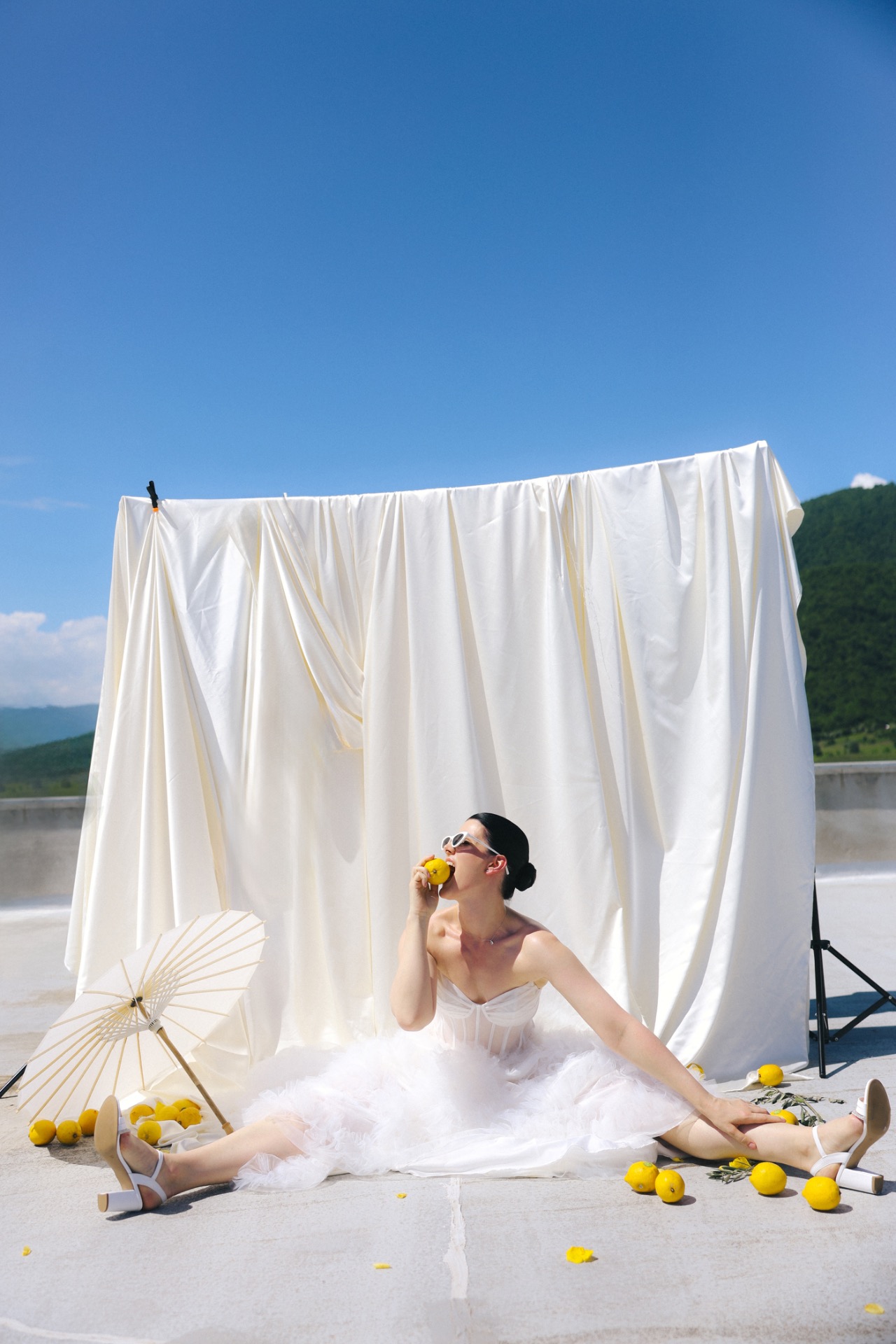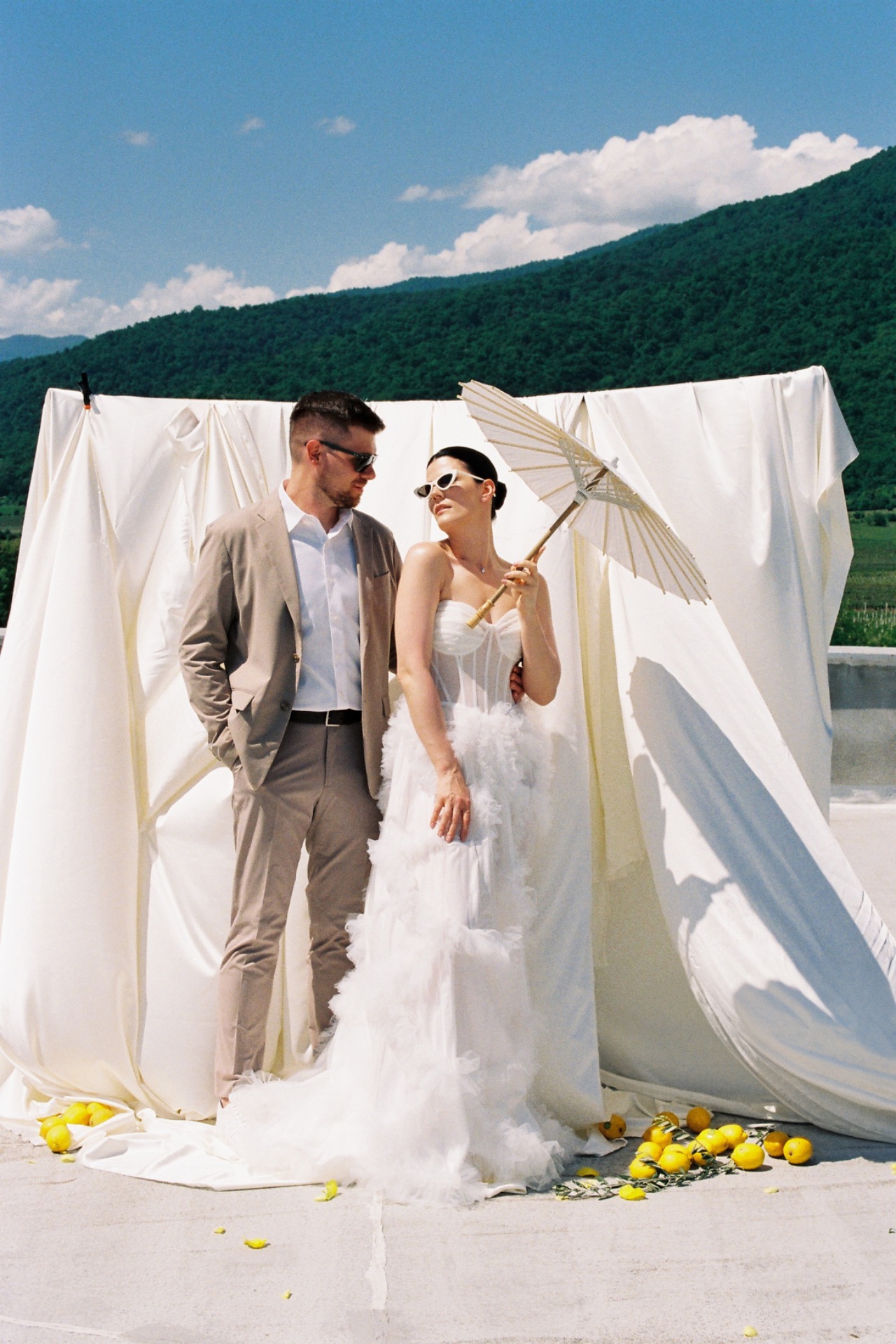 Вместо классической съёмки «утра невесты» наш фотограф, Ксения, предложила фото на крыше. Белая ткань фона, яркое солнце, силуэты гор — получилась почти fashion story с винтажным настроением 60-х.