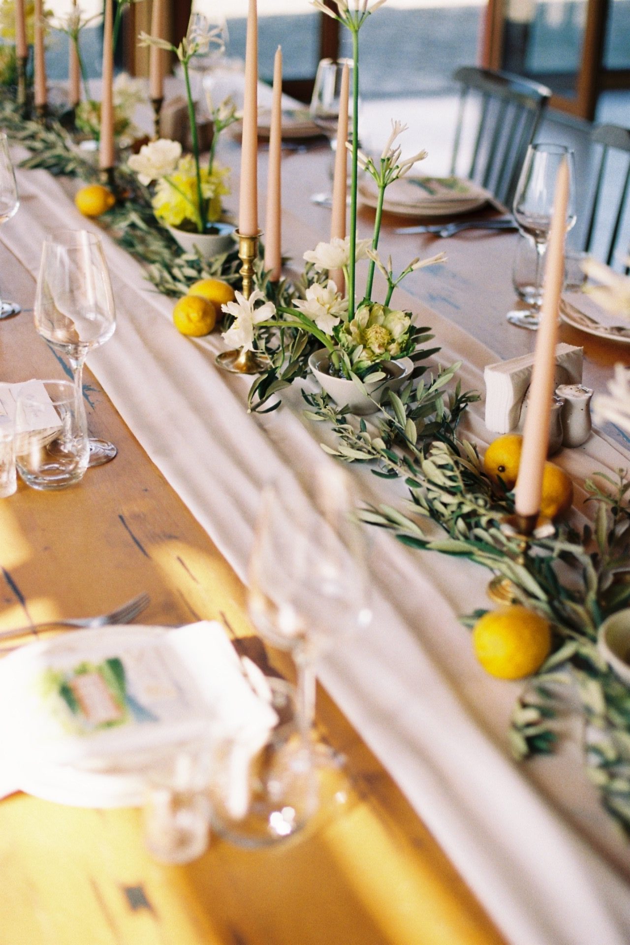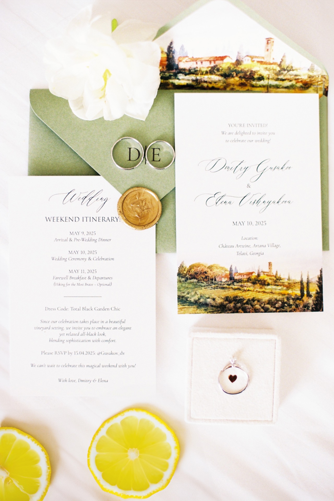 Концепция нашей свадьбы родилась у меня почти сразу. Камерное празднование в духе южной Европы: два дня с самыми близкими, предсвадебный ужин в винном шато и церемония в винограднике на закате. Зелень, цветущие лимоны, камень и дерево, впитавшие солнечное тепло. Тени от кипарисов, ветви олив, аромат жары. Неспешная, расслабленная роскошь, как в старых итальянских фильмах. Так и сложилась наша палитра: white, lemon zest, butter yellow, olive green, earthy beige, taupe.