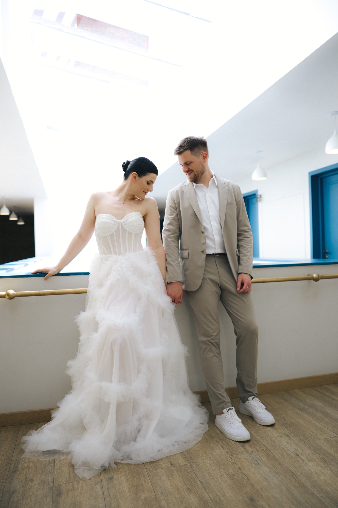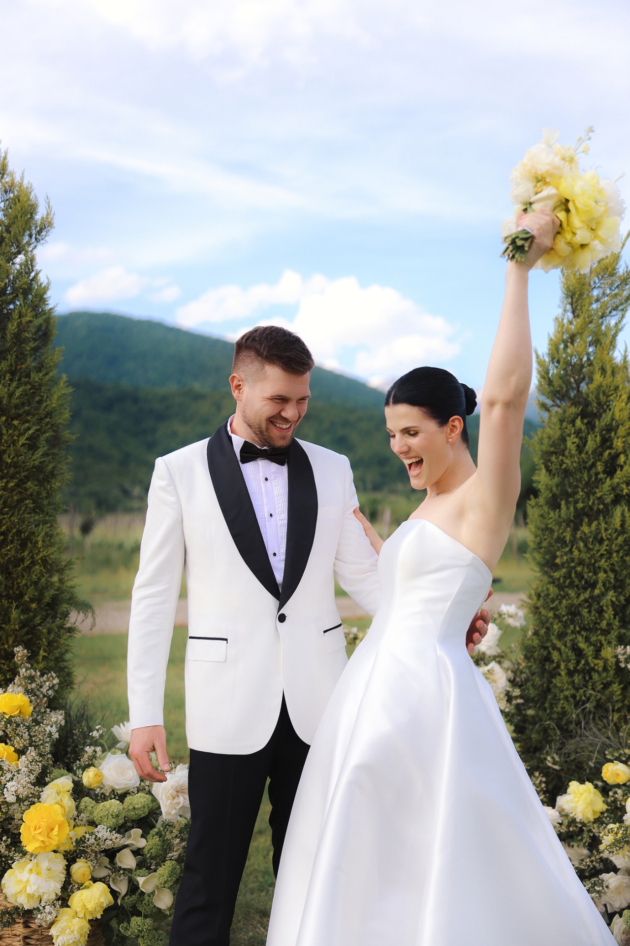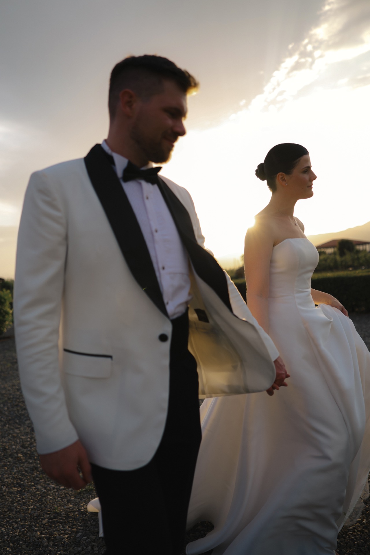 Для церемонии я выбрала гладкое платье из duchess satin — тяжёлое, благородное, почти скульптурное. Прямая линия корсета отсылала к вечерним платьям Givenchy 50-х, а объёмная юбка со шлейфом отдавала дань силуэту New Look и фактурной строгости Carolina Herrera. Образ Димы — белый смокинг с чёрными лацканами, сшитый по индивидуальным меркам. Мы заказали пошив через Hockerty: я сама сняла все замеры, подобрала ткань, фасон. Получился именно тот силуэт, о котором мы мечтали — чёткий, минималистичный, южноевропейский.