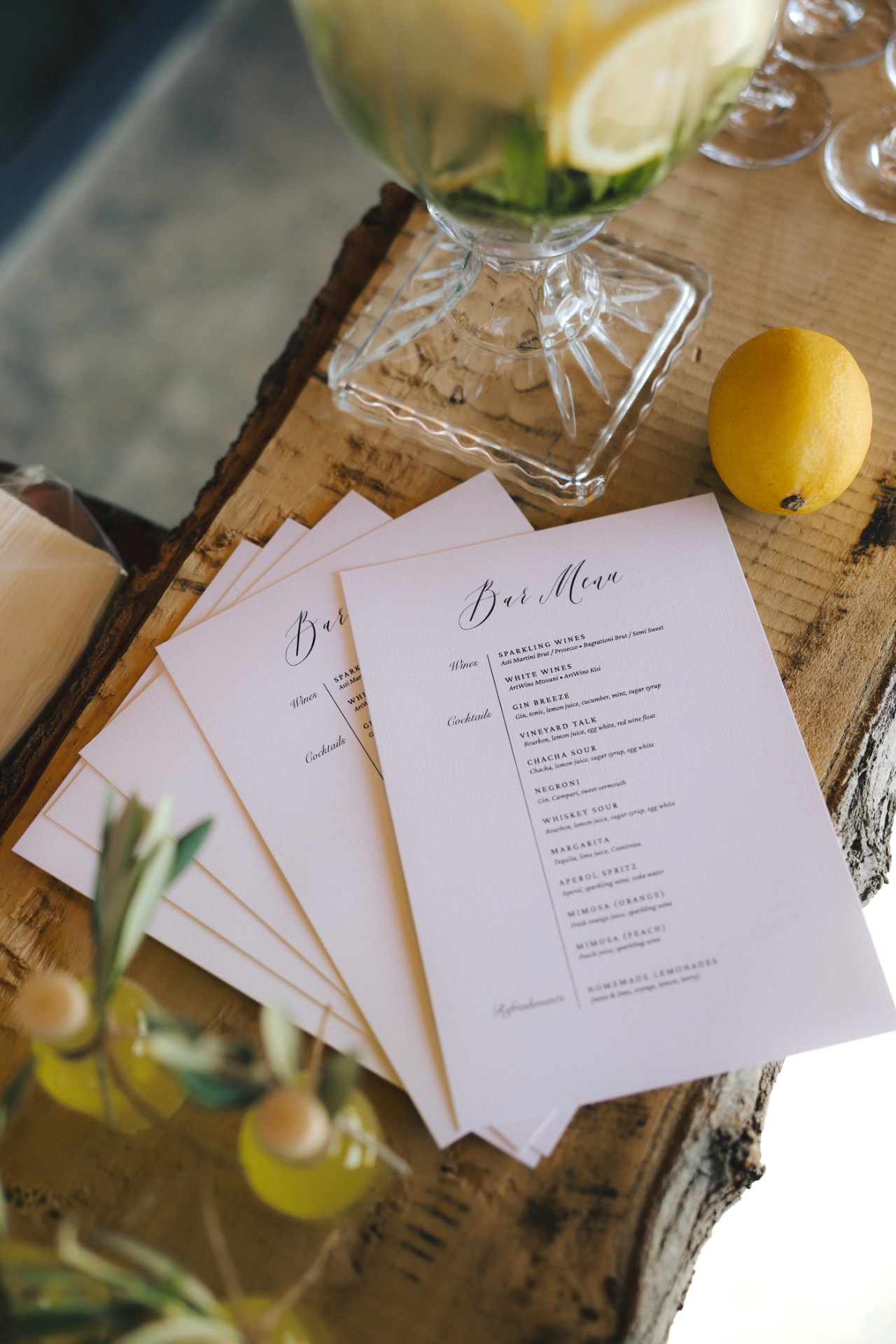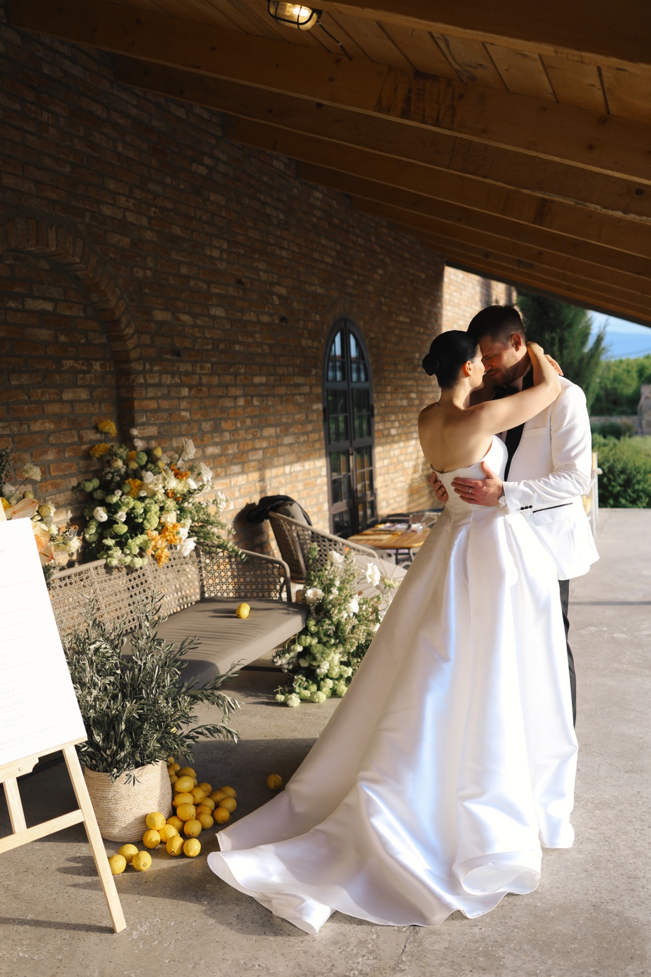 Мы выбрали локацию Chateau Artwine. Место, где само пространство диктует стилистику. Мы решили не спорить с природой, а вписать декор в её архитектуру. Вместо арки — два стройных кипариса. В дополнение к ним — плетёные корзины с белыми и лимонными цветами, ветви олив, рассыпанный повсюду лимон, как солнечные мазки. Рядом с зоной церемонии мы устроили бар с фотозоной, авторскими коктейлями и мини-бутылочками лимончелло.
