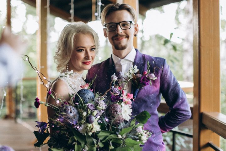 Мы решили делать тематическую свадьбу, и выбрали тему космоса. Палитру составили яркую: малиновый, фиолетовый, синий и серебристые акценты для звезд. К нашим образам решили подойти нестандартно: ткань для пиджака жениха я красила вручную, а в мой букет, помимо цветов, декоратор добавила маленькие светящиеся звездочки и планеты.
