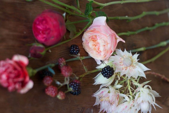 Задумка продиктовала выбор цветов. С ягодами рубуса мы определились сразу, они должны были стать украшением торта. В тон к насыщенной бордовой ежевике была выбрана роза Piano Frieland. Дополнила ансамбль роза Vuvuzela, в серединке она словно узор «звездочка» из крема. Осталось добавить полутона из диантуса и контрастный белый от брунии blushing bride. По нашей традиции, завершает композицию эвкалипт.