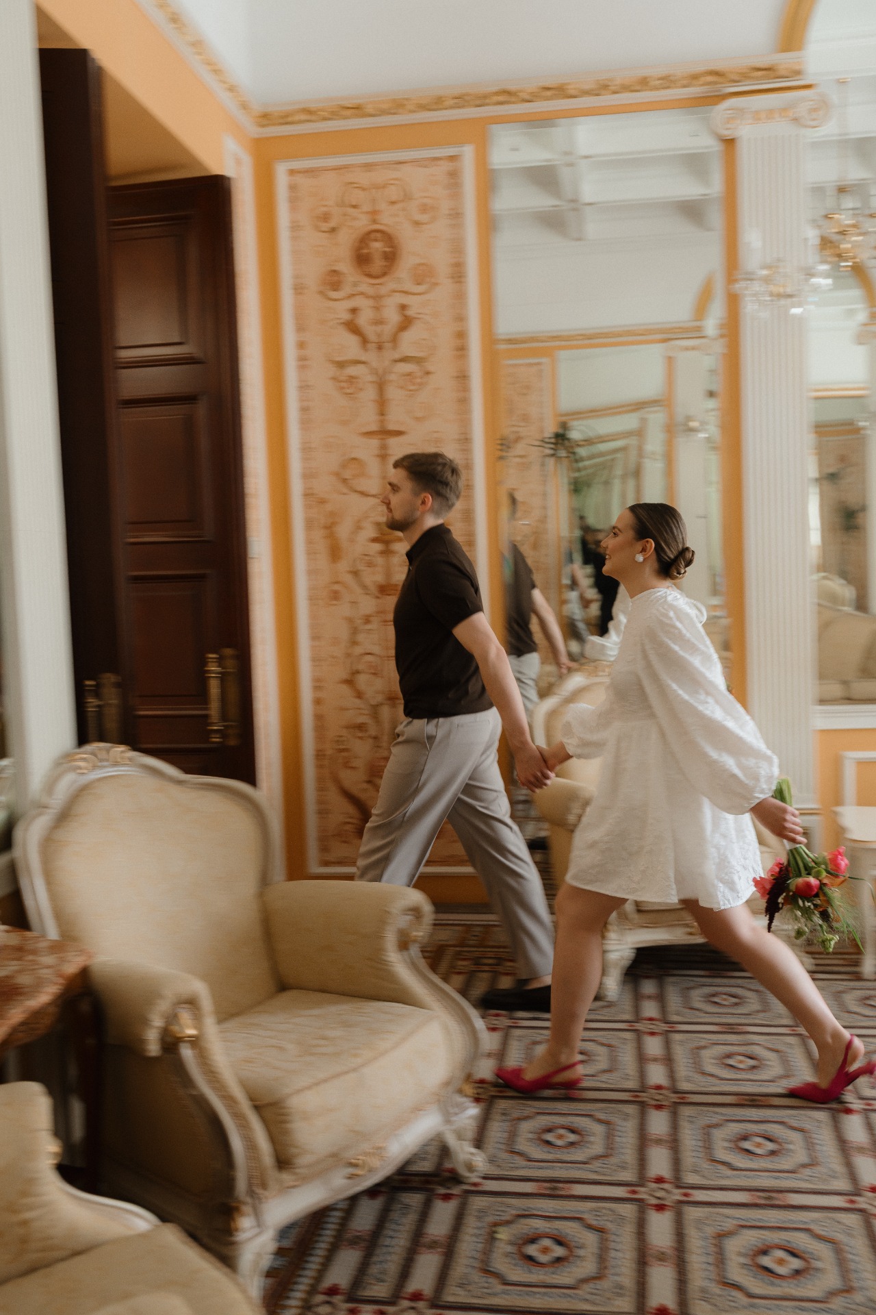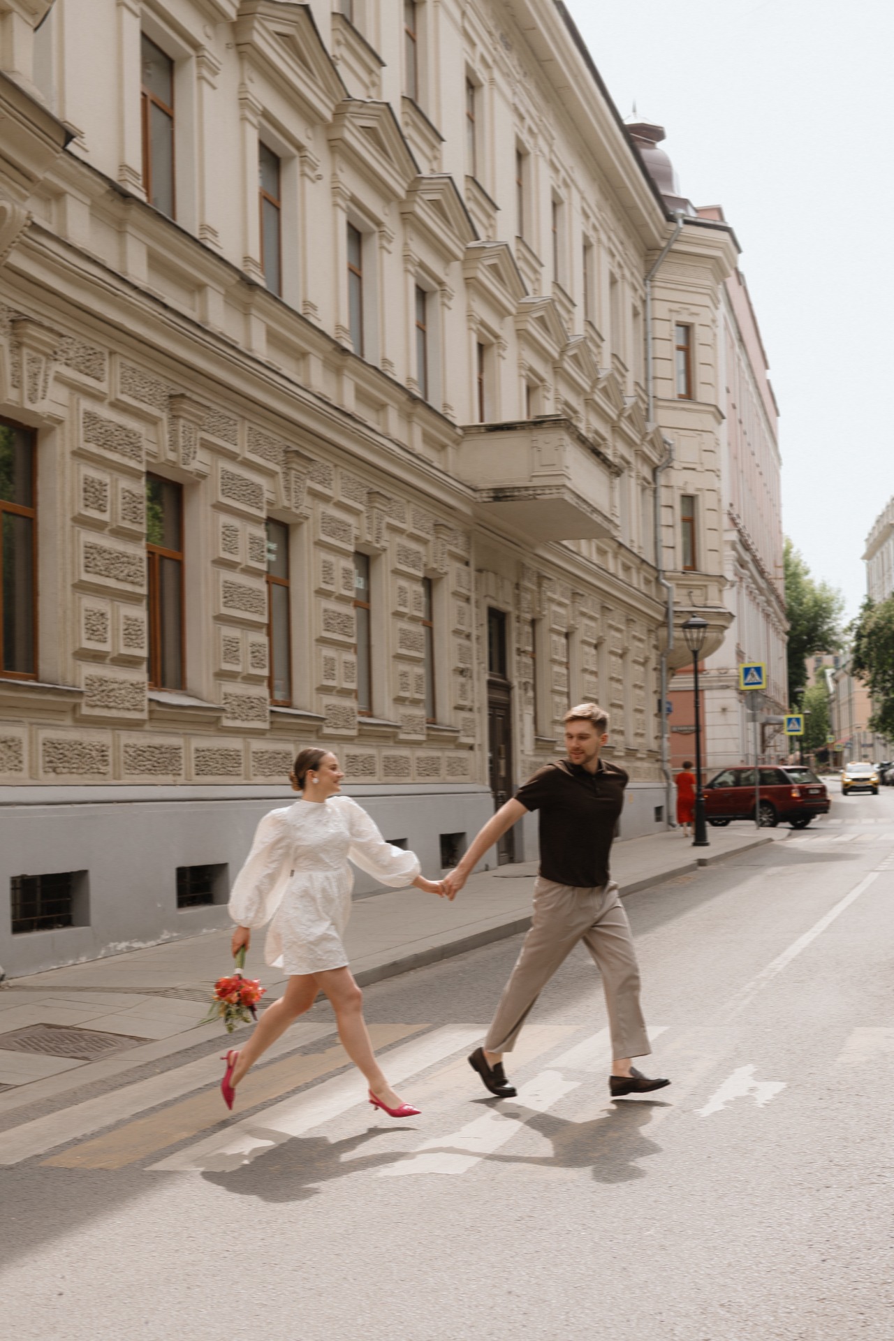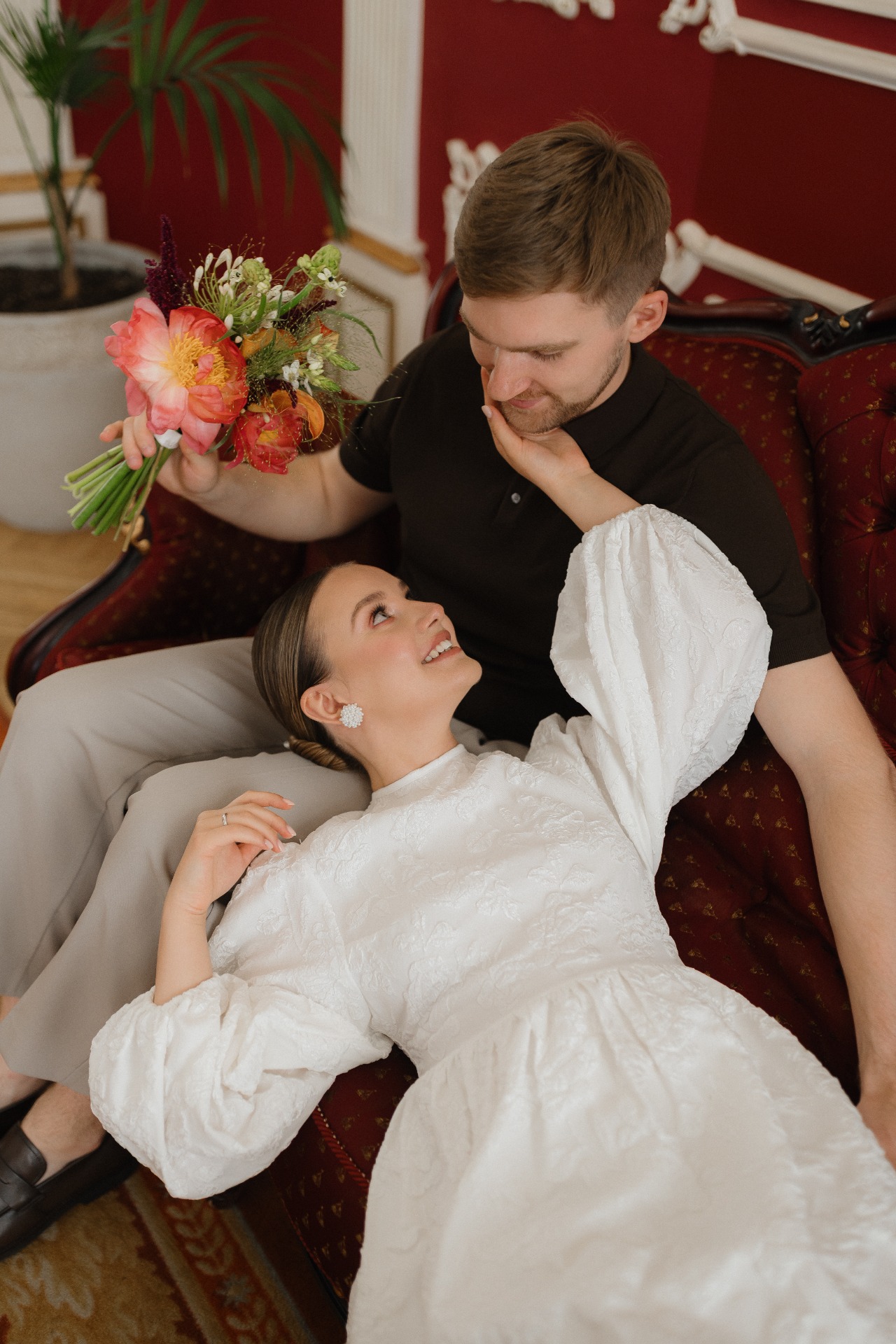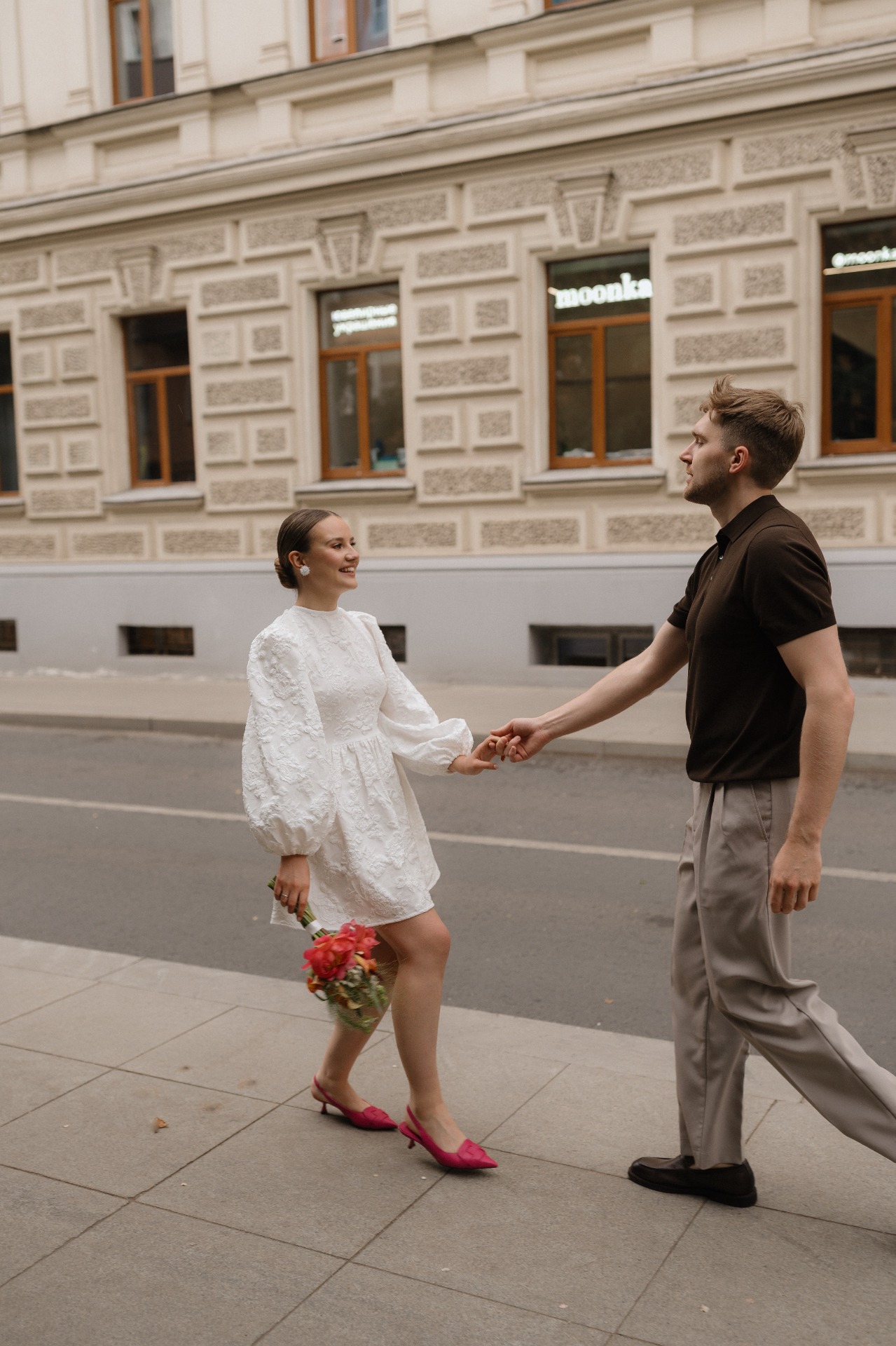На роспись в ЗАГС я выбрала короткое платье от бренда Top Top и дополнила его яркими босоножками и дерзким, сочным букетом. На Тёме в этот день были светлые брюки и коричневая рубашка-поло с коротким рукавом.