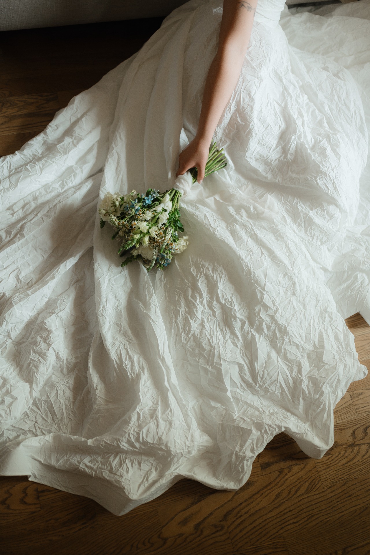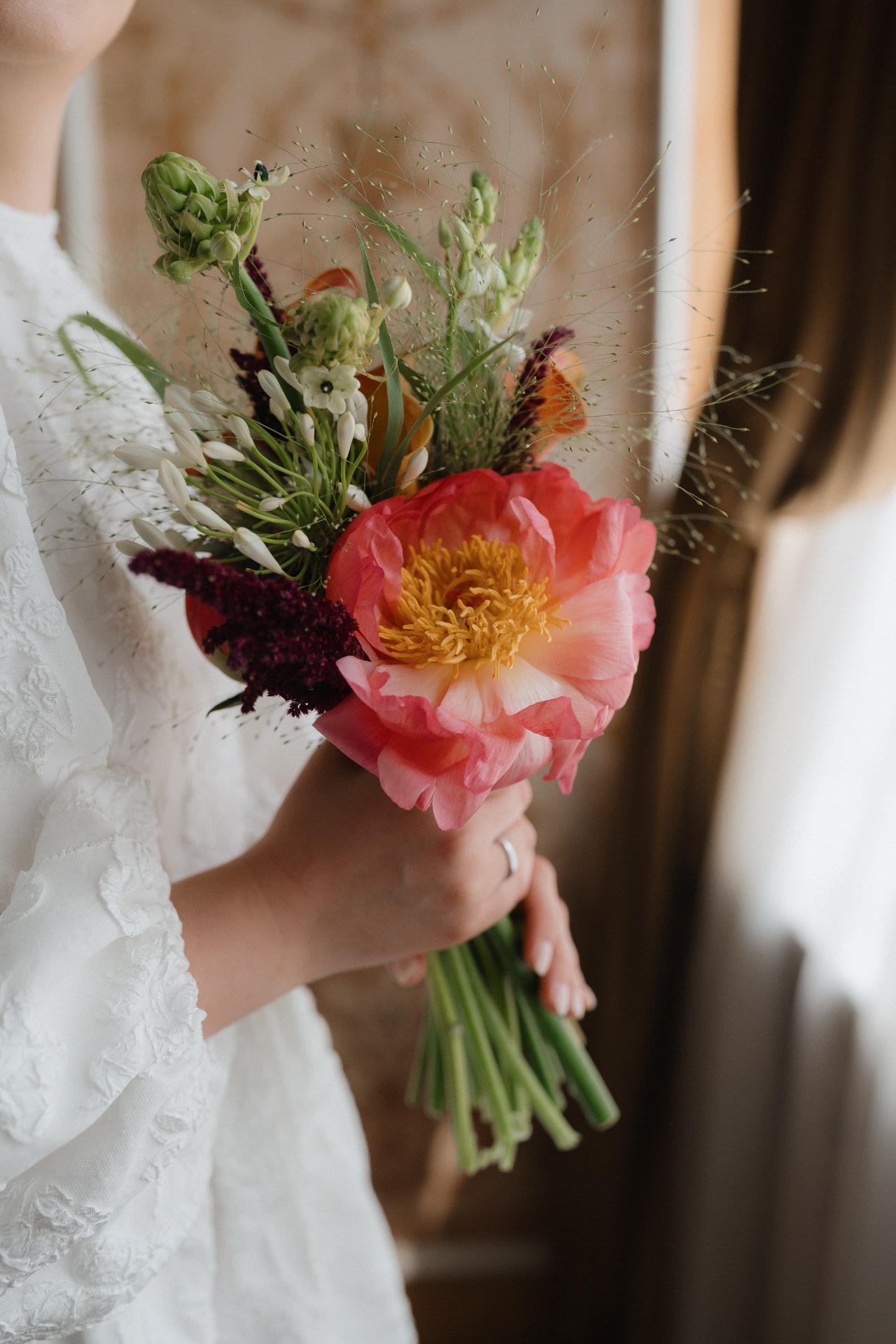 На свадьбе мне хотелось выглядеть более торжественно, но в мыслях я всё равно сохраняла образ, который отражал утончённость, нежность и лёгкость. Пайеткам, блёсткам и длинному шлейфу я сразу сказала нет.