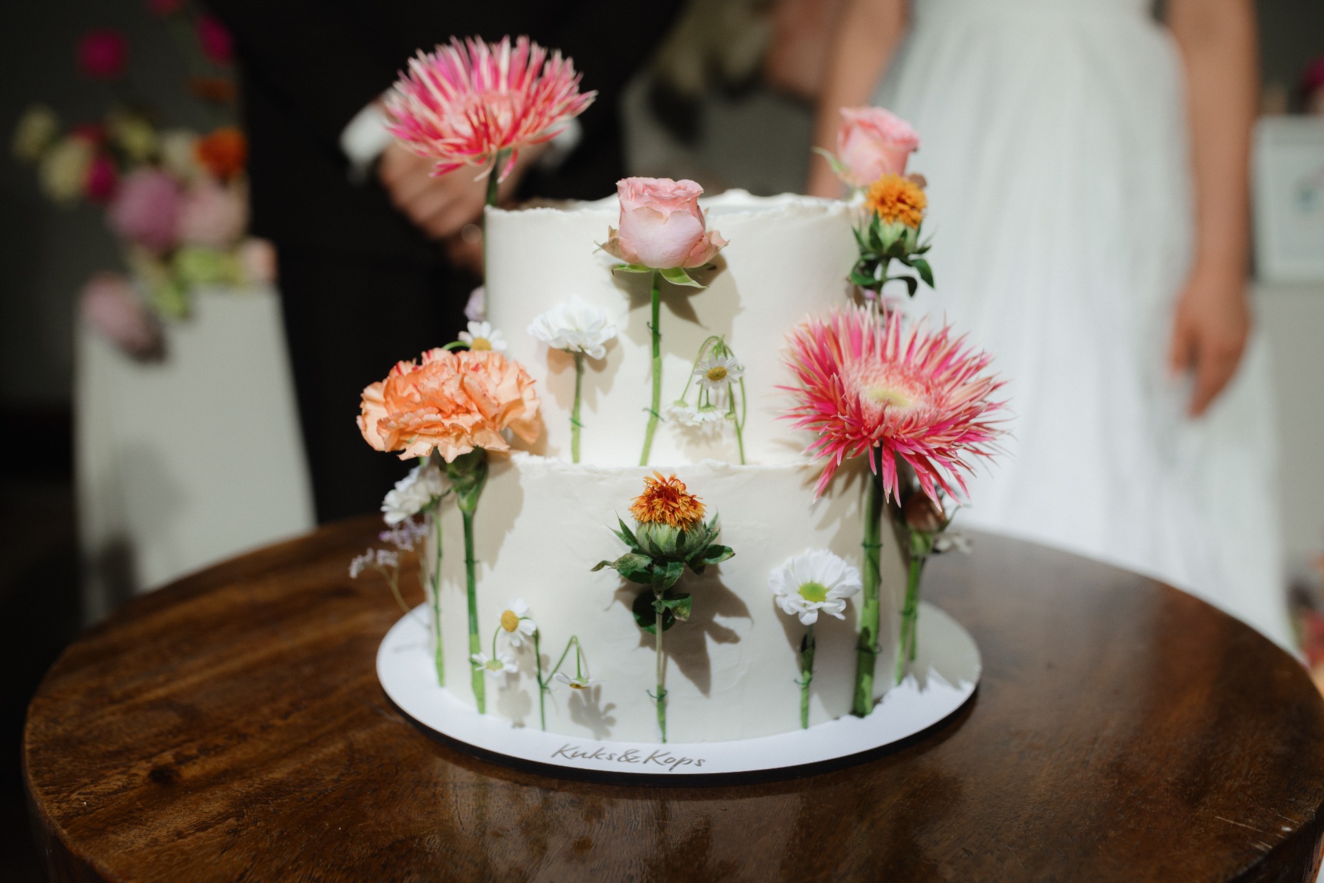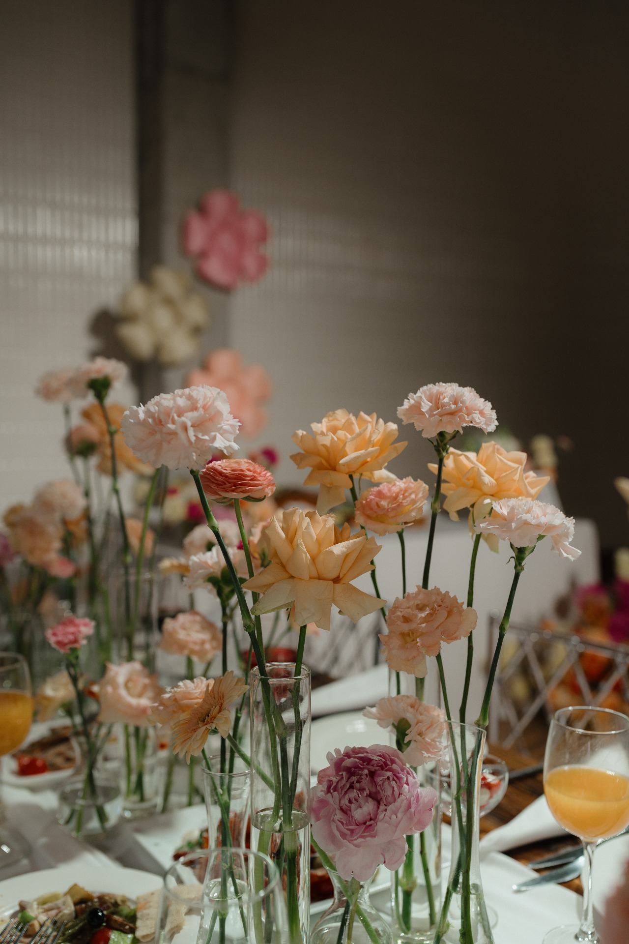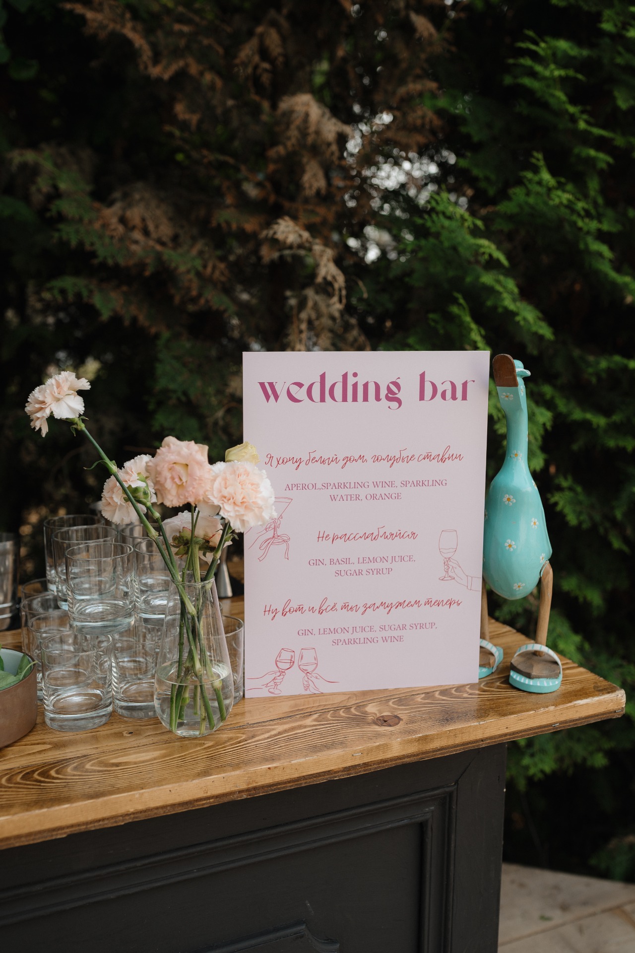 В основу палитры и декора легли нежные оттенки розового, жёлтого, оранжевого и зелёного цветов. Живые цветы, длинный деревянный стол, необычные детали в декоре, элегантная простота без лишней нагрузки — всё это полностью отразило наш день так, как мы его и представляли.