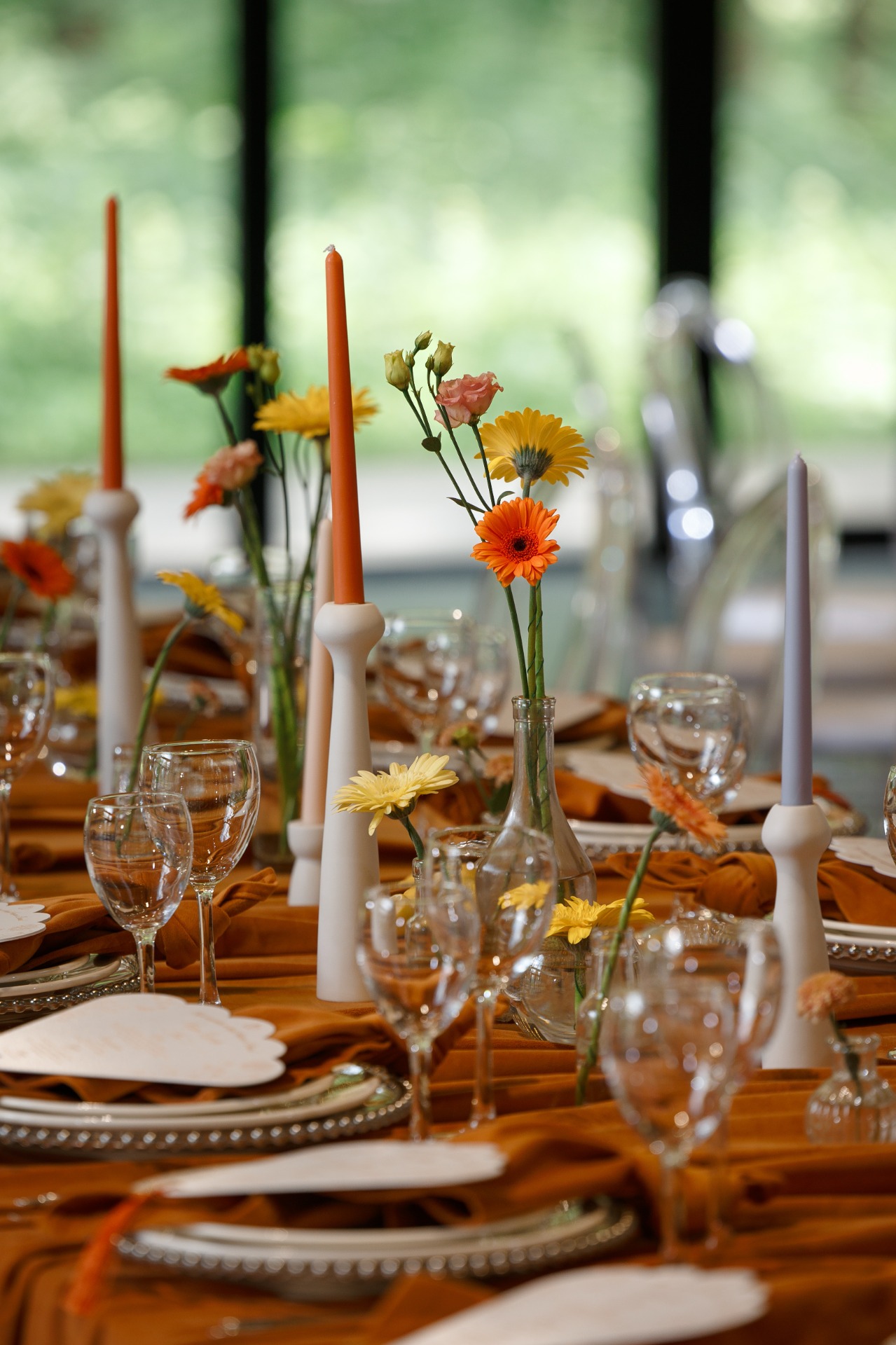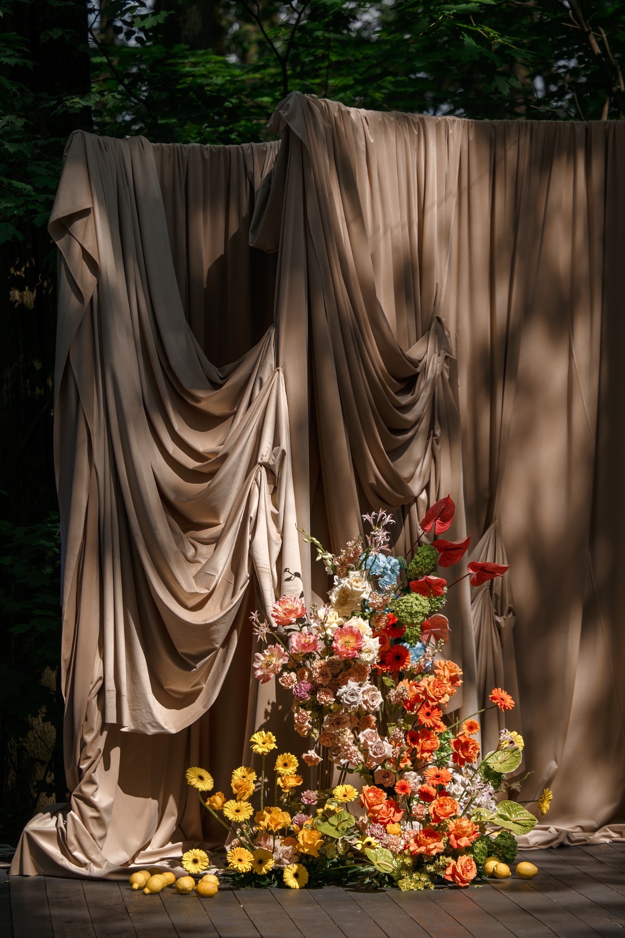 Декораторы воплотили идею визуально: палитра сочетала глубокий рыжий, голубой и пастельные оттенки. Композиции из лимонов, цветов и тканей создавали лёгкость и тепло. Микс столов — длинный по центру и круглые по бокам, подчёркивал динамику и многослойность испанской культуры.