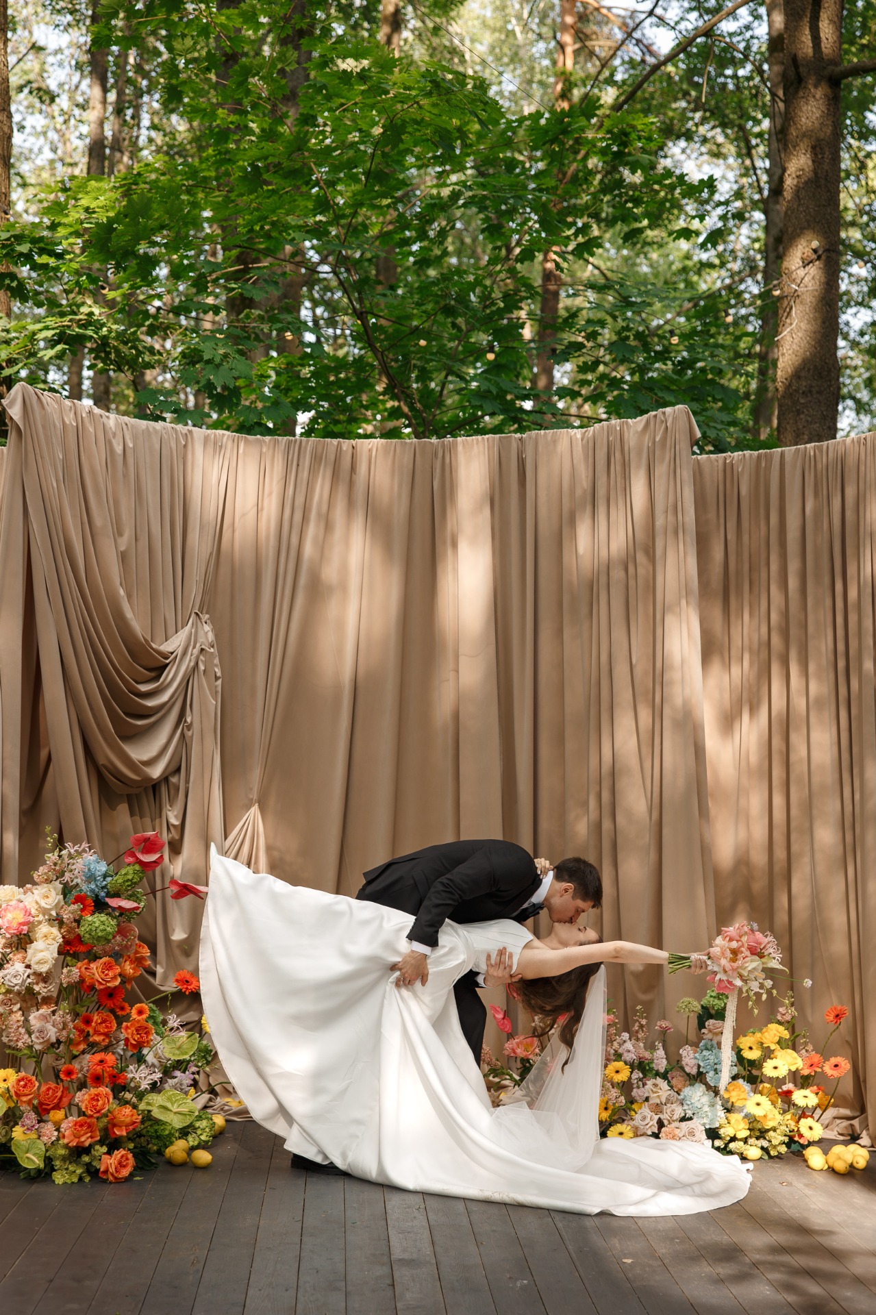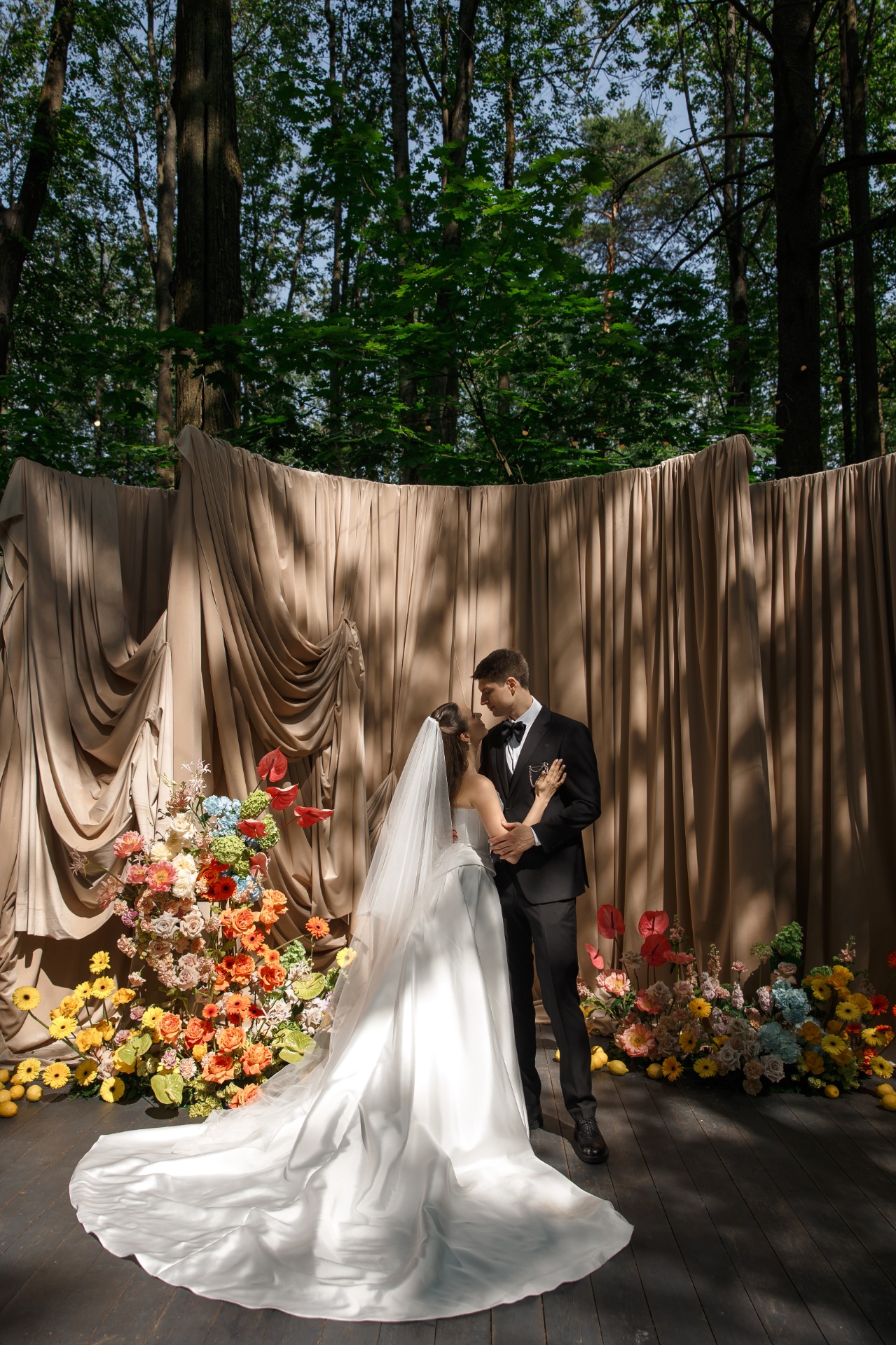 Церемония была необыкновенной: солнце озаряло драпировки, вокруг словно исчезал весь мир — оставались только мы и наша любовь. Каждая улыбка и слеза радости навсегда остались в памяти.