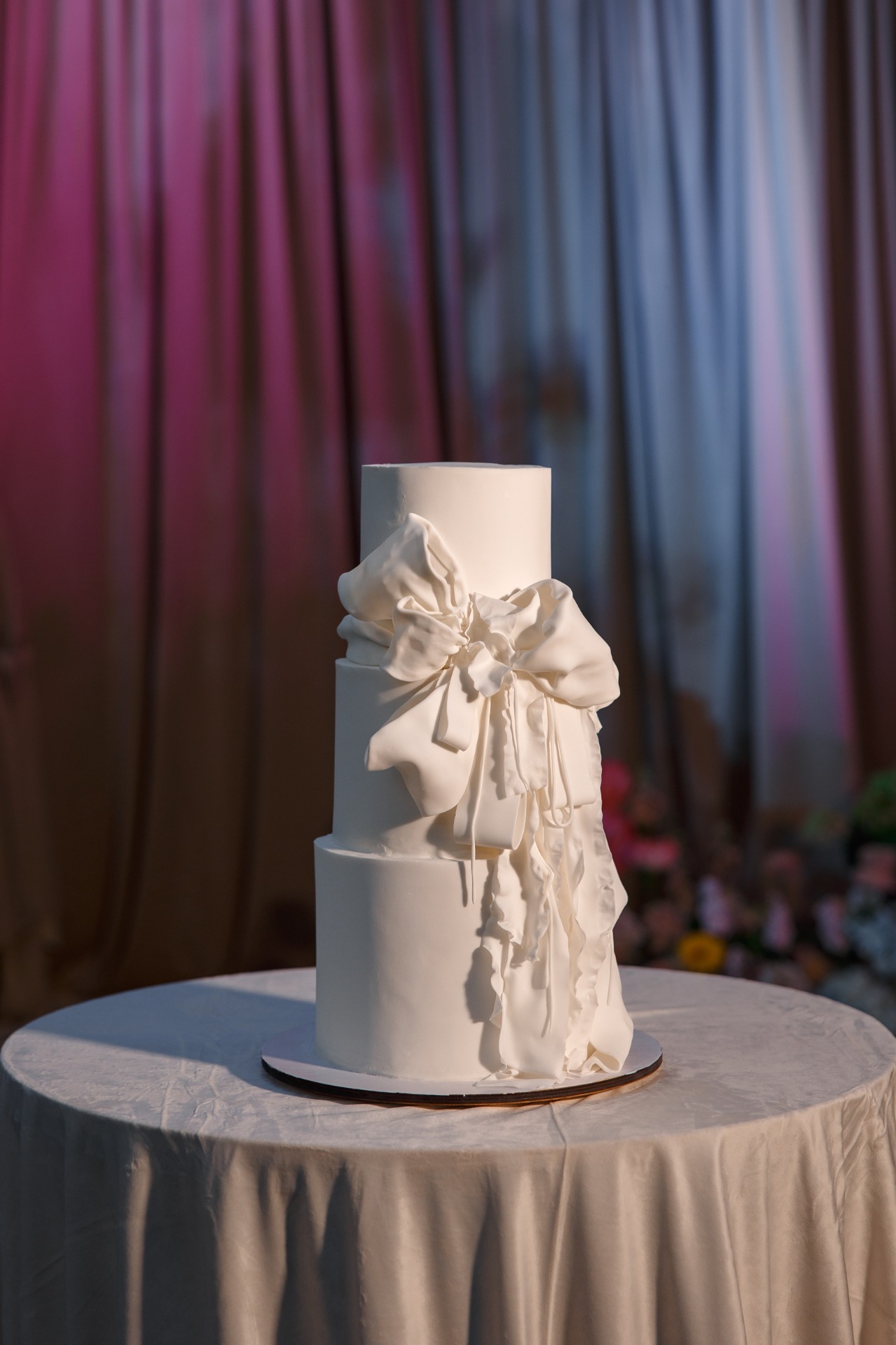 Даже торт перекликался с драпировками церемонии, а туман и холодные фонтаны при подаче добавили эффектный финальный штрих. Вместо традиционного каравая мы подали чурросы — тёплый и искренний символ Испании.