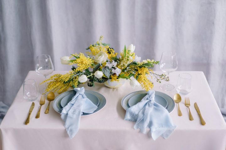 В качестве моделей мы пригласили Катю и Влада, это настоящая пара, очень открытые и эмоциональные ребята. Мы закупили просто огромное количество мимозы и много других весенних цветов, подготовили детали и посуду, а еще нам сделали потрясающую каллиграфию, нежную и воздушную как и вся наша съемка. И стали ждать дня X.