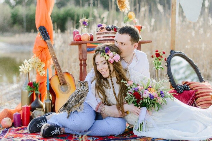 Мы могли отойти от классики и создать съемку яркой, но в то же время естественной и нежной. Нам понравилось место будущей съемки — заброшенный пустырь около озера — оно было как чистый лист, который можно разрисовать любыми красками. Особое внимание уделялось деталям. Яркие цветы, фрукты и разноцветные стеклянные баночки хорошо выделялись на фоне высохшей травы. Разнообразие текстур и цветов в декоре дополнили наши влюбленные, образ которых был нежным и чувственным.