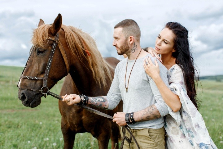 Концепция съемки — свобода духа и свобода эмоций! Главным акцентом в декоре стала самодельная кибитка, в которой по замыслу наши герои странствовали по земле, это был их маленький дом, где сплелись природа (занавески из живых цветов) и страсть к путешествиям.