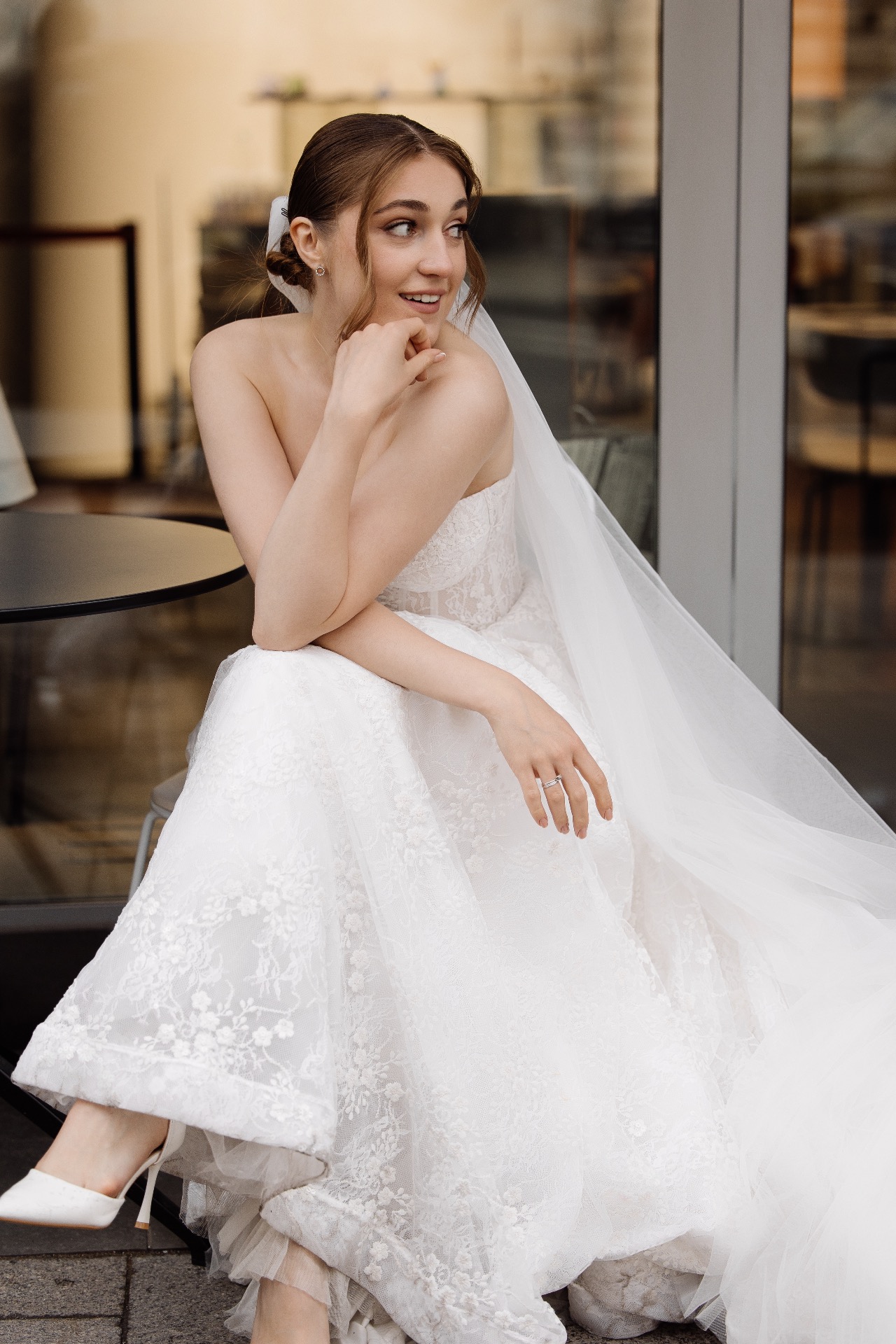 Для себя я выбрала платье А-силуэта — пышное, но в меру, полностью кружевное. Изначально я была уверена, что я остановлюсь на модели «русалка», но в процессе примерок и поисков стало ясно, что именно это платье и есть то самое.