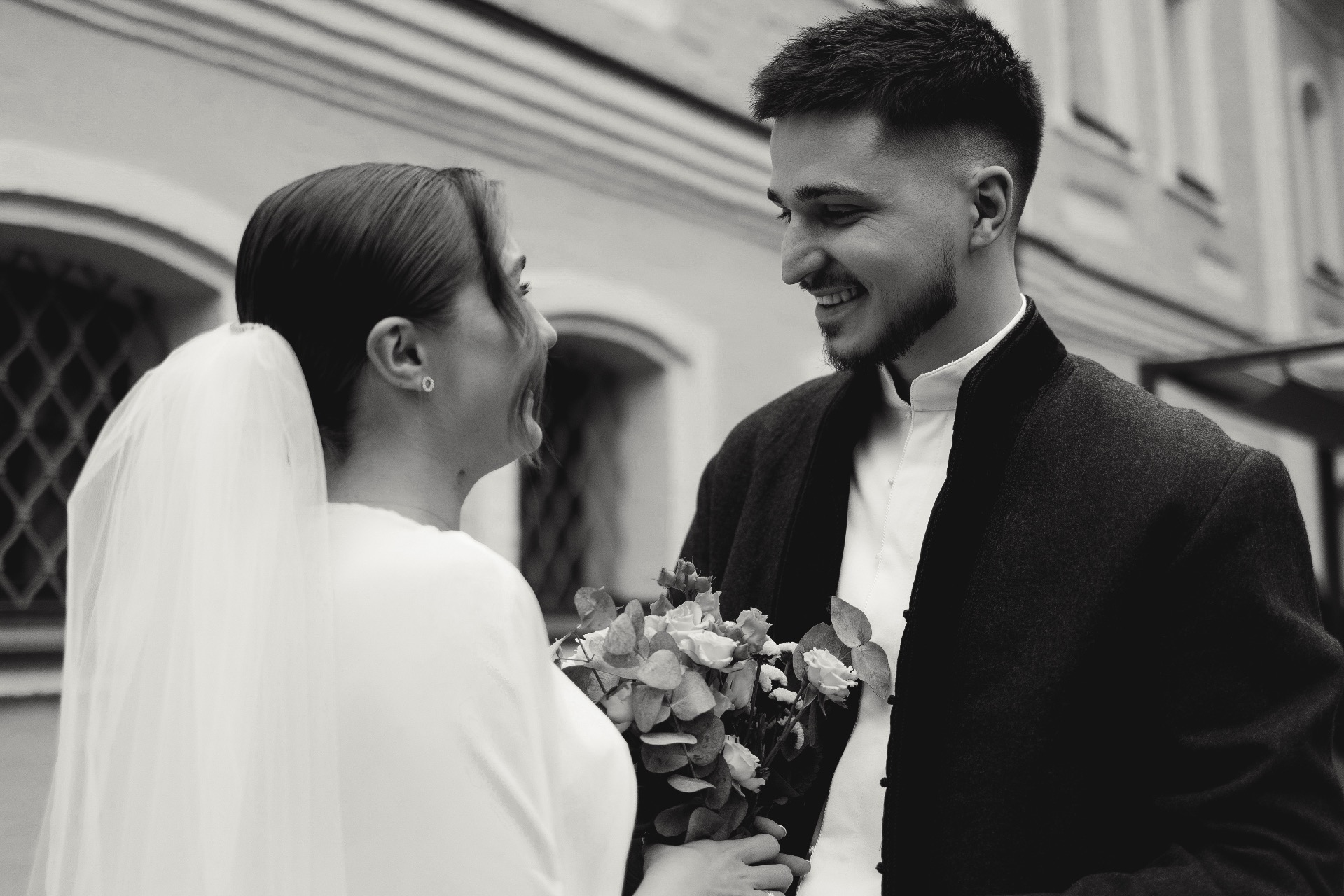 Образ Пети тоже получился классическим, но с характером. Рубашку с воротником-мандарином ему привезла из Парижа жена брата, и эта деталь делала образ особенным. Лацканы пиджака были нестандартными — с прямым отложенным воротником под рубашку. Костюм из плотной, почти шерстяной ткани дополняли замшевые вставки и подобранные в тон туфли. Это была единственная деталь, которую я видела до свадьбы.