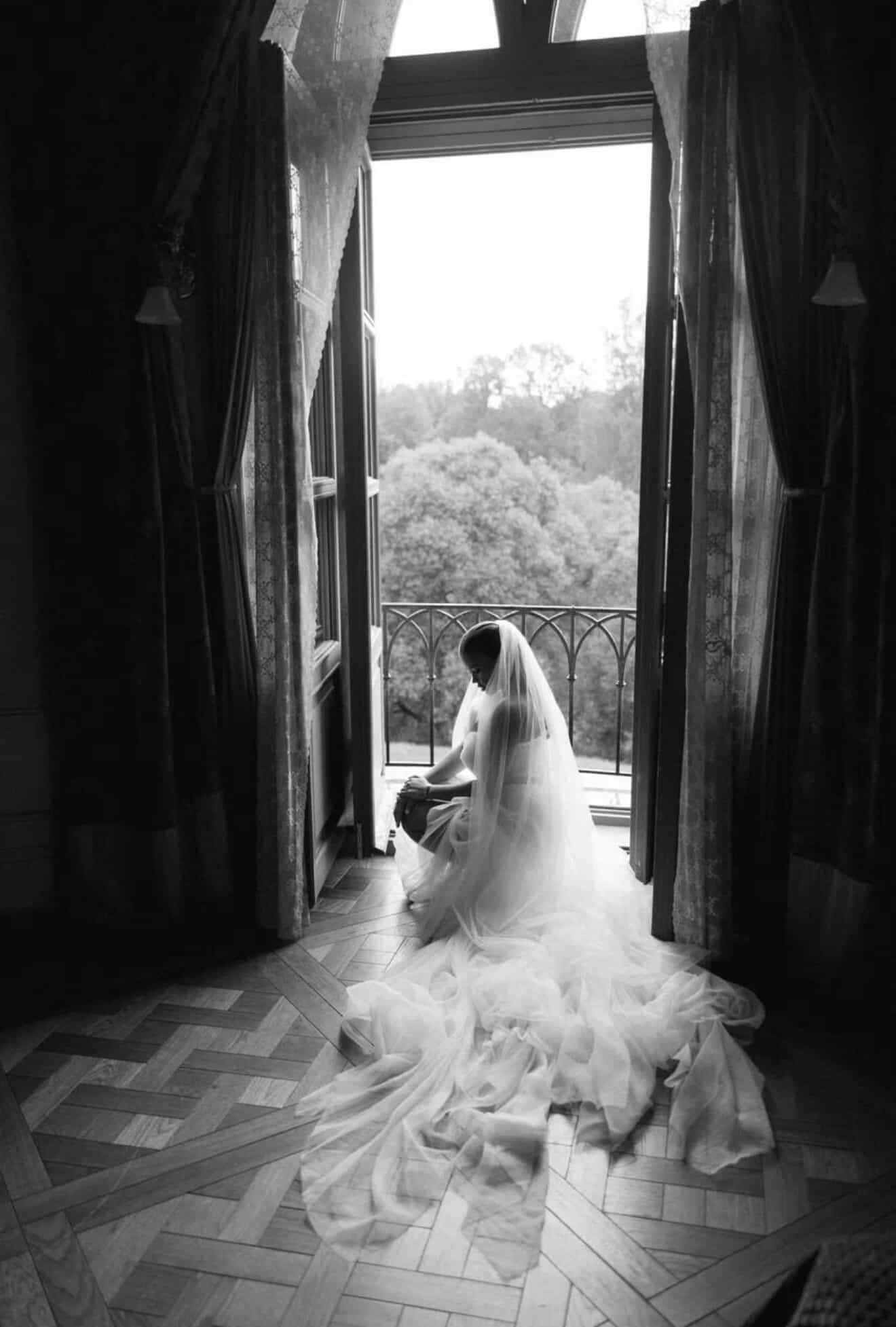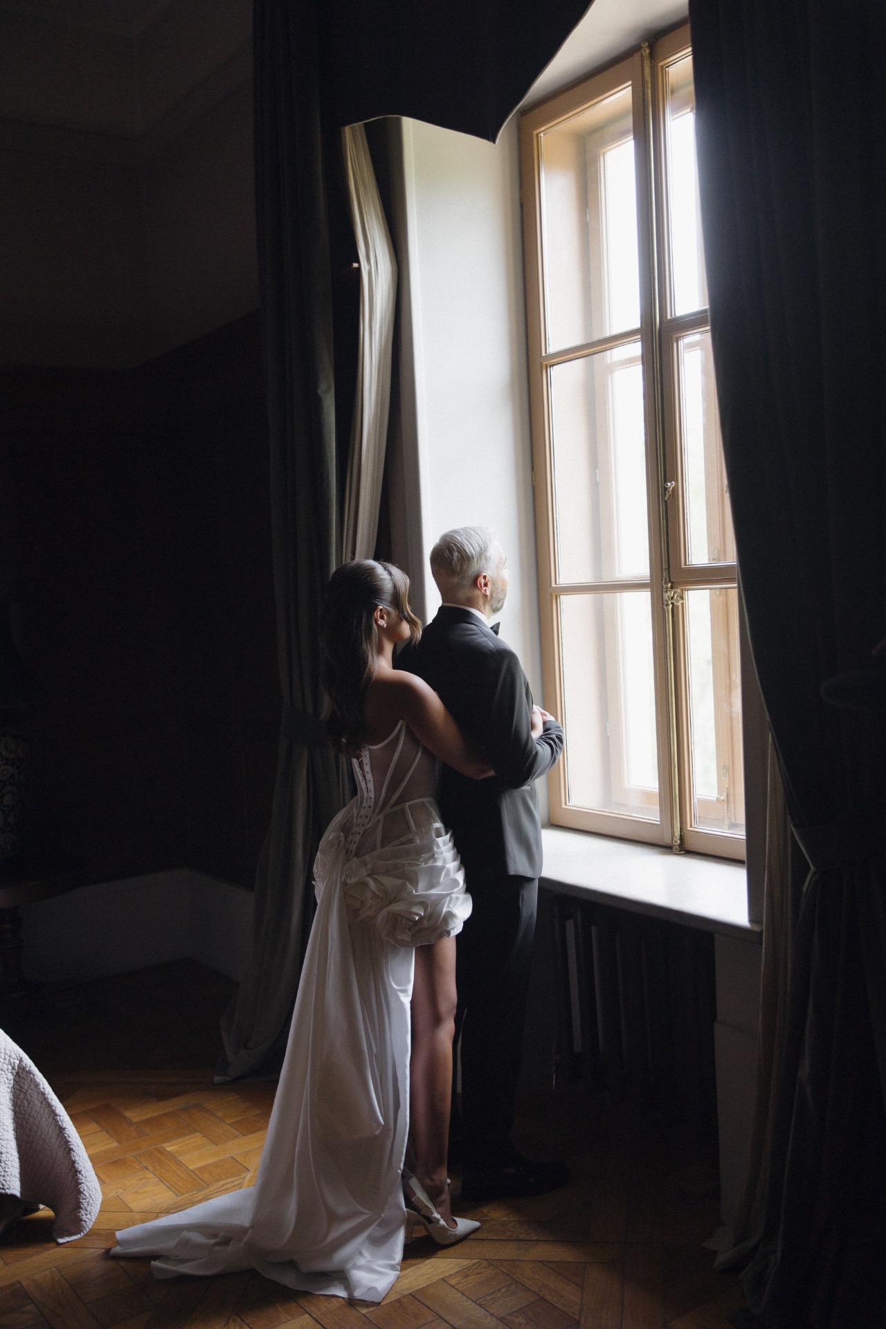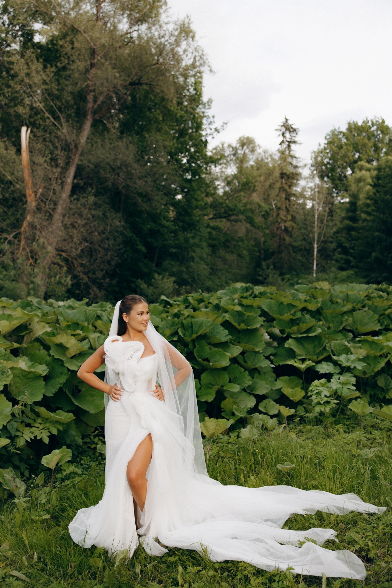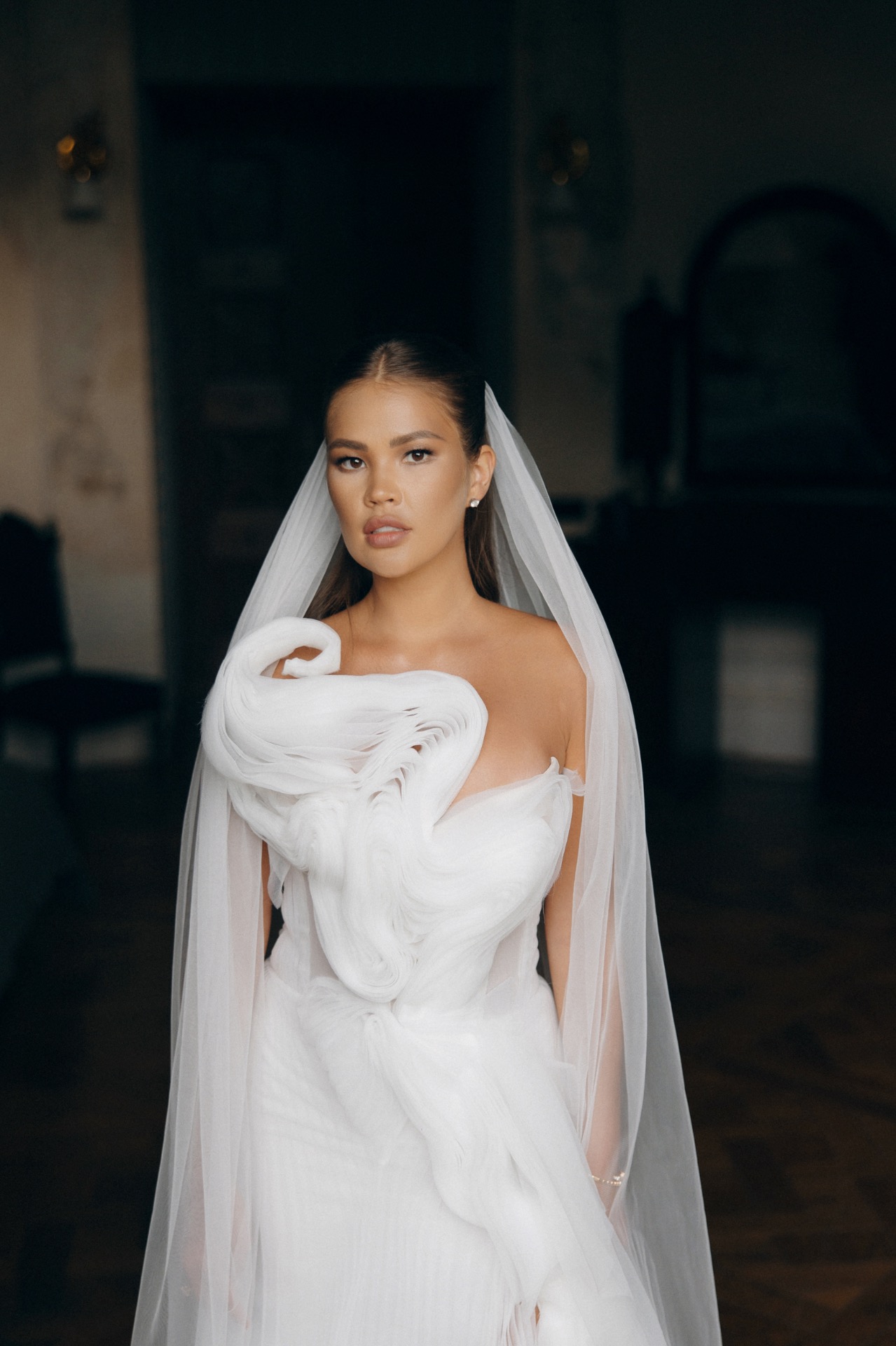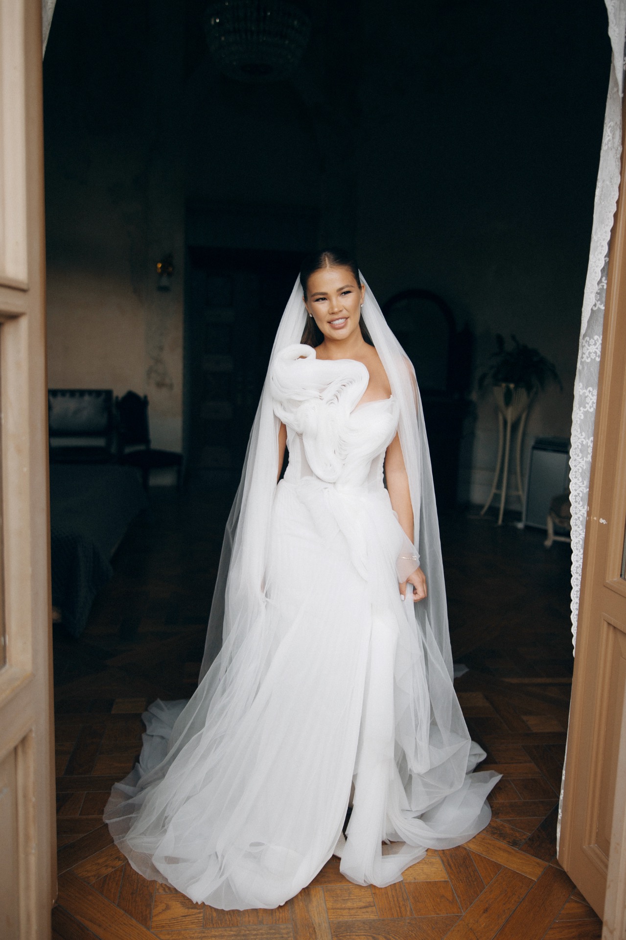 Для меня это был путь от мечты к реальности: первый образ для церемонии — платье Lana Marinenko Van Gogh с длинным шлейфом, плавными линиями, повторяющими стиль художника, прозрачностью и изяществом. Оно было одновременно воздушным и выразительным, чистым и художественным.