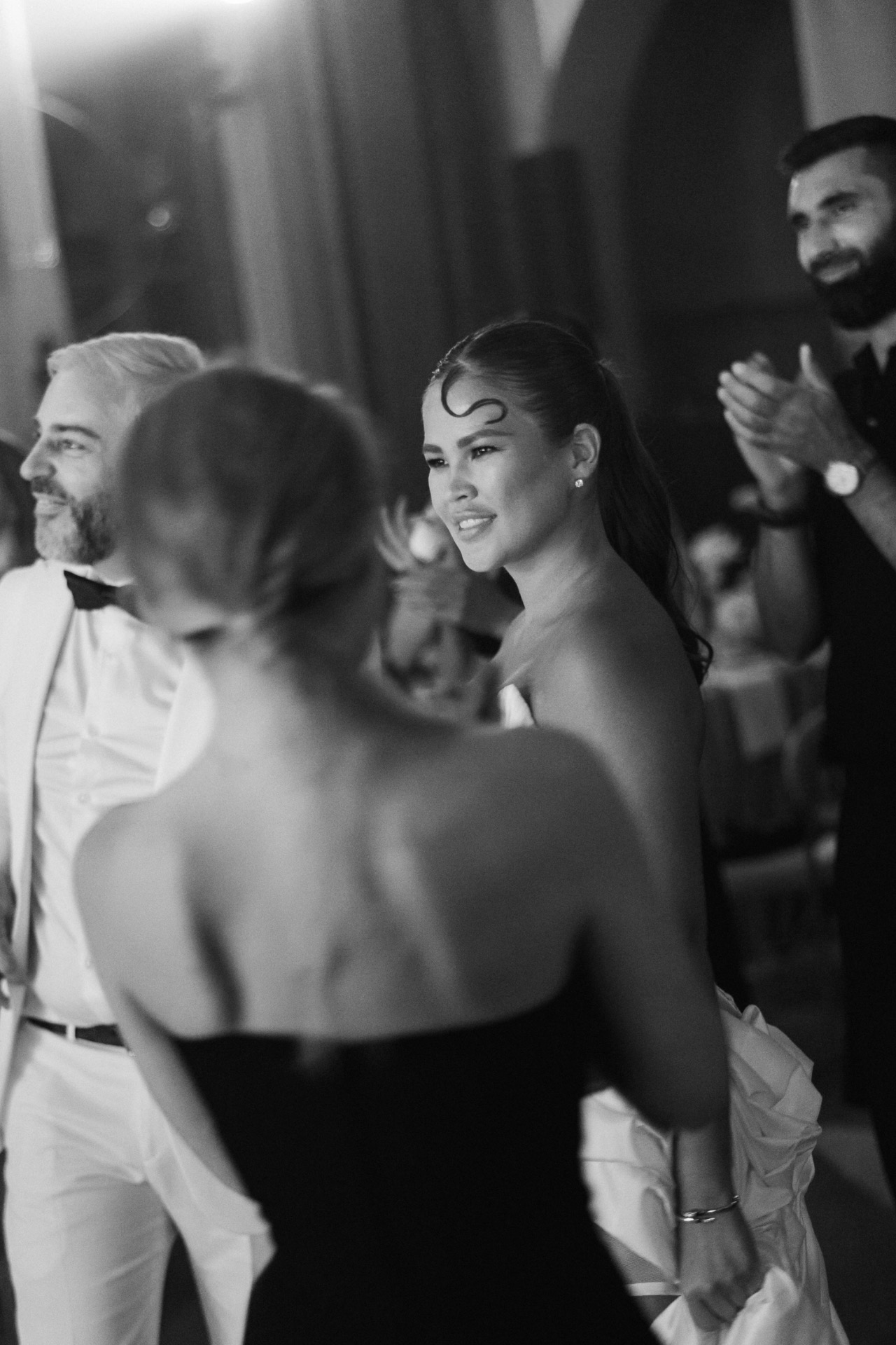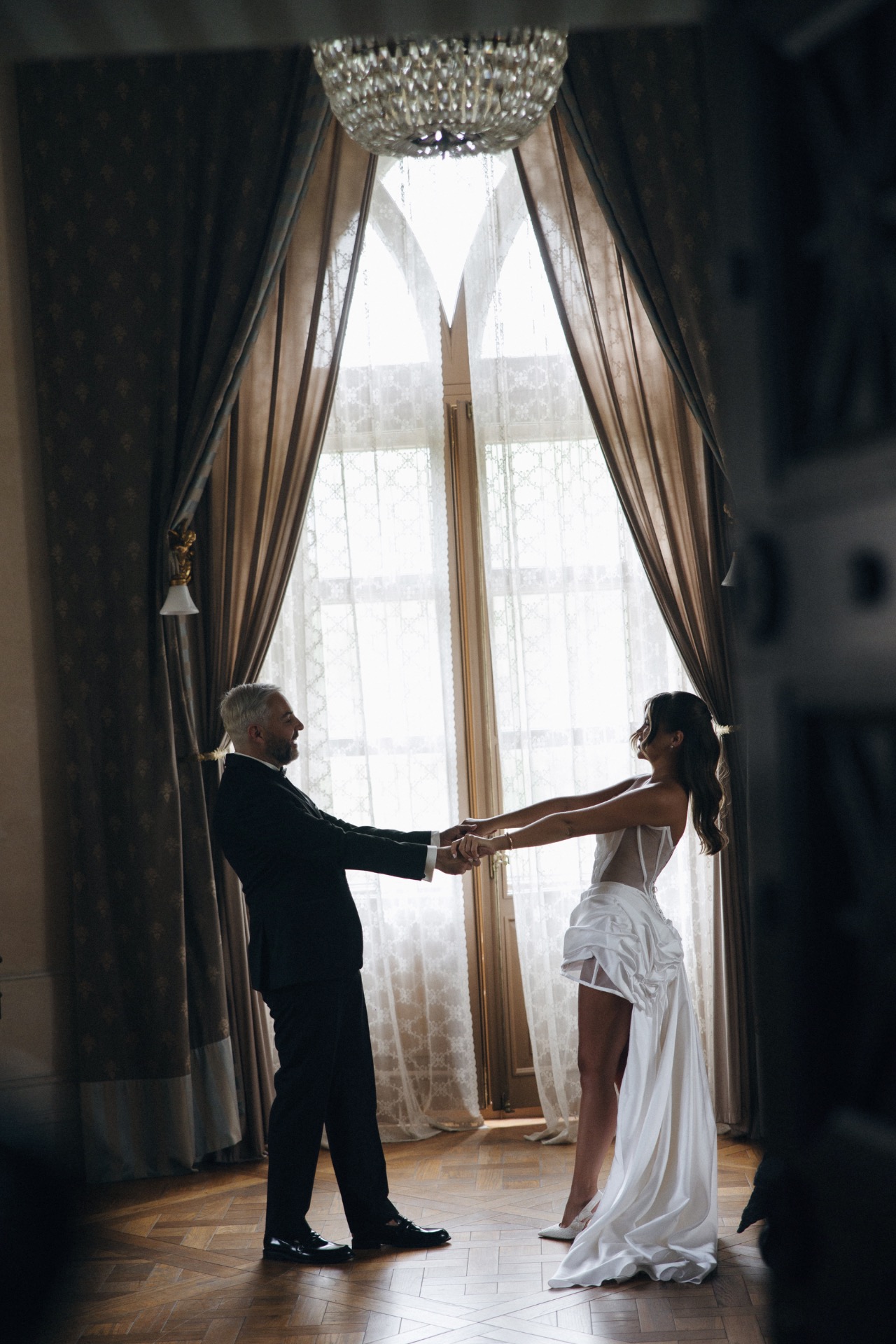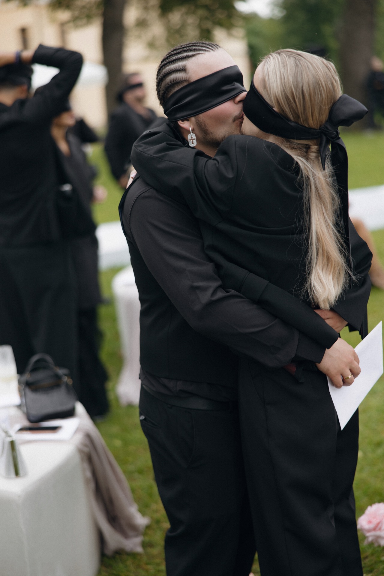 Наш дресс-код стал отдельной фишкой: все гости были в чёрном и получили чёрные повязки. В момент моей речи, которую я написала заранее, им завязали глаза. А я в это время бежала в тапочках, переобувалась на ходу в свои туфли Dior — сцена, вероятно, выглядела комично, но очень трогательно. Когда речь закончилась, гостям открыли глаза, и я уже шла по подиуму под песню Мари Краймбрери «Всё на своих местах», словно в настоящей сказке.