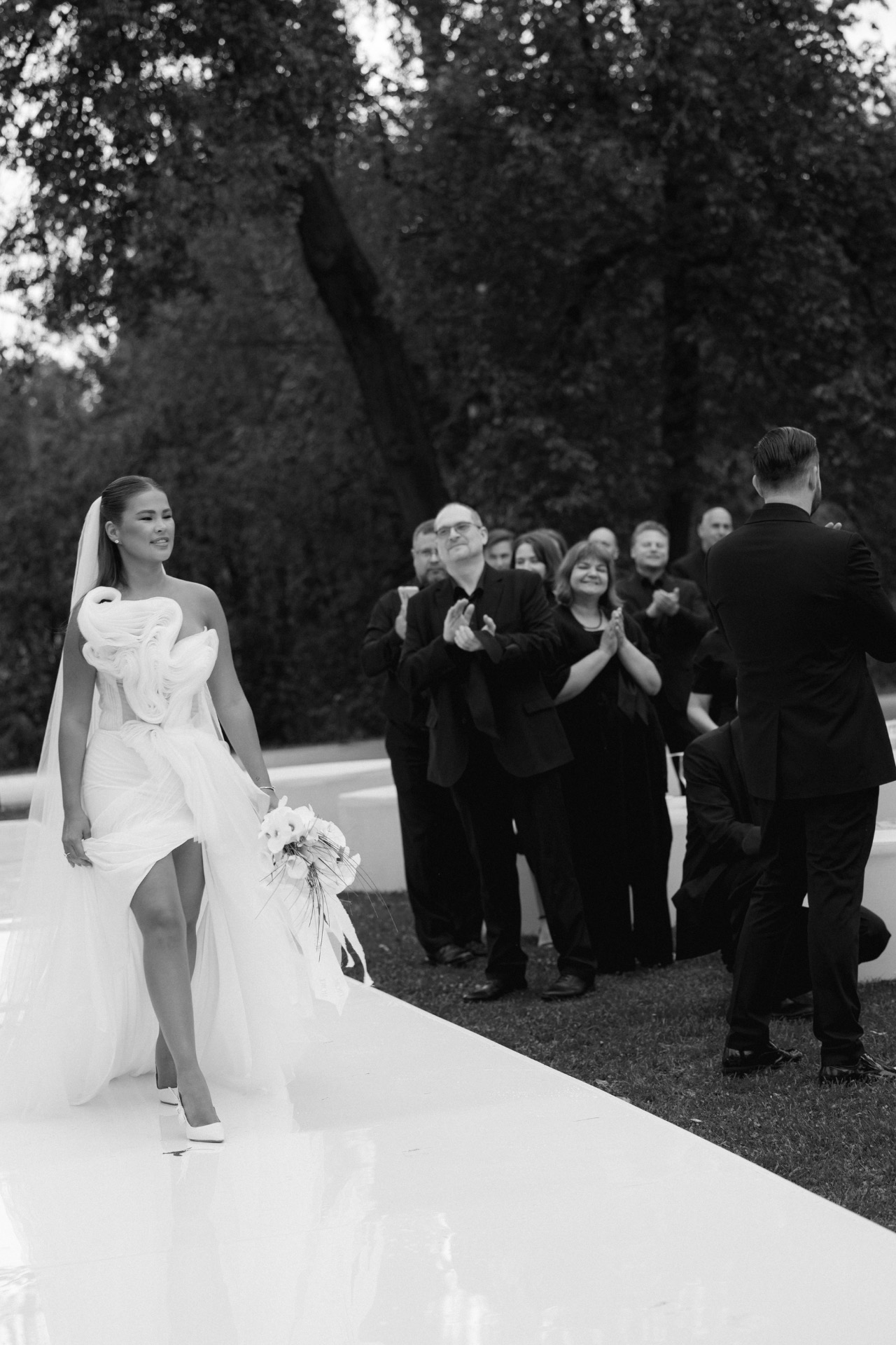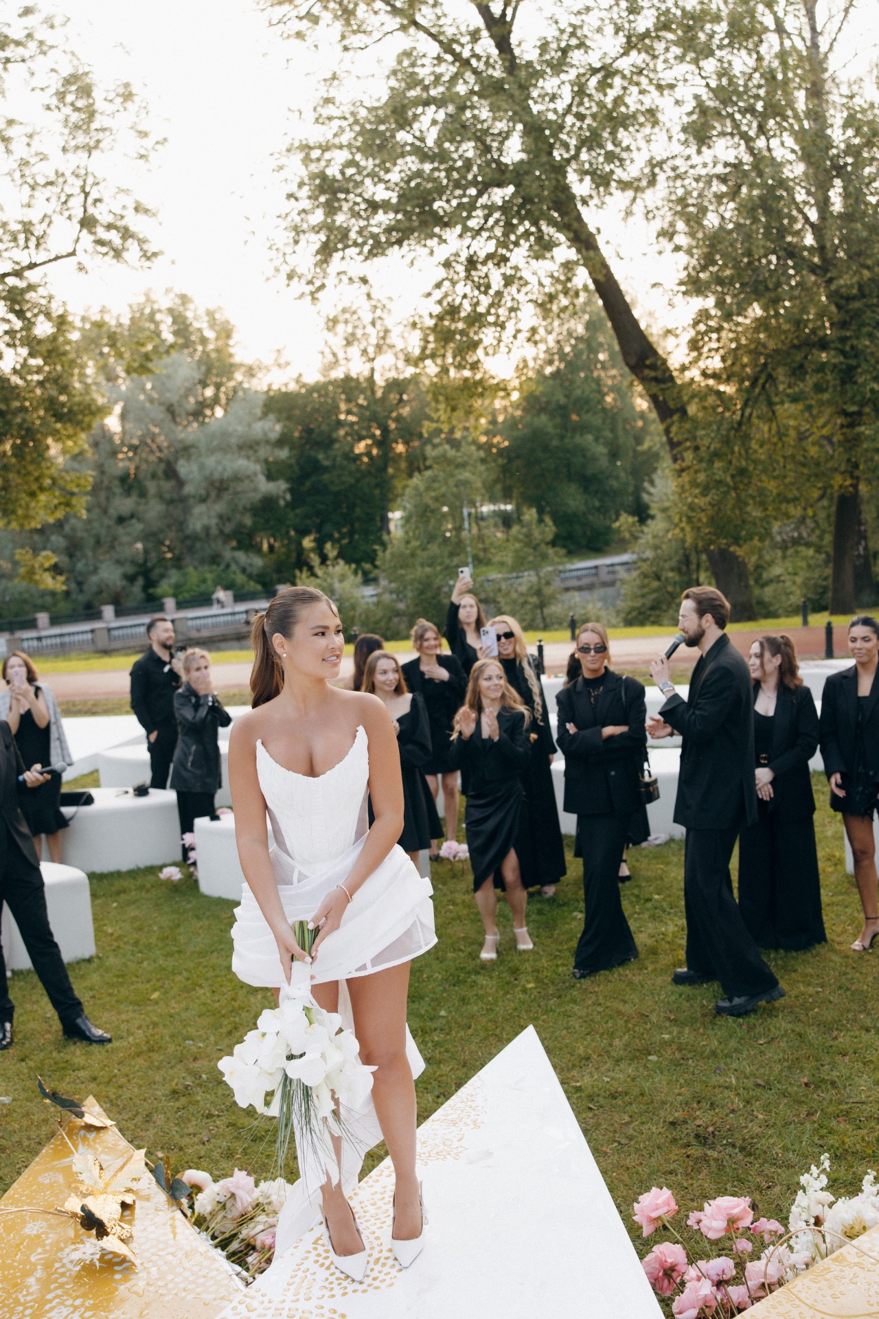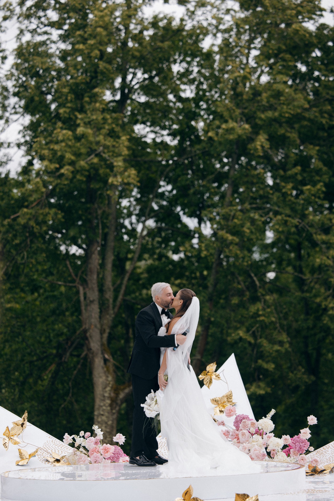 До начала церемонии пошёл тёплый дождь — гости с прозрачными зонтами выглядели словно герои кино. Всё стало ещё атмосфернее, особенно когда дождь закончился ровно к началу.