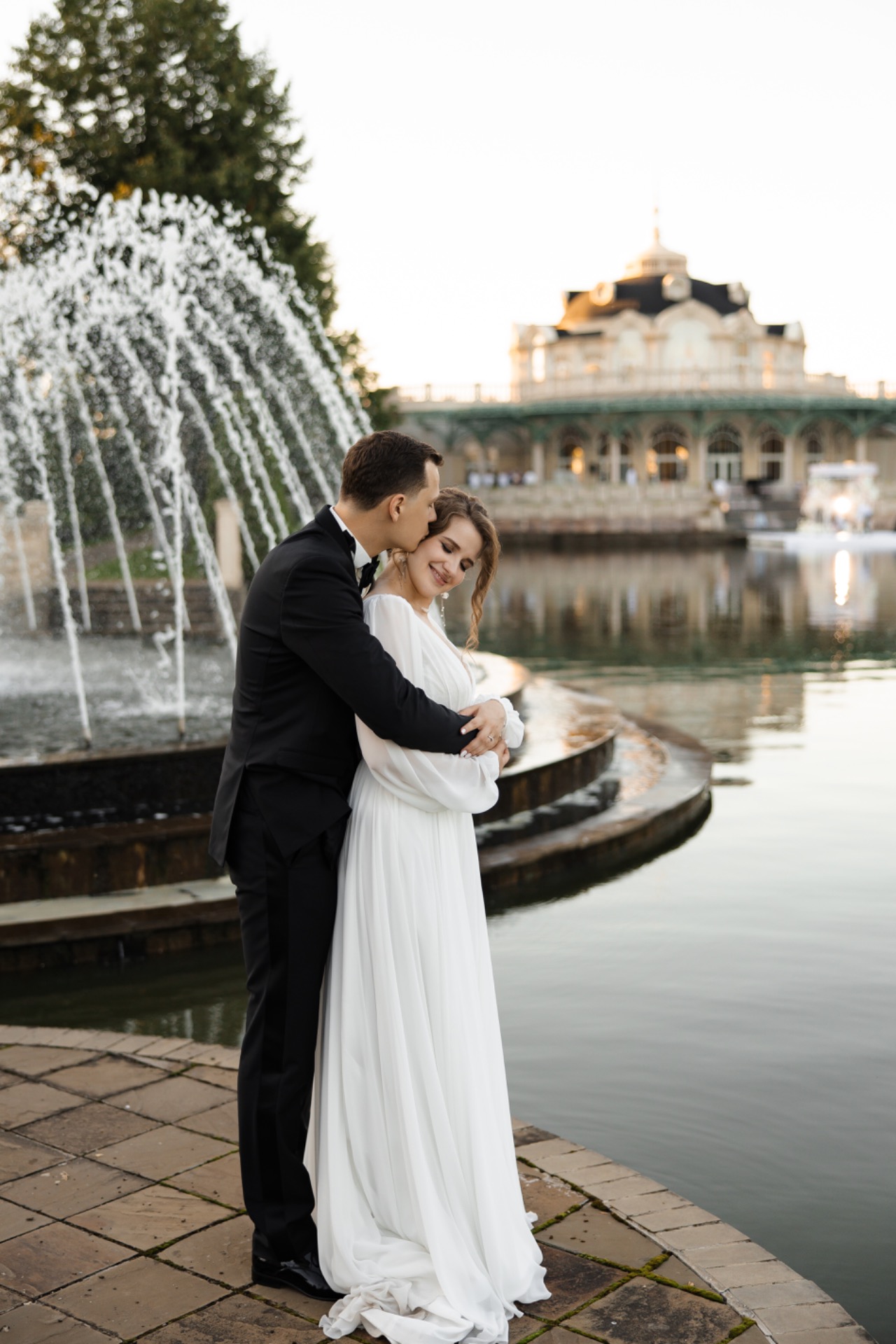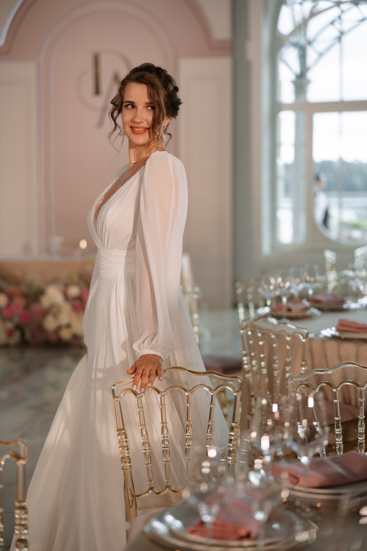 На Артуре был классический смокинг, а на мне — лёгкое воздушное платье в пол. Из-за выбранной нами сдержанной и классической концепции свадьбы образы мы подбирали так, чтобы сохранить целостность и гармонию общей картины вечера.