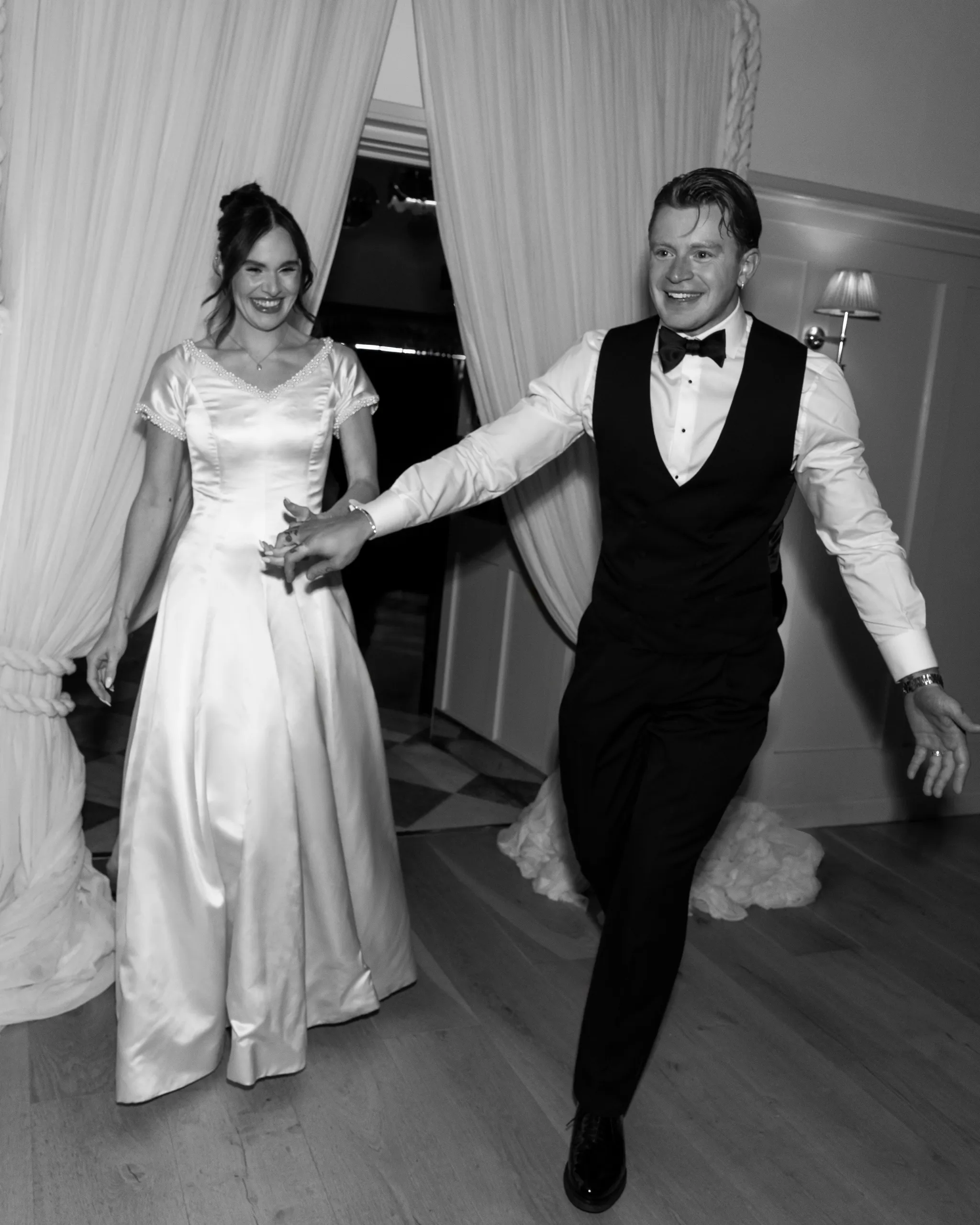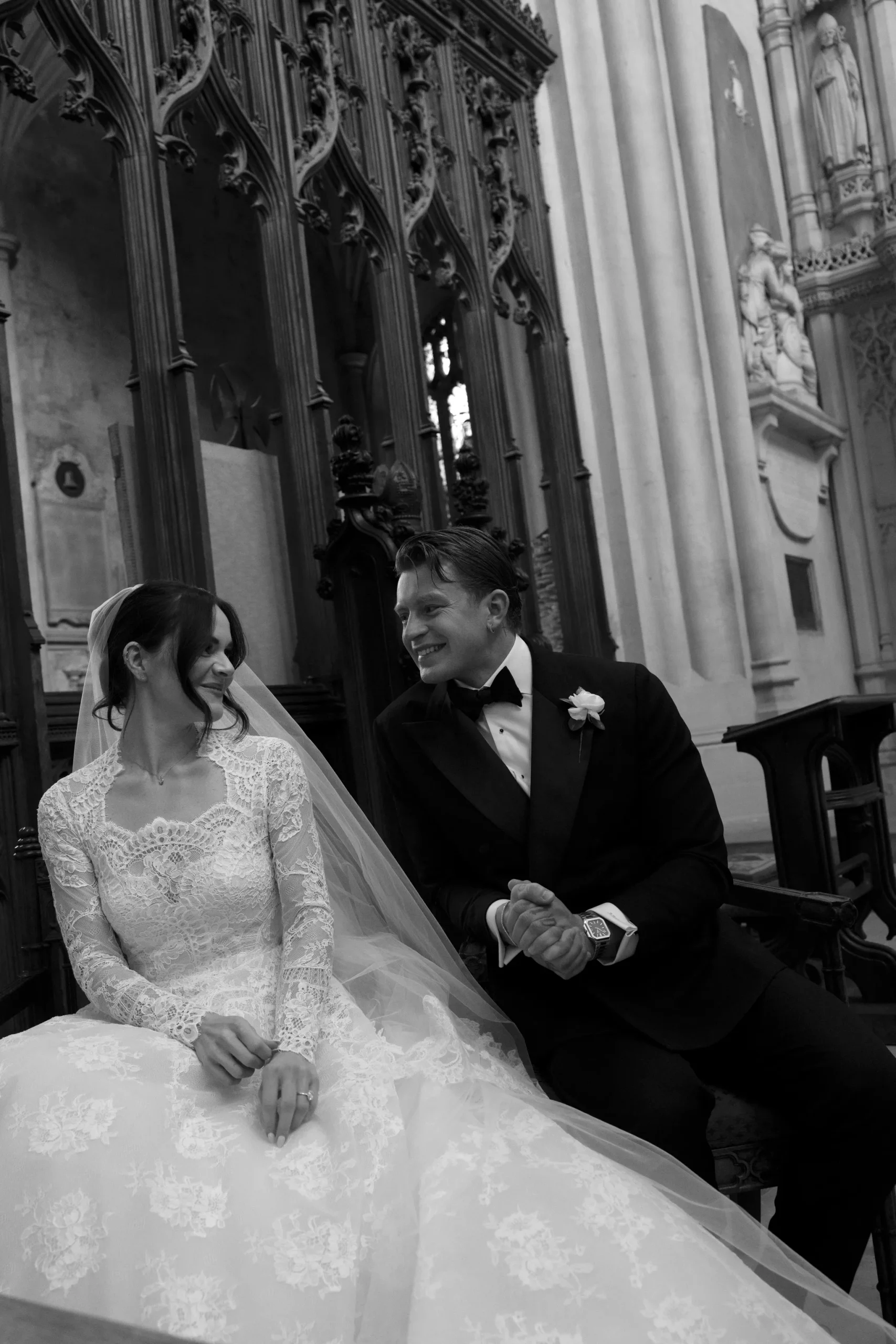 Для праздника Холли выбрала 4 свадебных платья. Первое, в котором она стояла у алтаря, было от Elie Saab. Образ дополнили туфли от Amina Muadi, которые Адам подарил ей на прошлое Рождество, кружевная фата, винтажная сумка Chanel в форме ракушки и монобукет из белых ранункулюсов от Лондонского флориста Rob Van Helden.