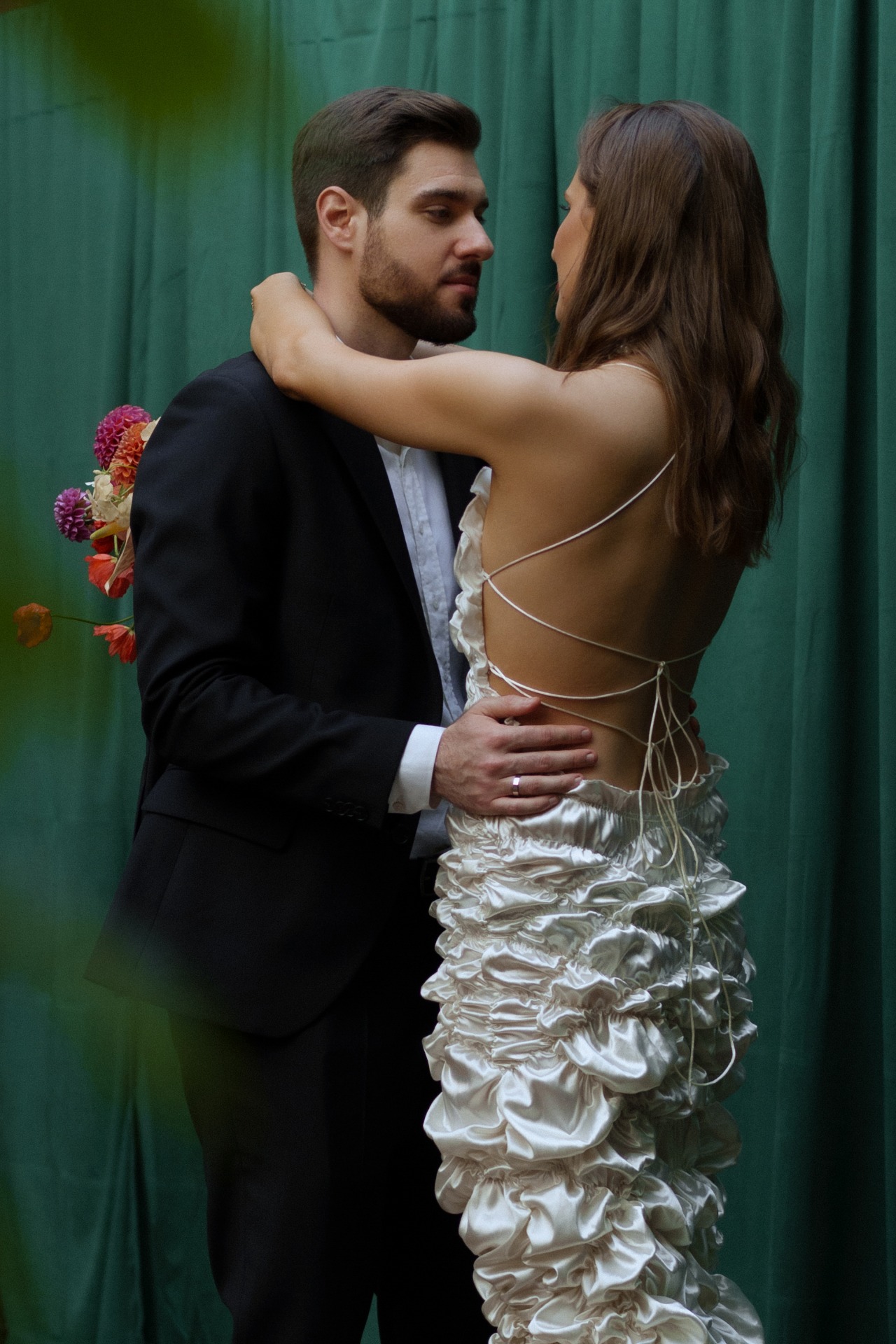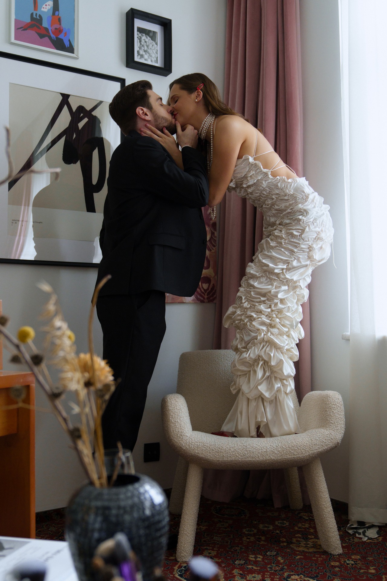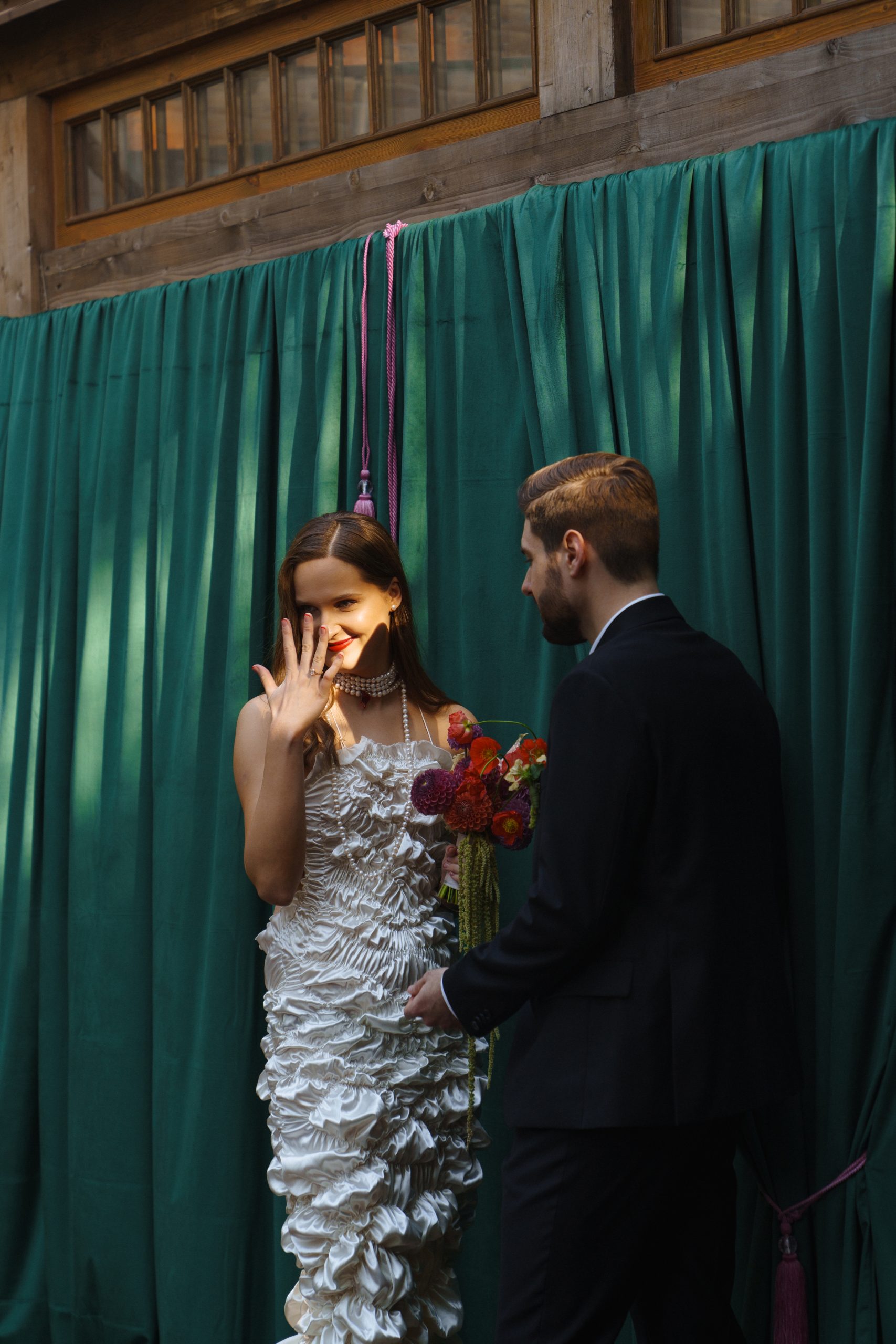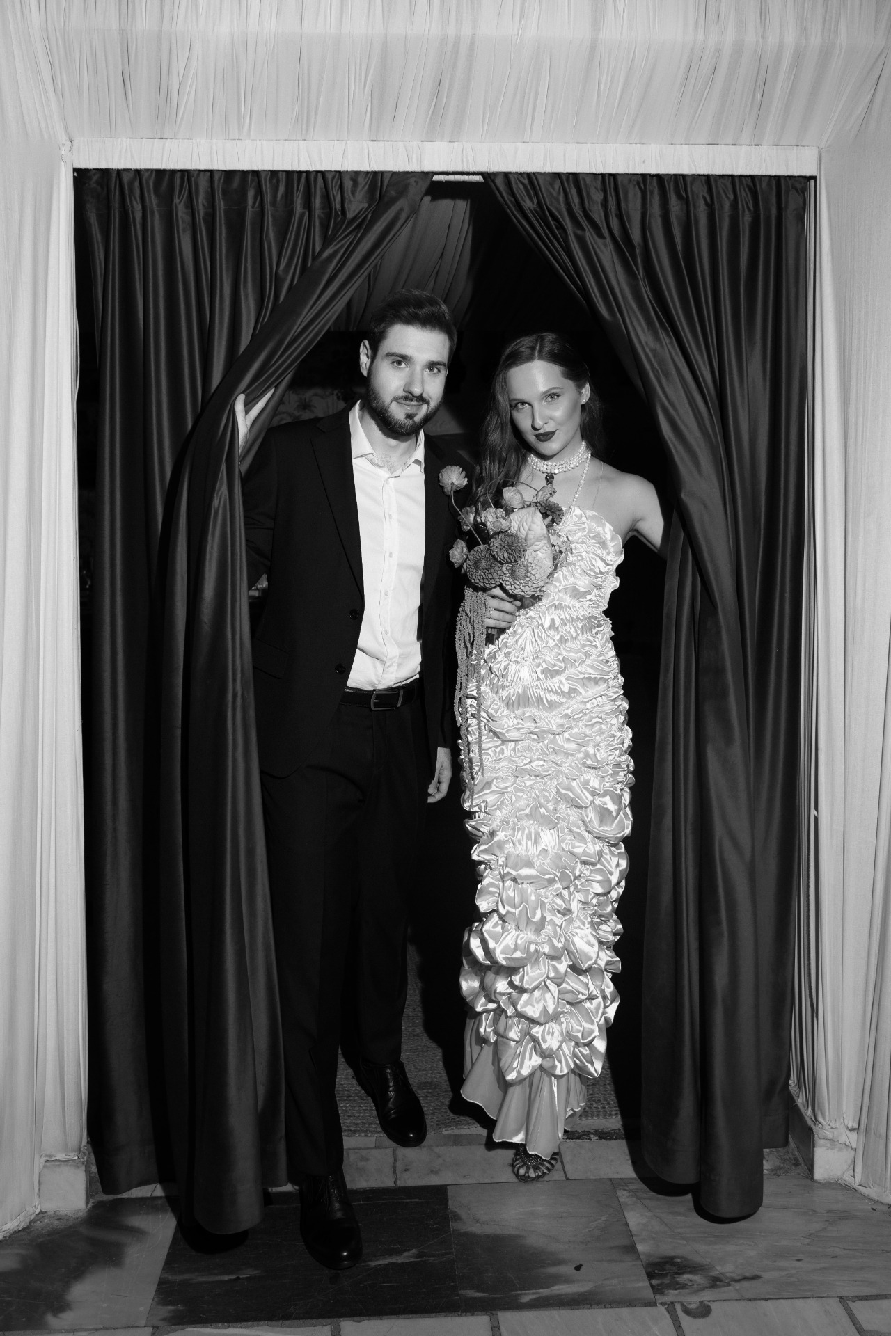 Так как акцентов в образе уже было достаточно, мы решили не усложнять причёску, чтобы избежать излишней театральности. Жених был не готов к смелым экспериментам в той же степени, что и я, поэтому выбрал классический костюм и рубашку в оттенке моего платья. В этот день он выглядел невероятно, так же, как и в любые другие дни.