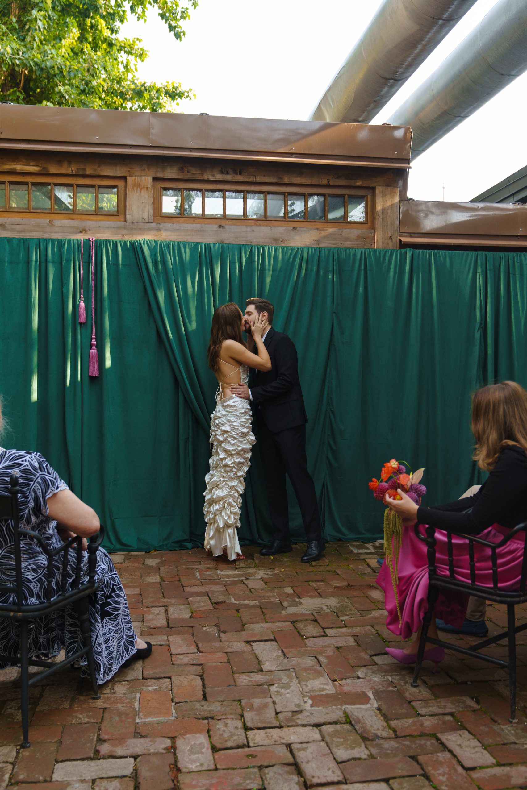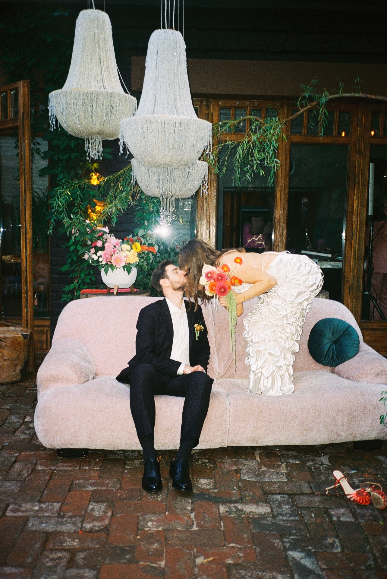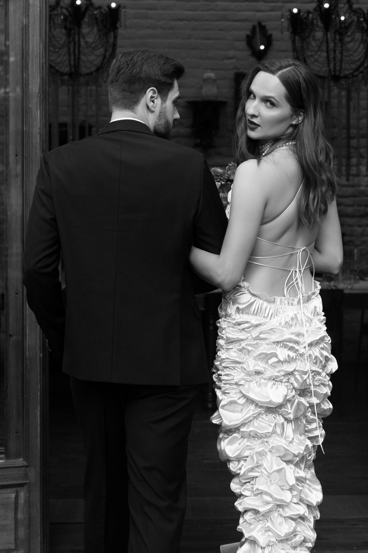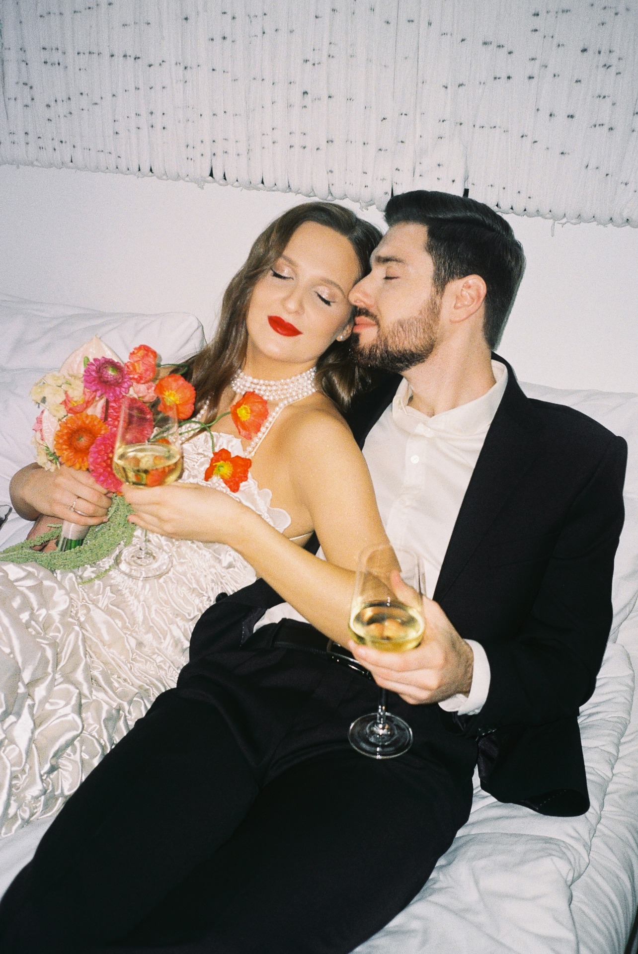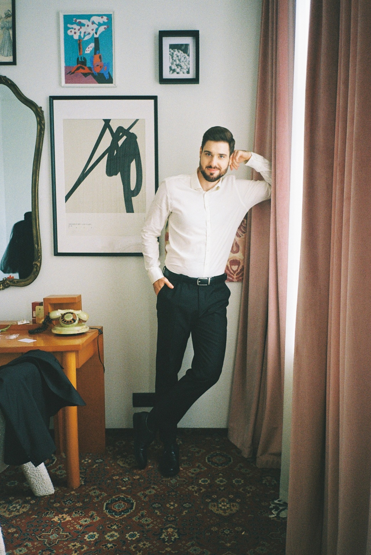 Так как акцентов в образе уже было достаточно, мы решили не усложнять причёску, чтобы избежать излишней театральности. Жених был не готов к смелым экспериментам в той же степени, что и я, поэтому выбрал классический костюм и рубашку в оттенке моего платья. В этот день он выглядел невероятно, так же, как и в любые другие дни.