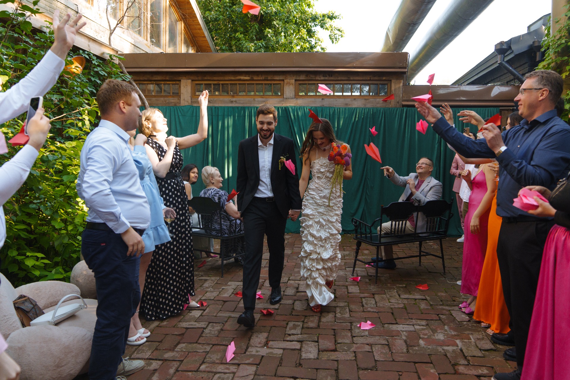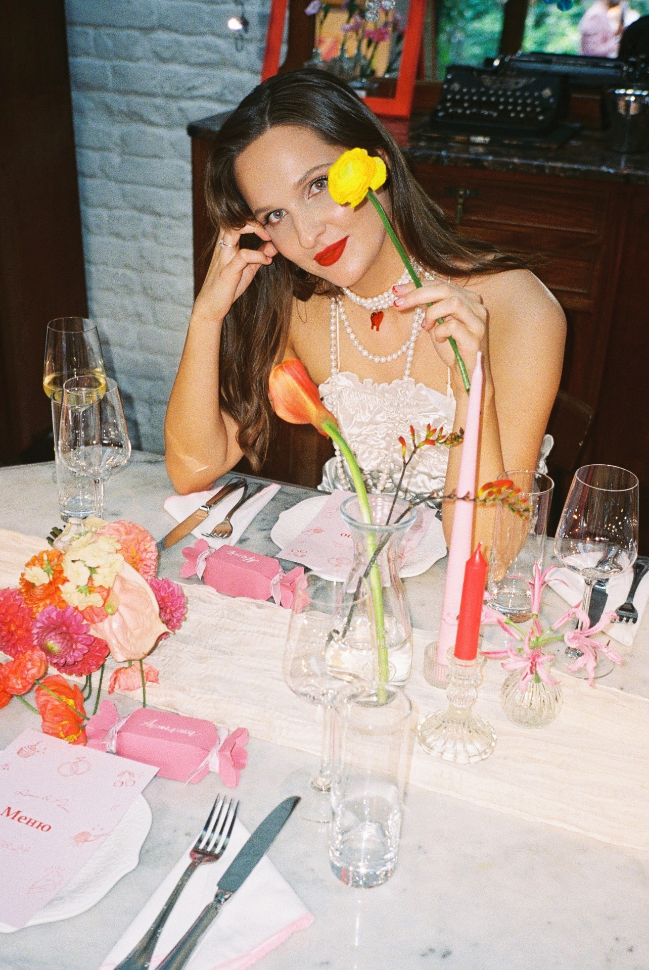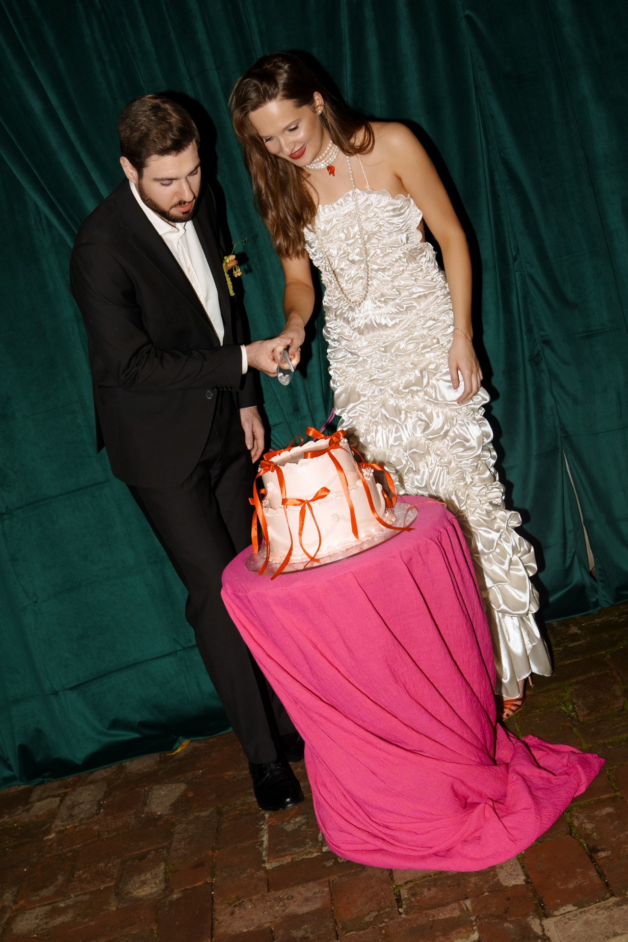 Определившись с палитрой и стилем, я назвала концепцию «dopamine design» — яркий, радостный, живой. Красный цвет изначально не планировался, но когда я нашла туфли мечты этого оттенка, всё сложилось само собой. Фотографа мы выбирали под концепцию, искали работы, полные жизни и цвета. Анастасия Дриго идеально уловила наше настроение.