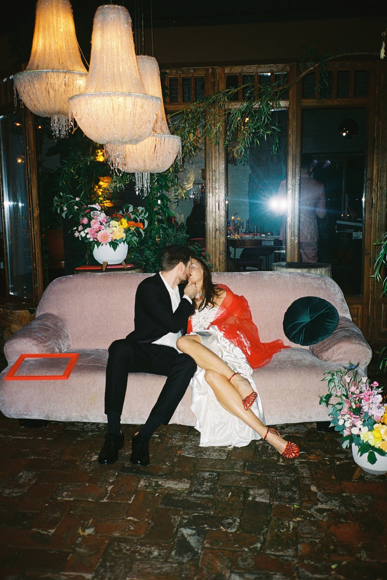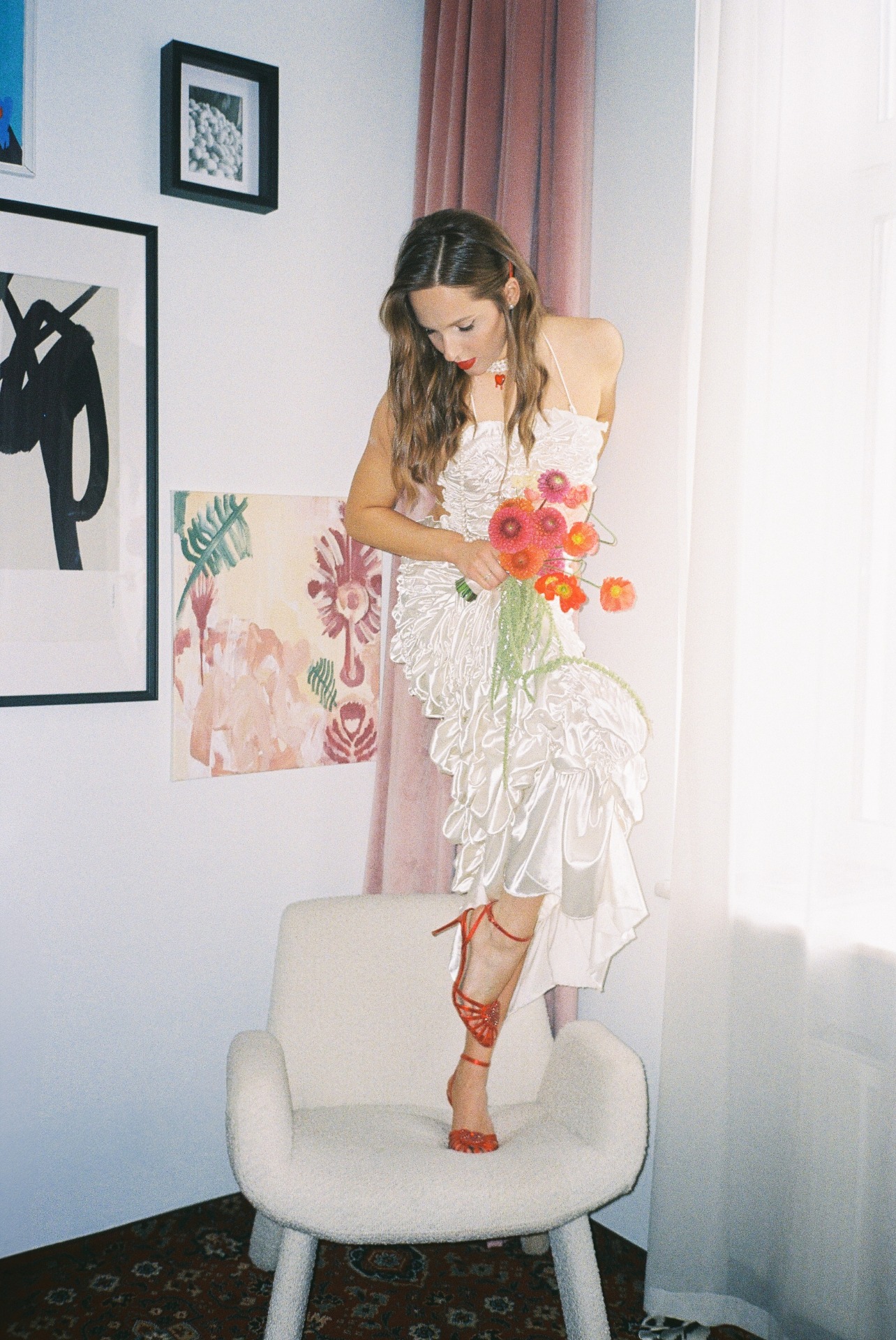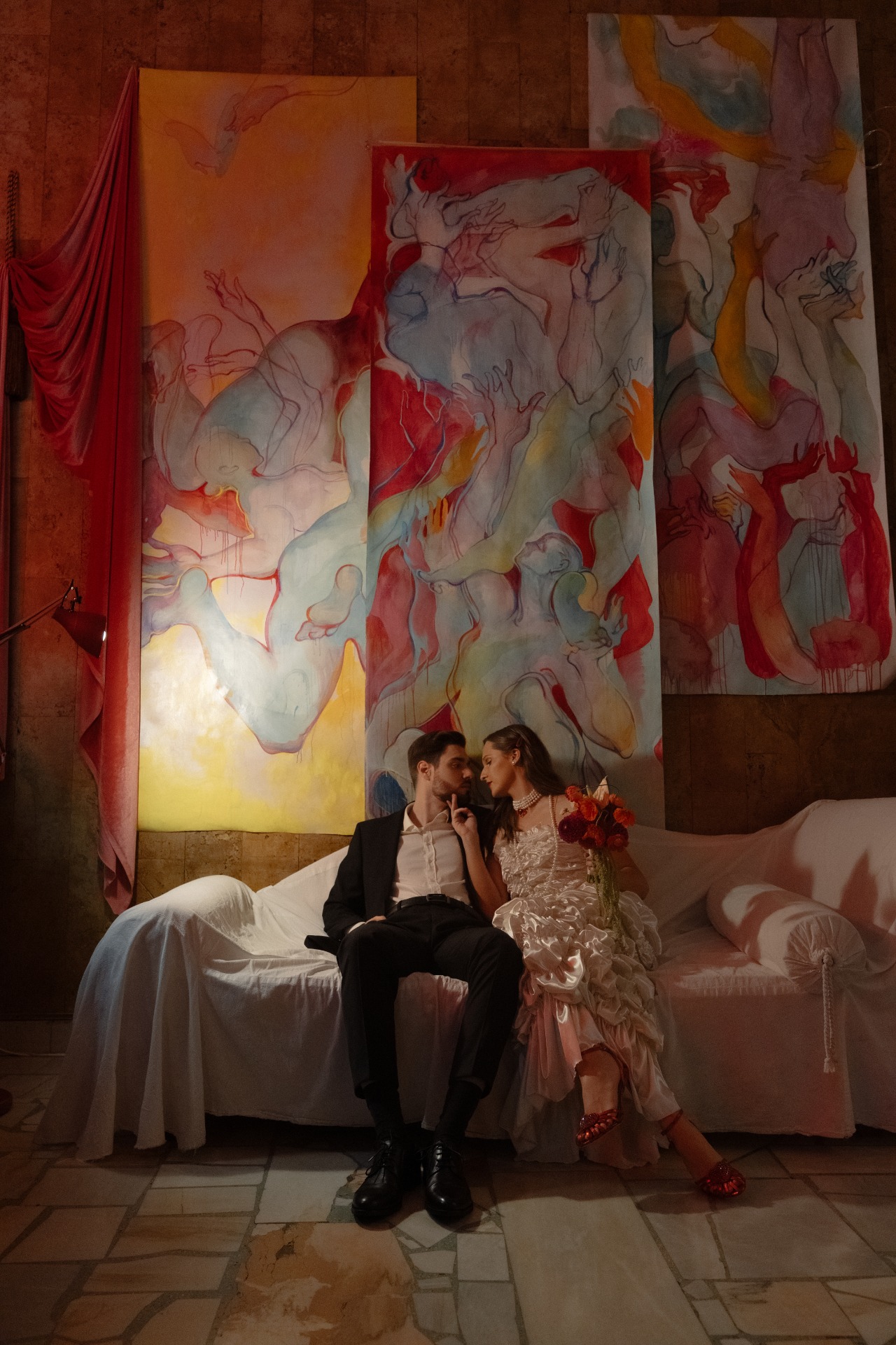 Определившись с палитрой и стилем, я назвала концепцию «dopamine design» — яркий, радостный, живой. Красный цвет изначально не планировался, но когда я нашла туфли мечты этого оттенка, всё сложилось само собой. Фотографа мы выбирали под концепцию, искали работы, полные жизни и цвета. Анастасия Дриго идеально уловила наше настроение.