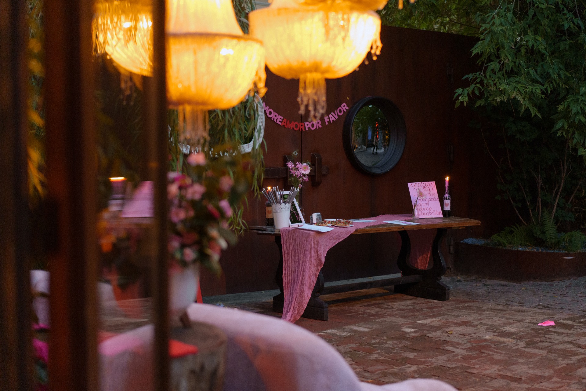Весь визуал я делала сама, а флористикой и оформлением занималась моя подруга Маша. Я полностью доверилась её безупречному вкусу и таланту, и не прогадала — всё выглядело именно так, как мы мечтали. Особенно полюбилась растяжка с надписью «More amor, por favor» («Больше любви, пожалуйста»), которую Маша сделала своими руками. Теперь эта фраза украшает наш дом и напоминает о том чудесном дне.
