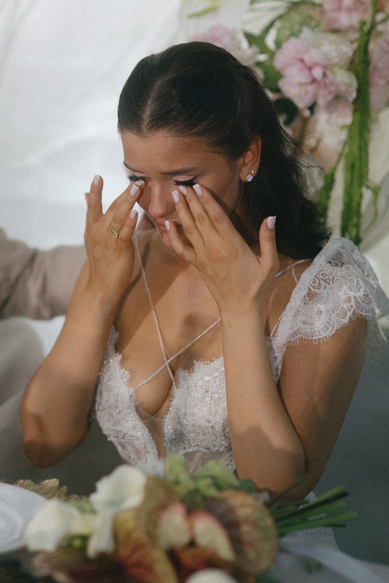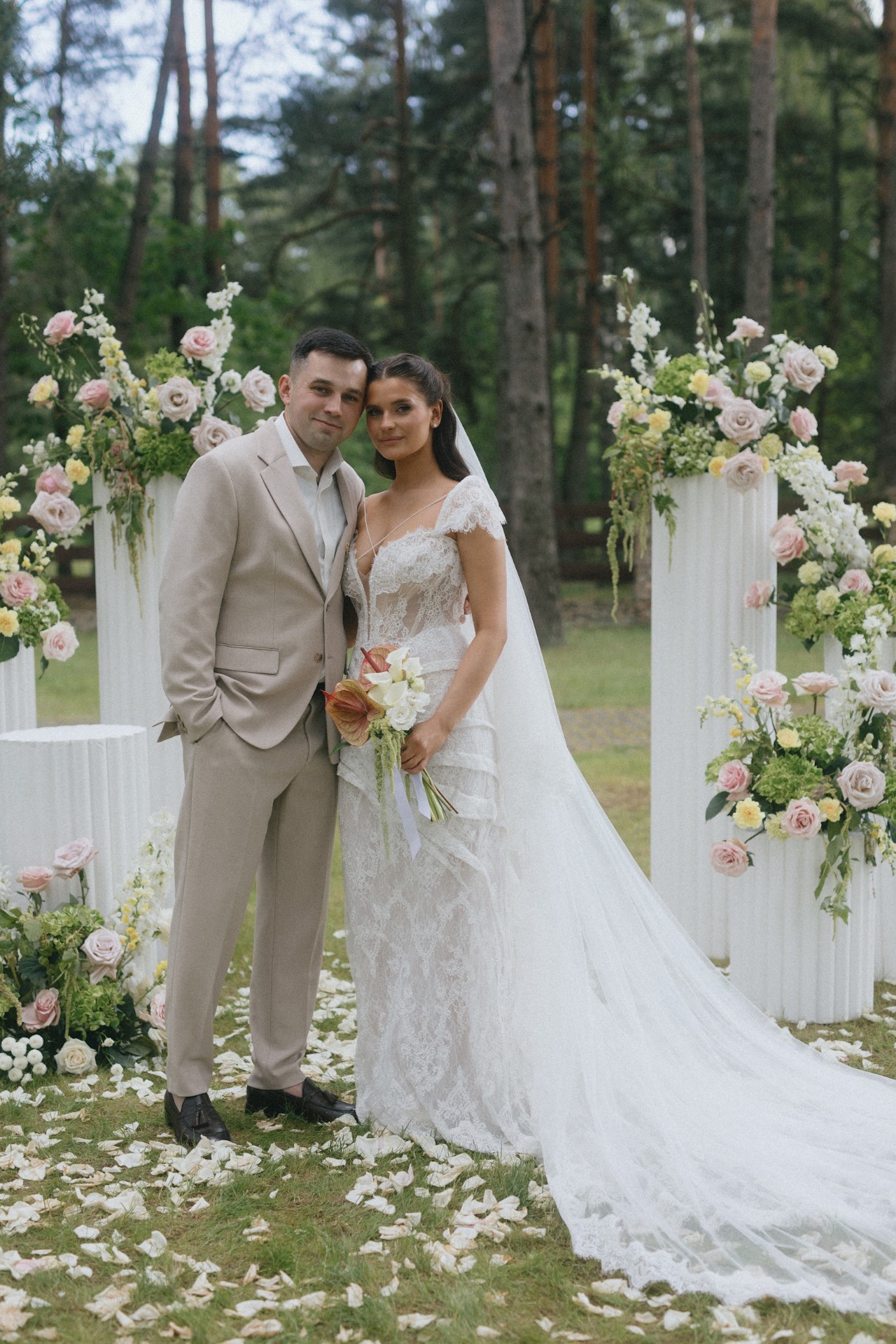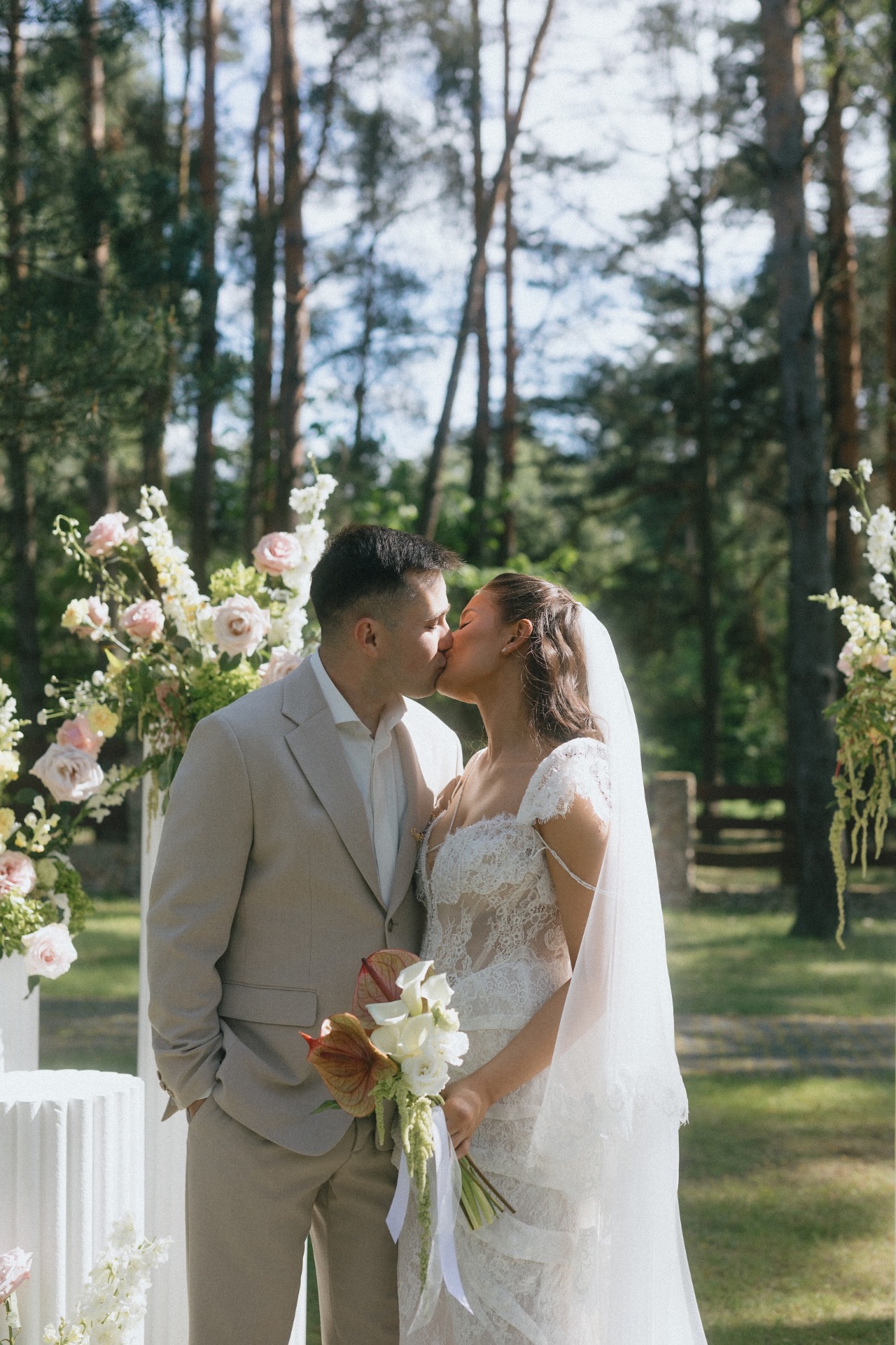 И вот, по приезде на примерку я перемерила очень много платьев, но ни одно, к сожалению, не запало мне в сердце. Я думала, что это выдуманное чувство, навязанное обществом. Но в конце, когда мне вынесли моё платье, я с первых секунд поняла: это оно. С ним я почувствовала себя настоящей невестой. Особенно с перекидной фатой: я ощущала себя такой же хрупкой и таинственной, как нежный аромат цветов, раскрывающийся при лёгком ветерке.