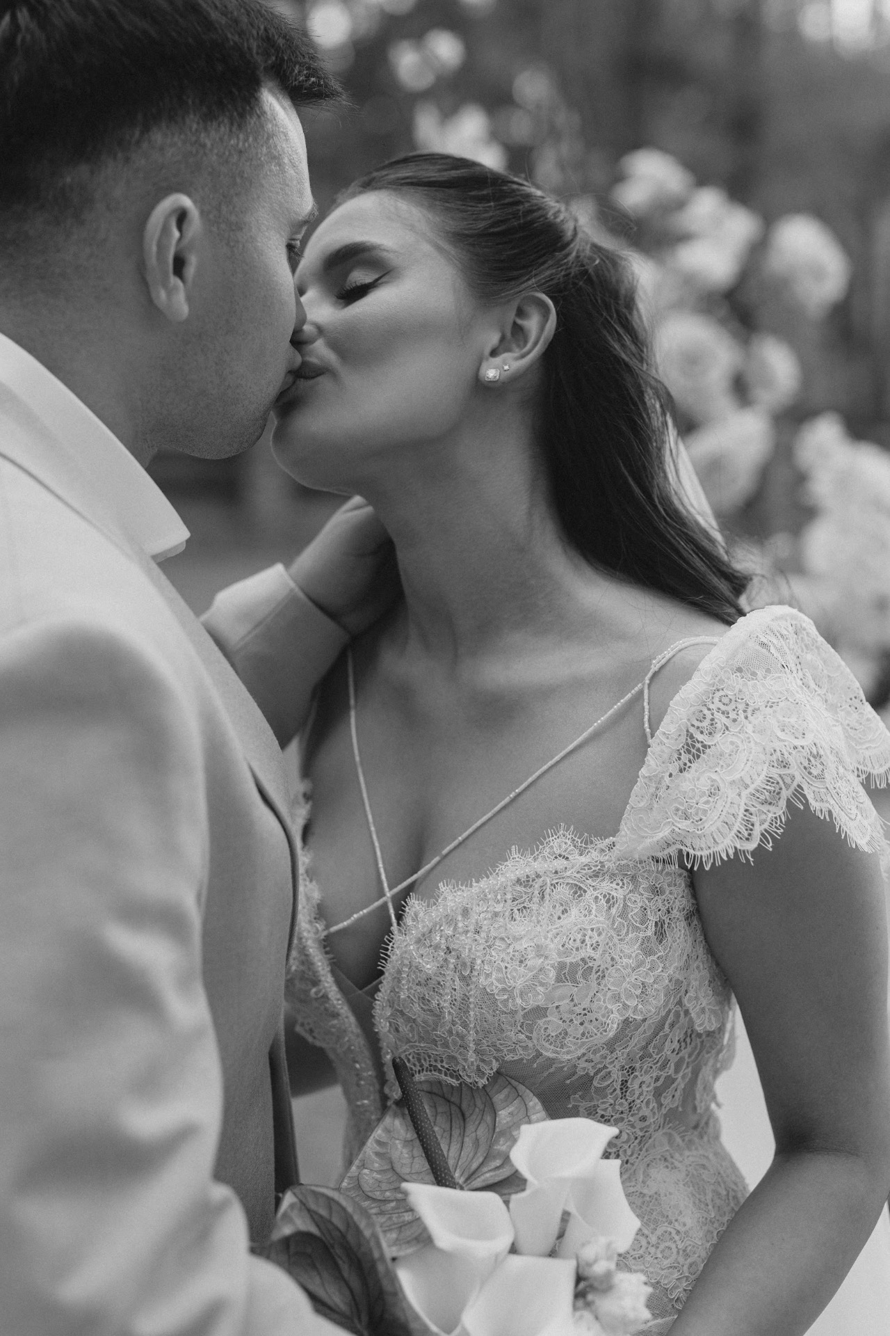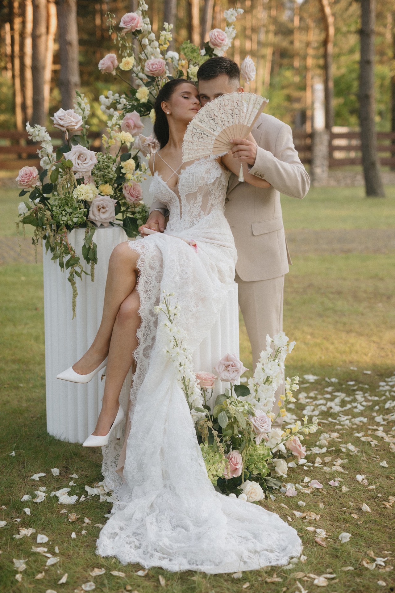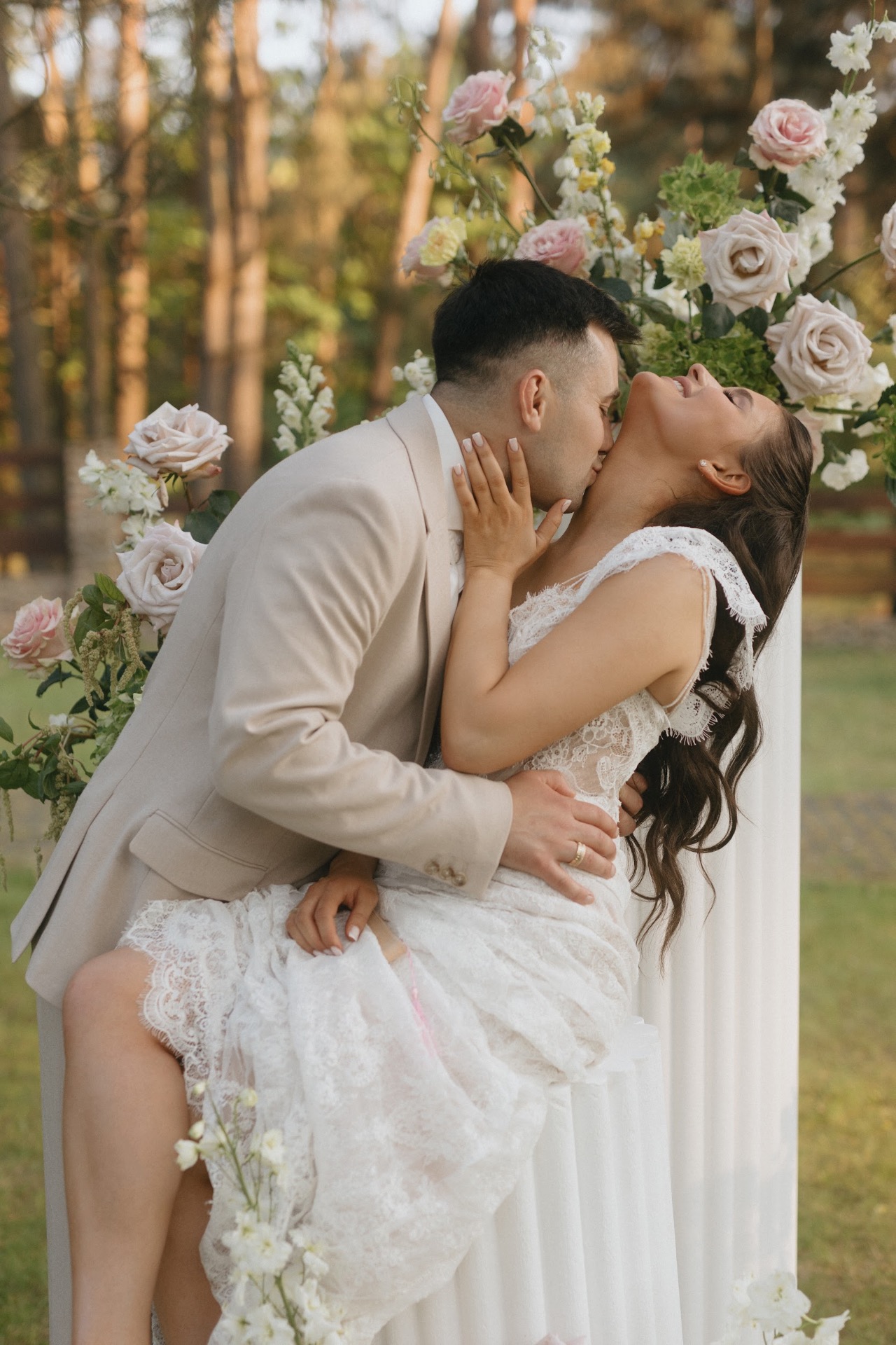 И вот, по приезде на примерку я перемерила очень много платьев, но ни одно, к сожалению, не запало мне в сердце. Я думала, что это выдуманное чувство, навязанное обществом. Но в конце, когда мне вынесли моё платье, я с первых секунд поняла: это оно. С ним я почувствовала себя настоящей невестой. Особенно с перекидной фатой: я ощущала себя такой же хрупкой и таинственной, как нежный аромат цветов, раскрывающийся при лёгком ветерке.