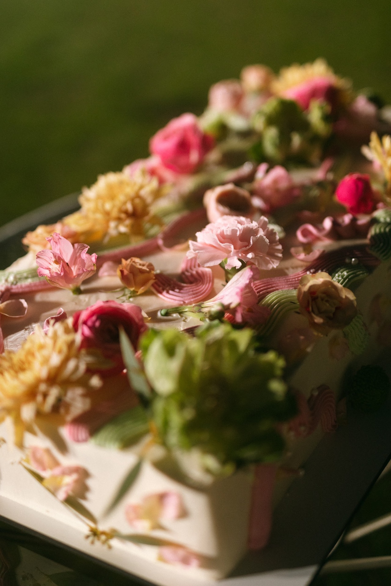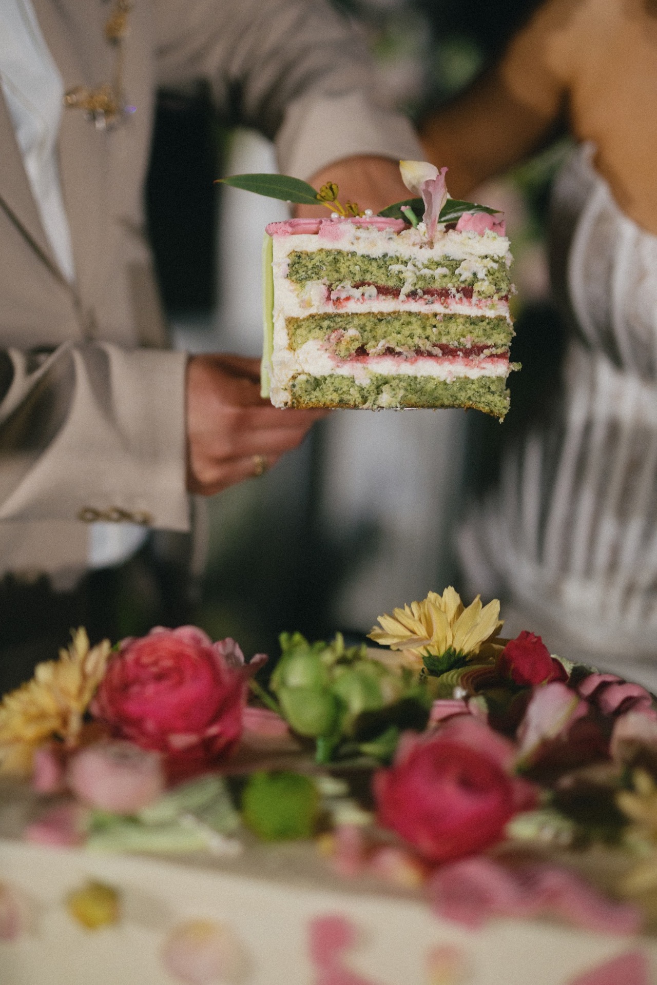 В моей голове давно был торт мечты. Я собирала его по картинкам из Pinterest и даже рисовала на бумаге, чтобы объяснить кондитеру. Сверху его украшали яркие и лёгкие цветы, а аккуратные волны вокруг напоминали течение чего-то спокойного, светлого, нежного в нашей жизни. Яркие цветы стали акцентом — символом насыщенности и яркости в ней. Начинка была из шпината и малины, это вновь отражало сочетание сладости и сдержанности.