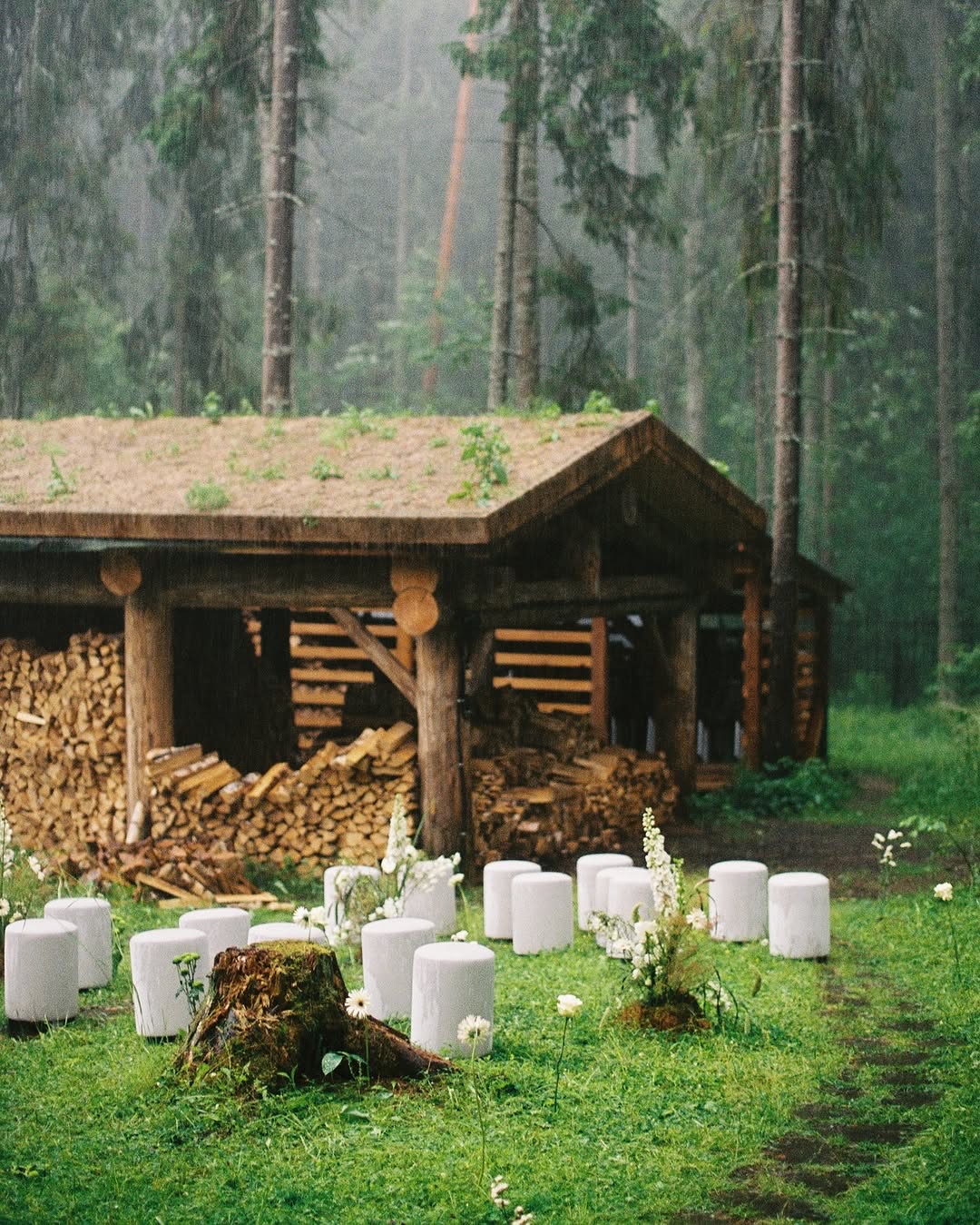 В декоре ребята предпочли белые цветы и фруктово-овощной сет-дизайн. Также мы добавили тканевые драпировки и красивую мебель — кресла, подушки, зеркала. Зону церемонии мы вписали в естественный ландшафт — поставили кочки, подобрали мох и флористику, разбавив всё акцентными пуфиками. Получилось невероятно красиво!