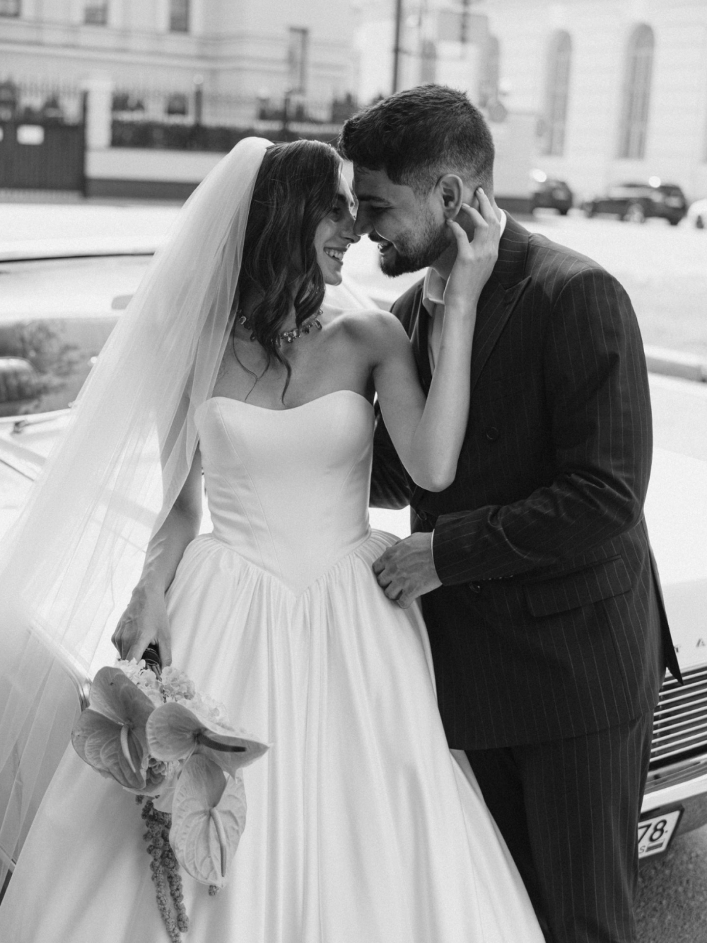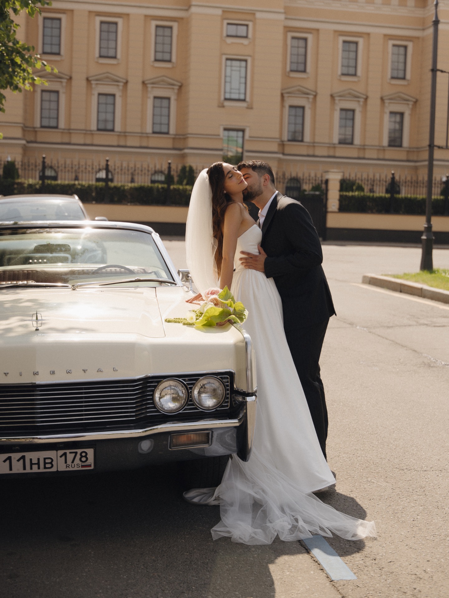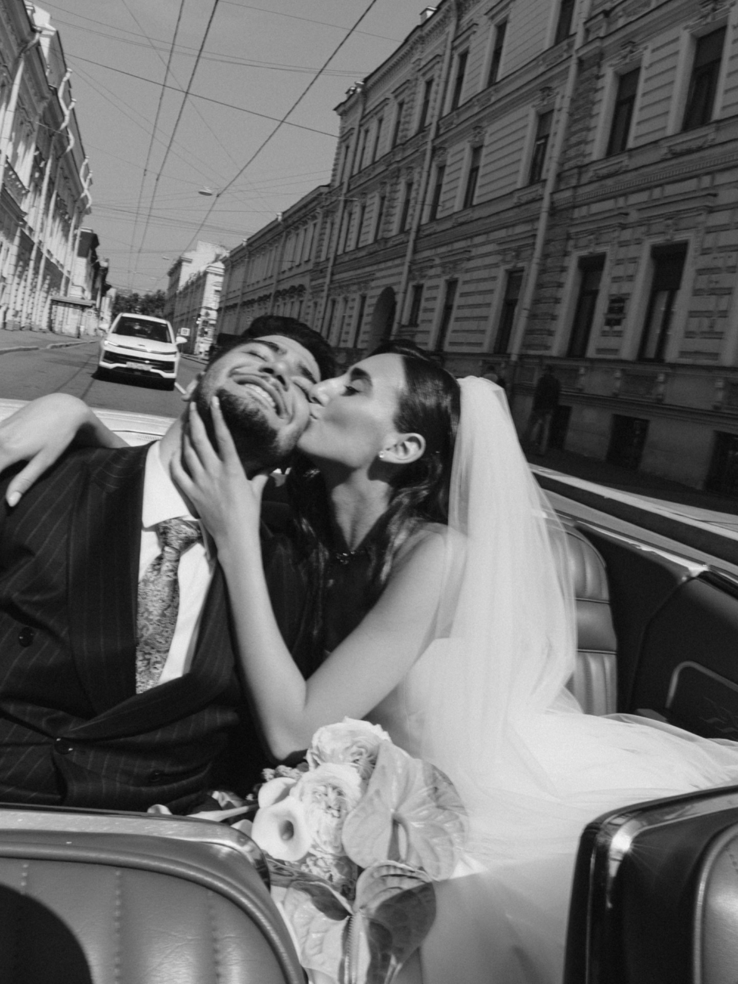 Наша первая встреча произошла в отеле: как только я вошла в комнату, Гасан обернулся, и мы оба не сдержали слёз. До ЗАГСа мы ехали на ретроавтомобиле Lincoln 1966 года, слушая музыку 80-х и наслаждаясь солнечным Санкт-Петербургом.