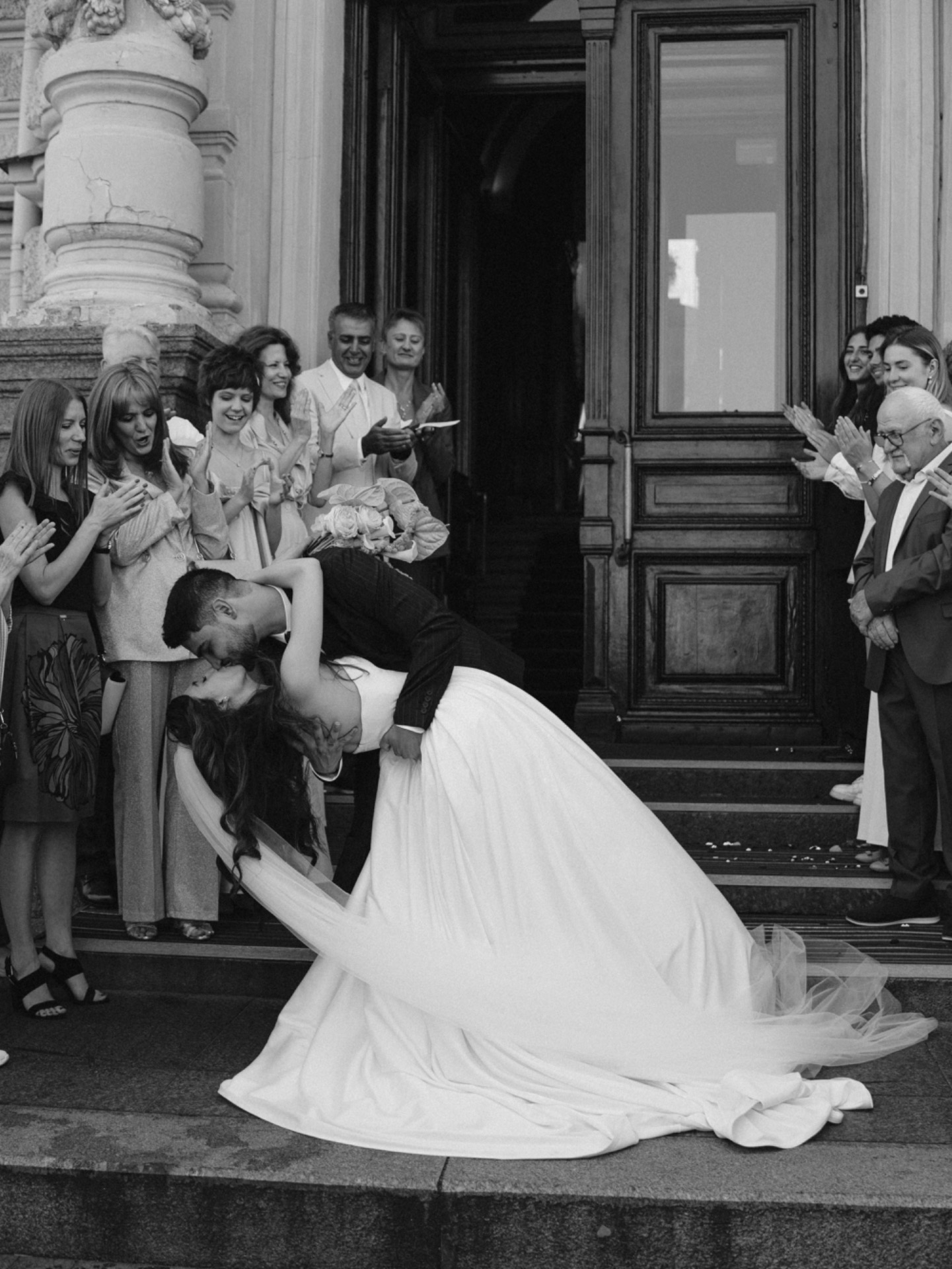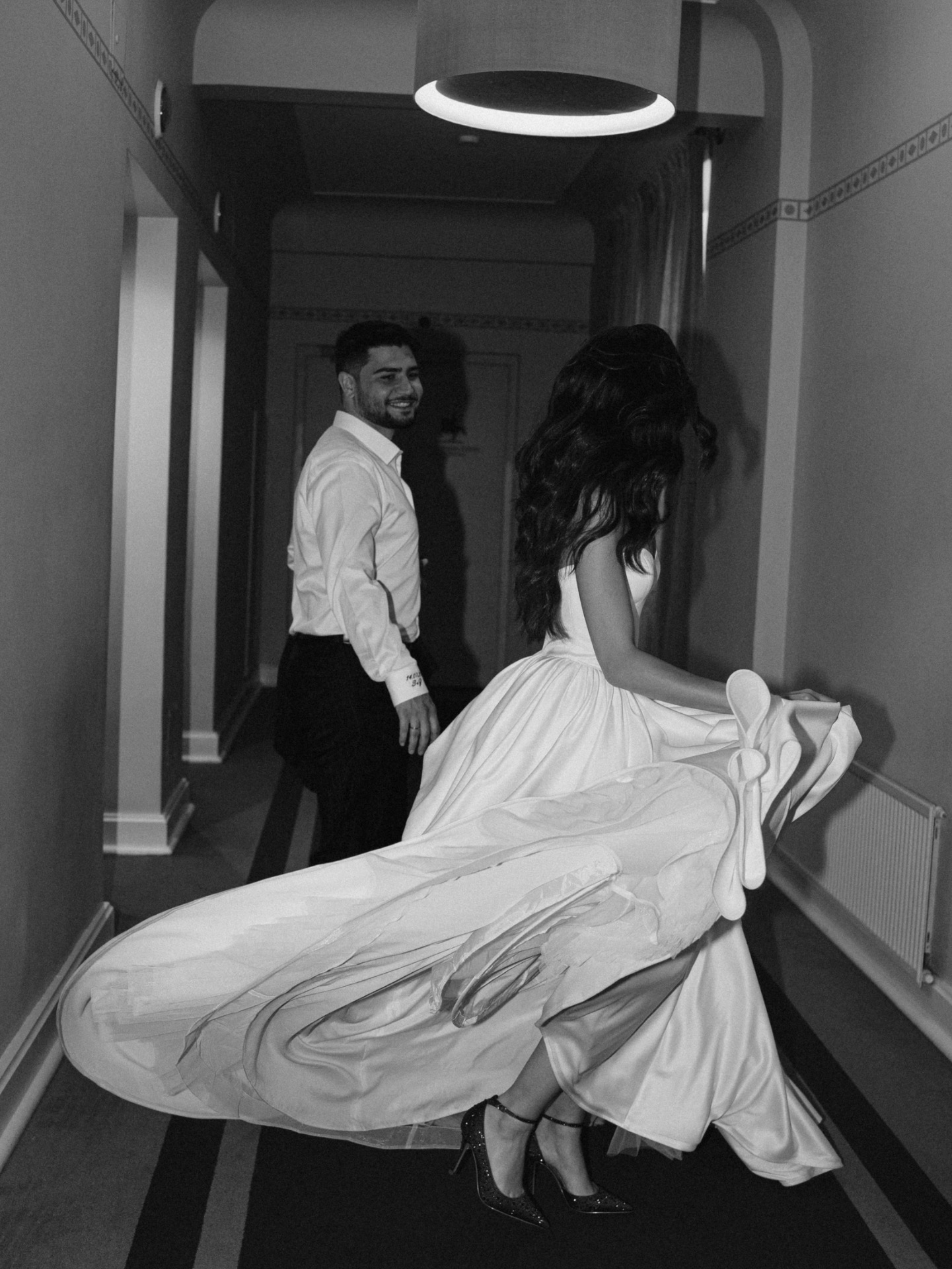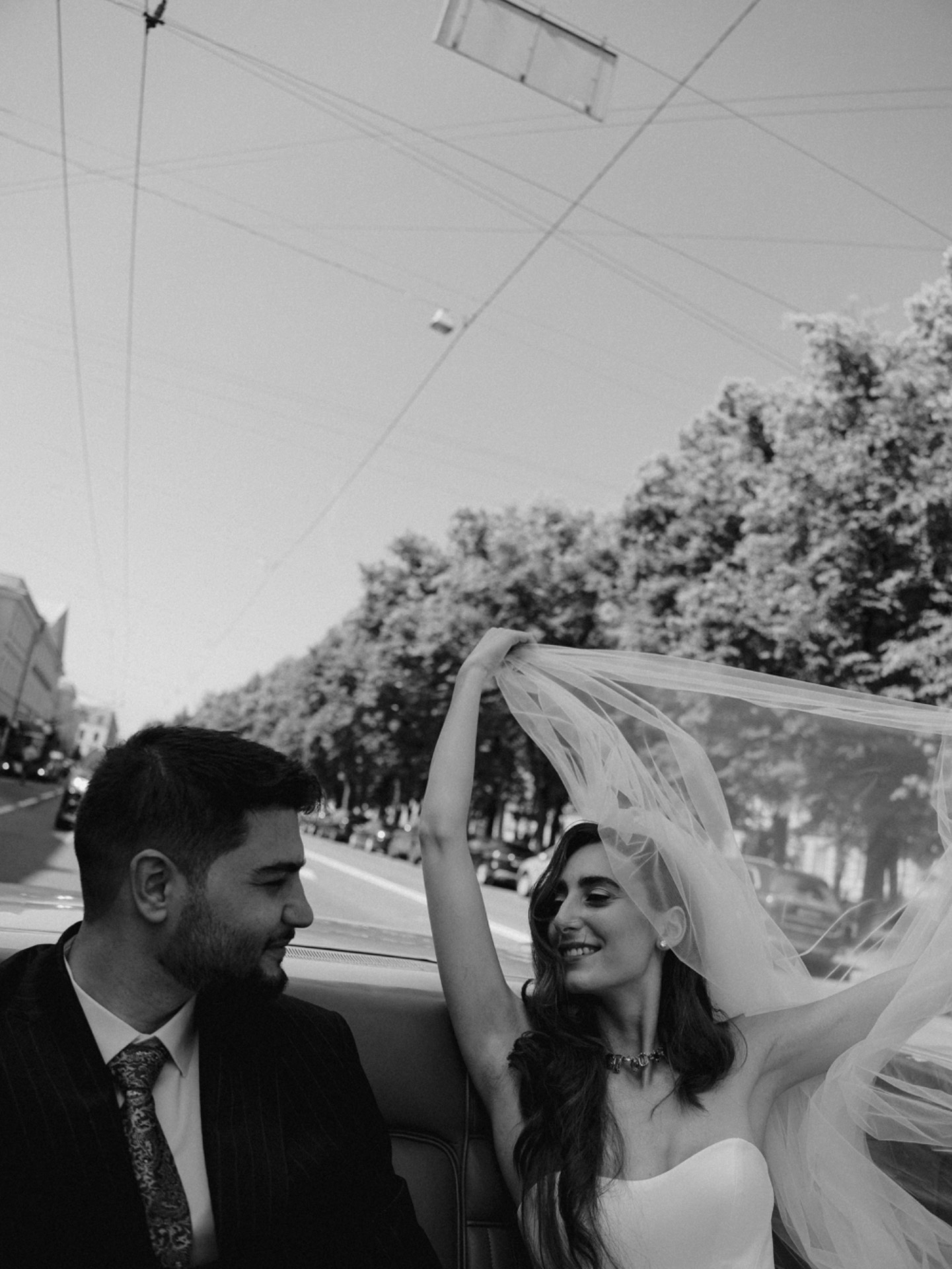 Наша первая встреча произошла в отеле: как только я вошла в комнату, Гасан обернулся, и мы оба не сдержали слёз. До ЗАГСа мы ехали на ретроавтомобиле Lincoln 1966 года, слушая музыку 80-х и наслаждаясь солнечным Санкт-Петербургом.