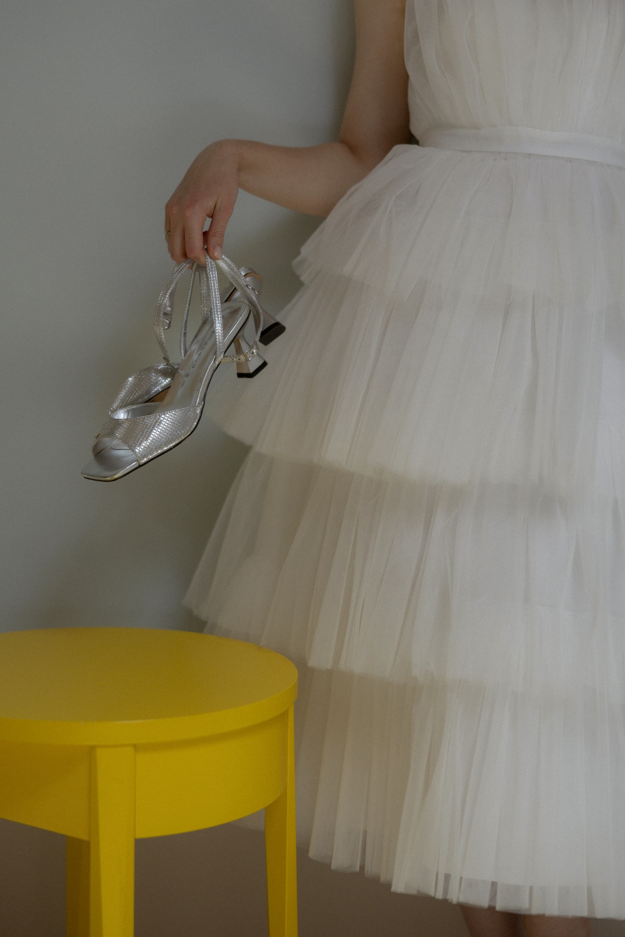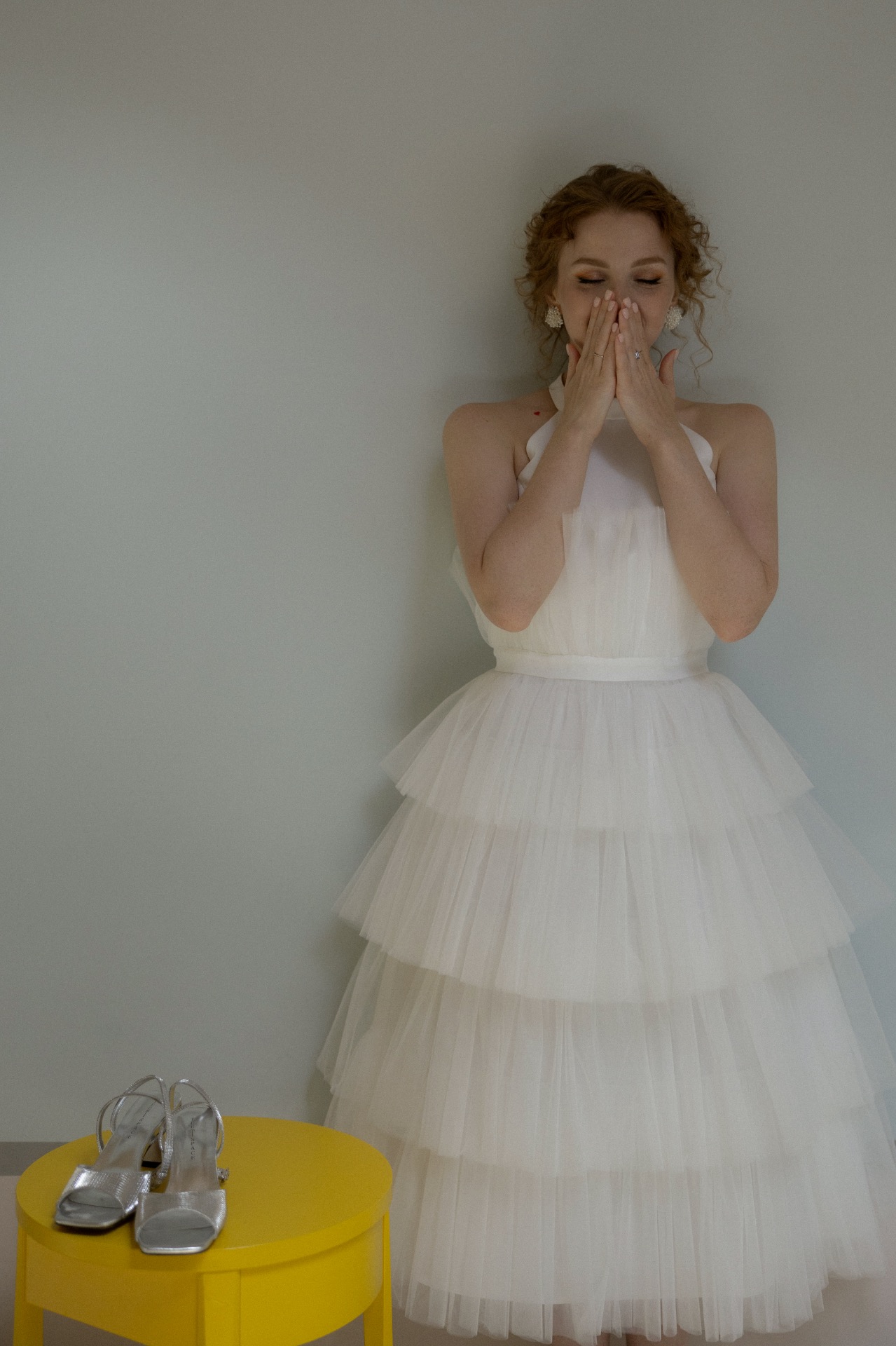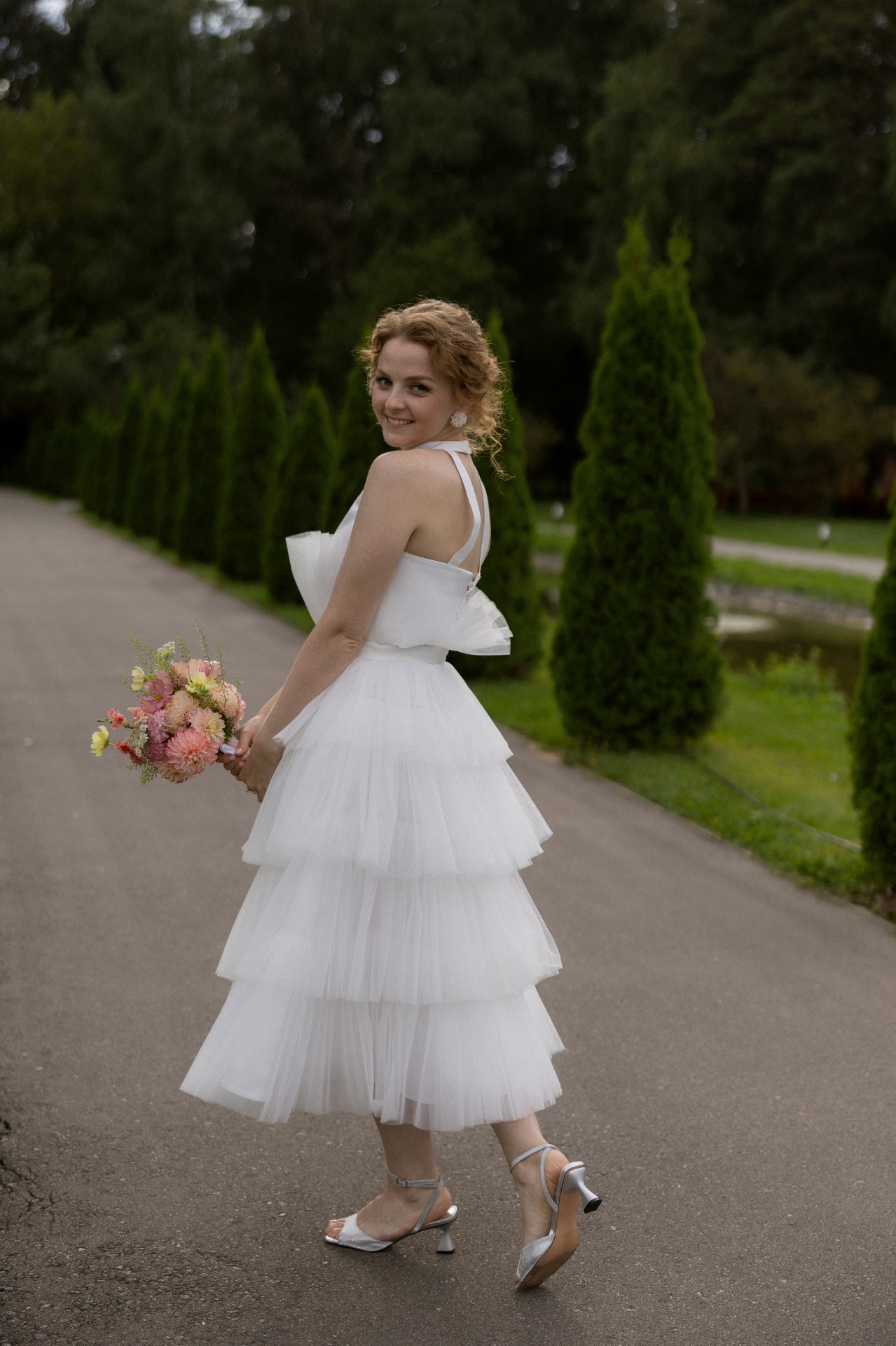 Я выбрала себе необычное платье длины макси, но не в пол, многоуровневое и с рюшами. Его сложно описать — достаточно лишь один раз увидеть. Когда я наткнулась на него в свадебном салоне, у нас произошла любовь с первого взгляда. Оно было очень лёгким, воздушным и идеально подходило и для церемонии, и для вечерних танцев.