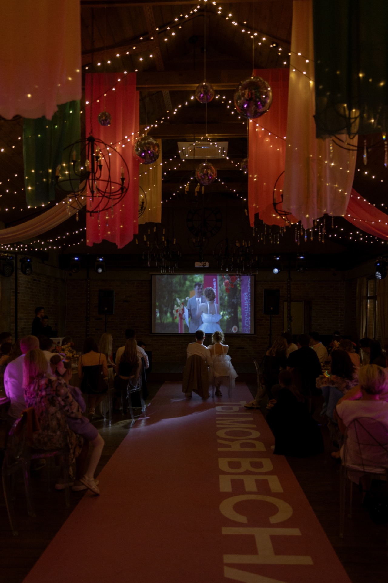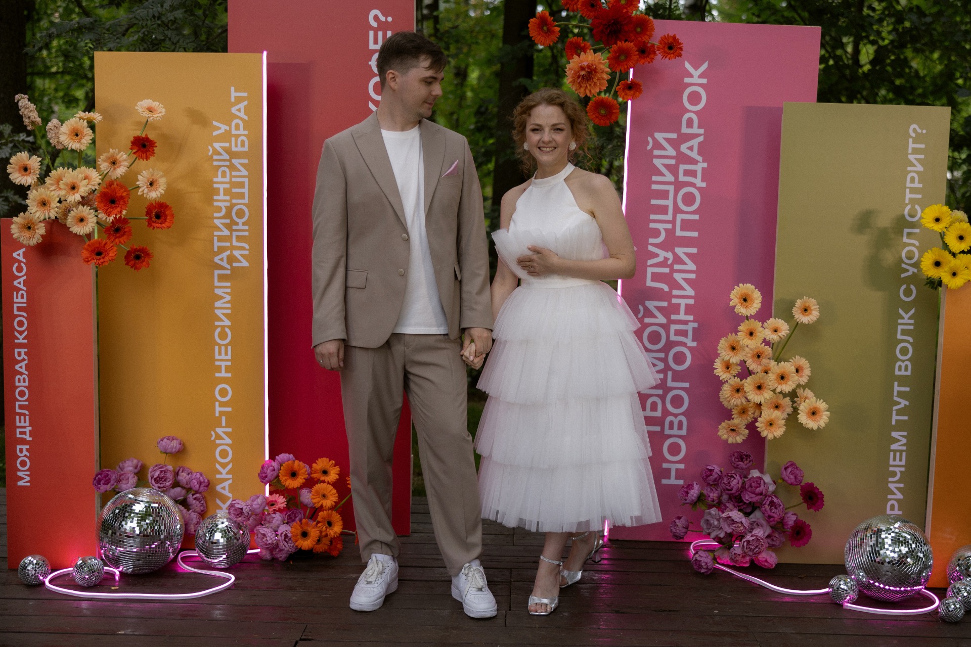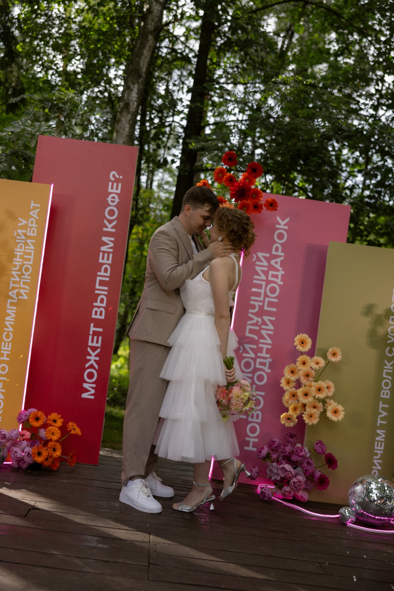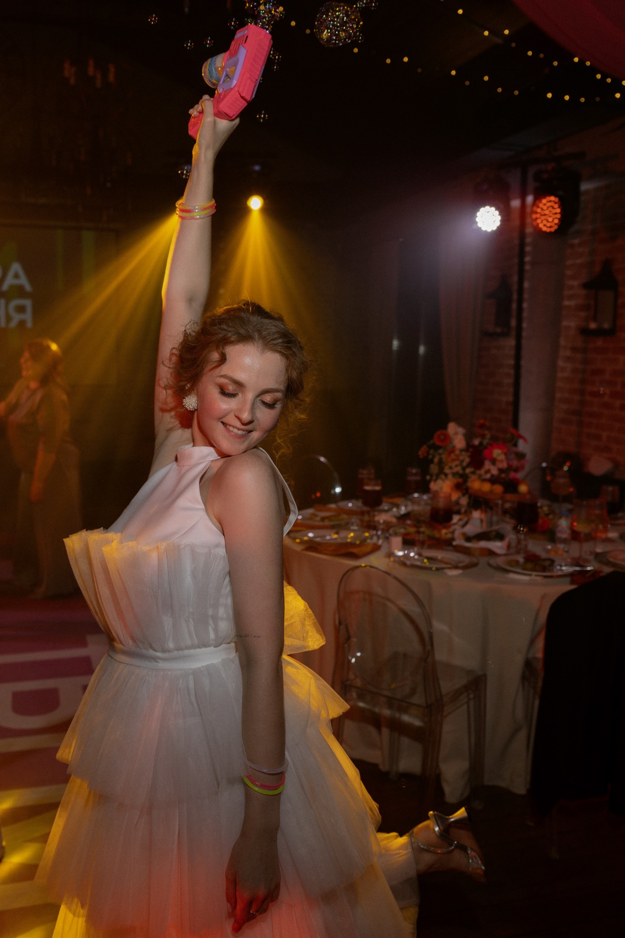 Наша палитра состояла из оранжевого, зелёного, розового и жёлтого цветов. Нам хотелось добавить в праздник как можно больше ярких интересных решений. Поэтому в декоре у нас были неоновые ленты и диско-шары, которые отлично вписались в идею свадьбы-вечеринки.