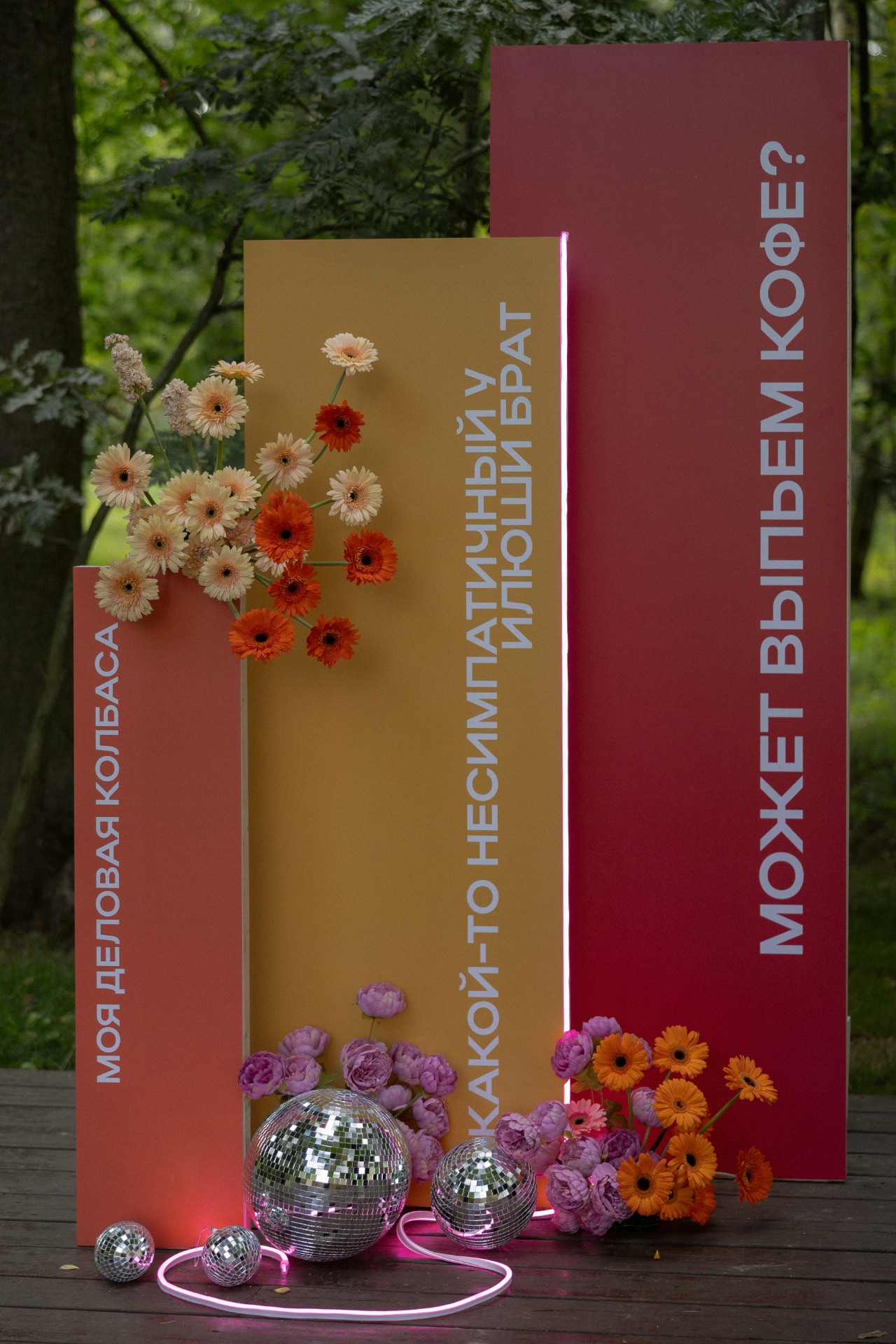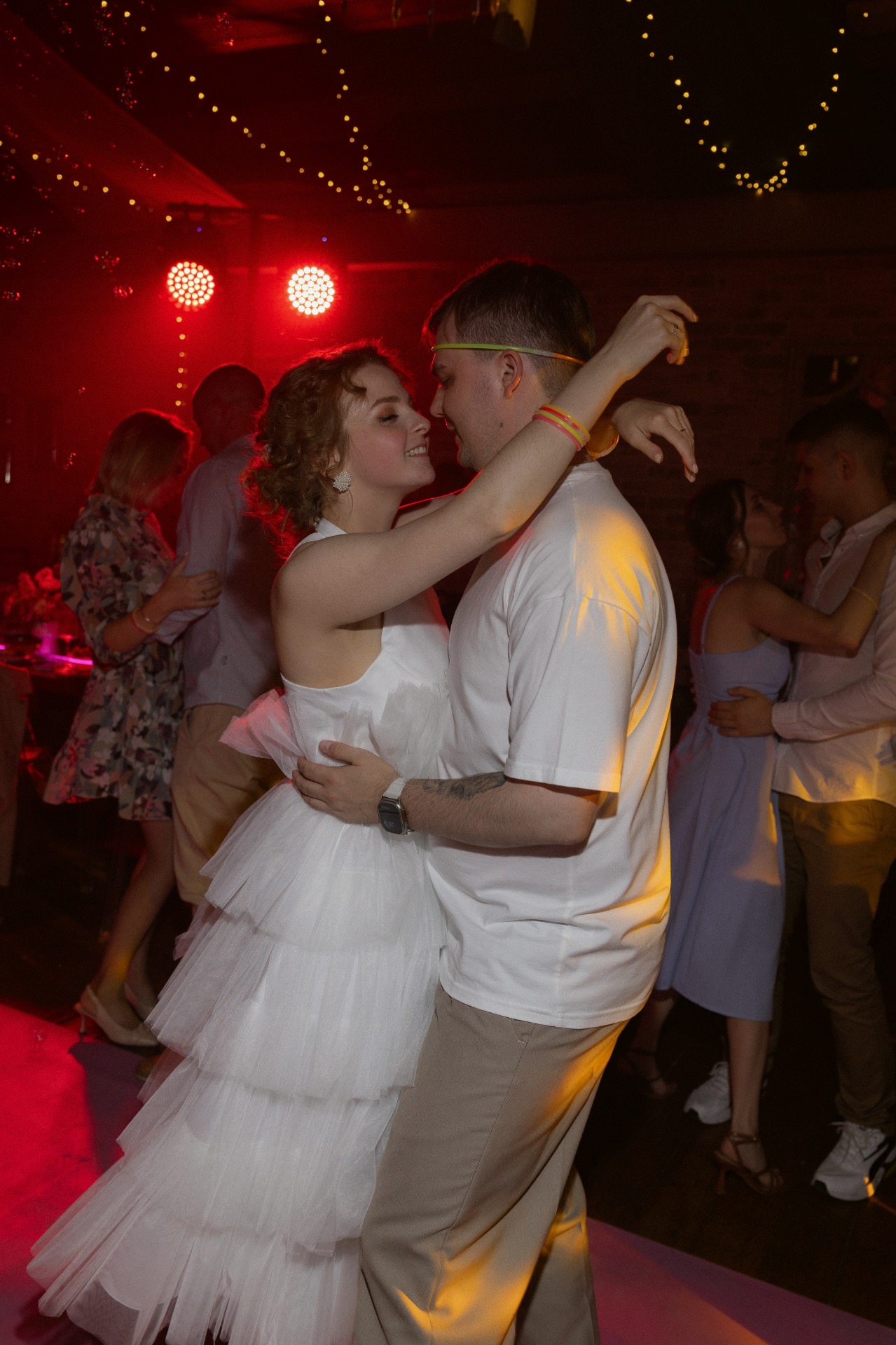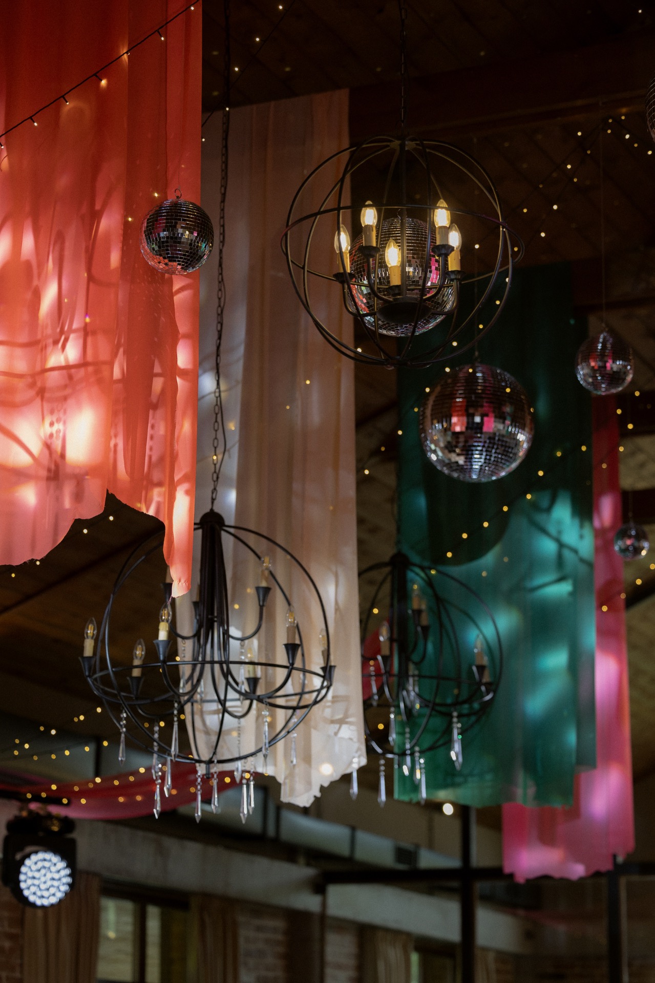 Наша палитра состояла из оранжевого, зелёного, розового и жёлтого цветов. Нам хотелось добавить в праздник как можно больше ярких интересных решений. Поэтому в декоре у нас были неоновые ленты и диско-шары, которые отлично вписались в идею свадьбы-вечеринки.