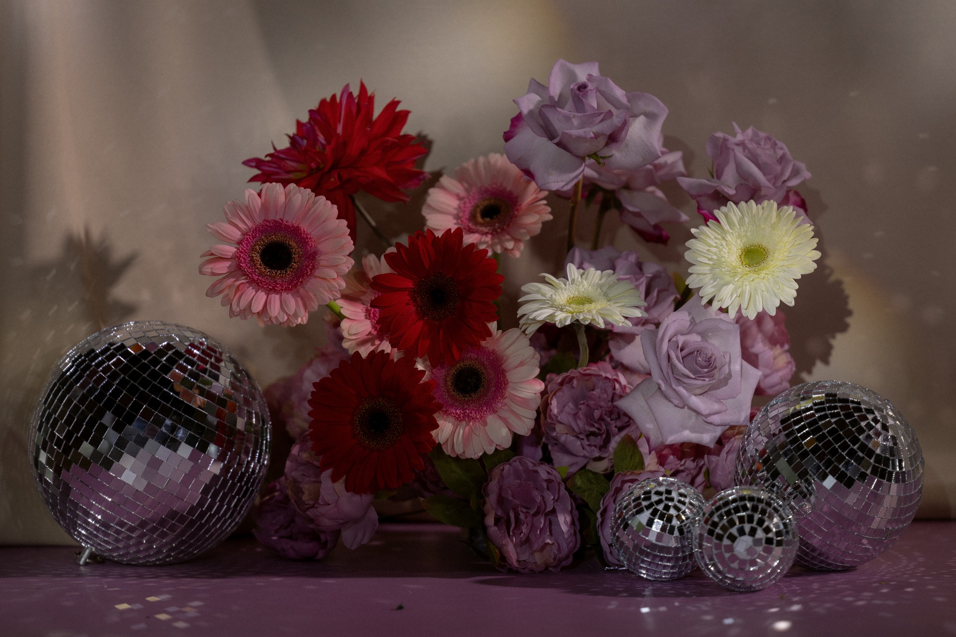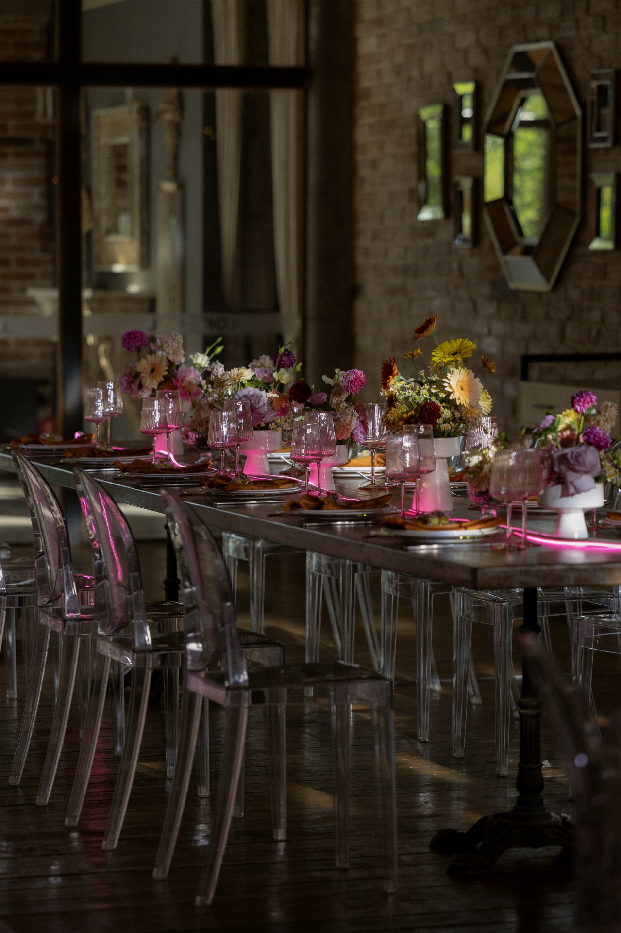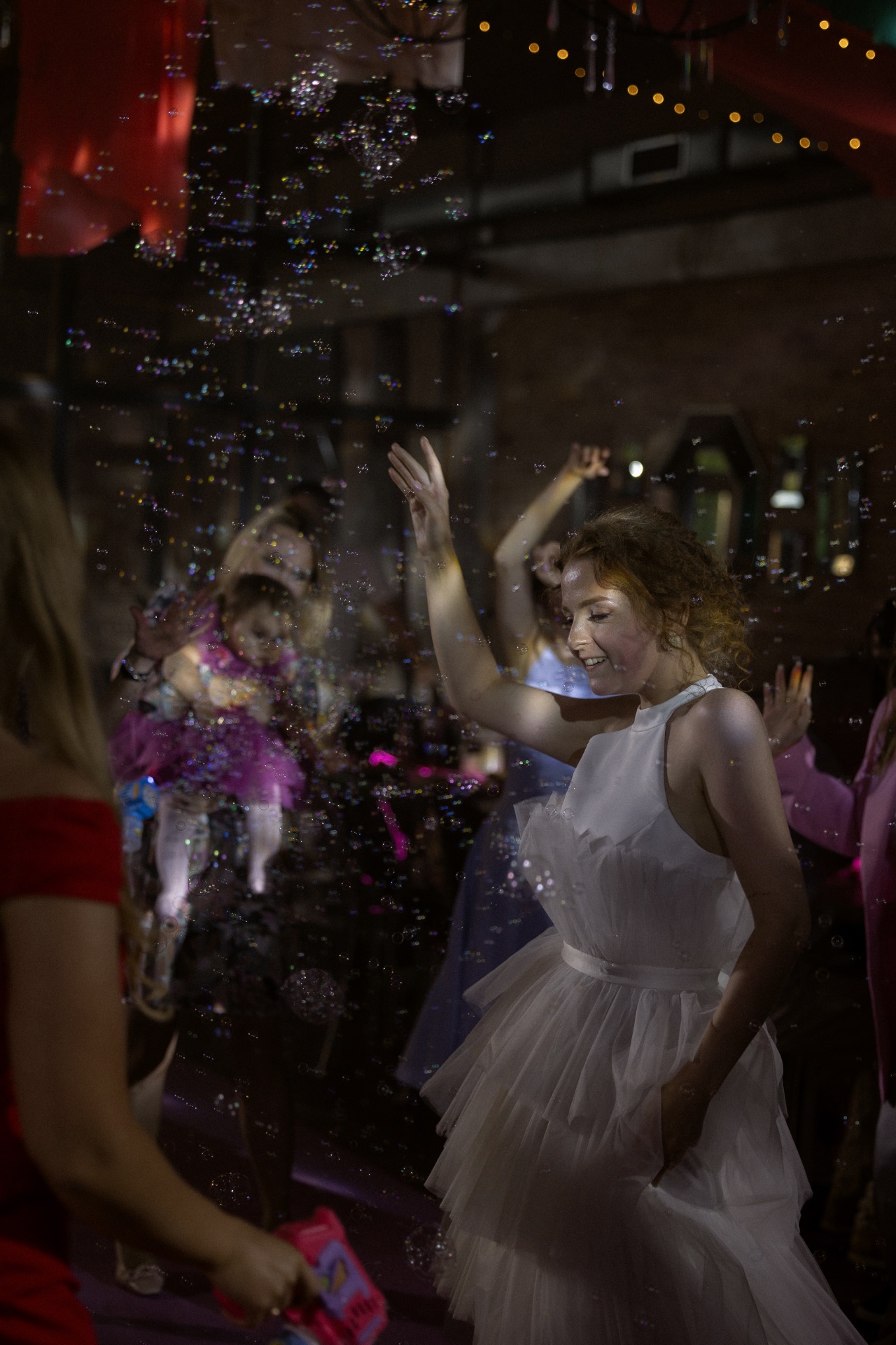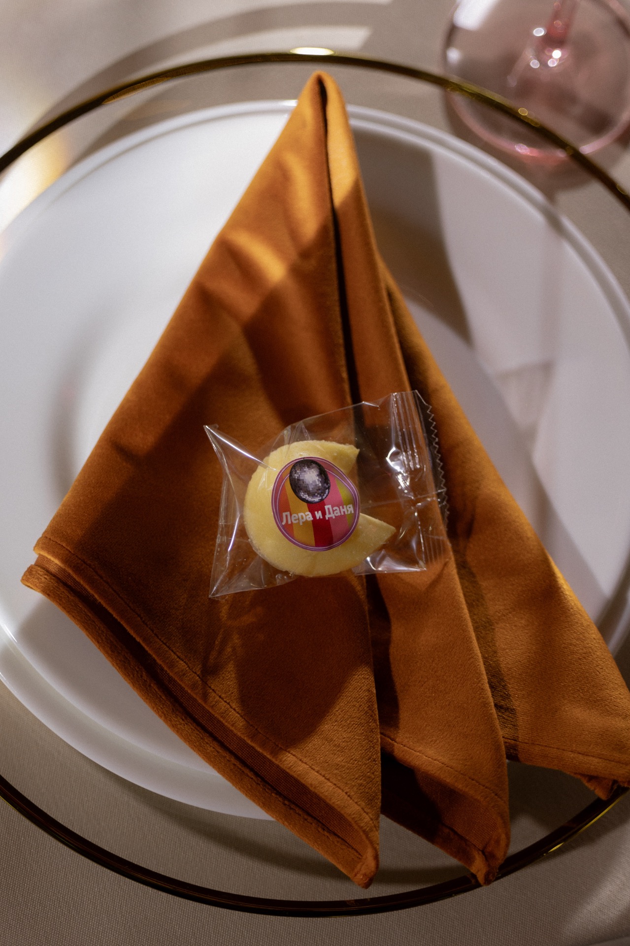 Наша палитра состояла из оранжевого, зелёного, розового и жёлтого цветов. Нам хотелось добавить в праздник как можно больше ярких интересных решений. Поэтому в декоре у нас были неоновые ленты и диско-шары, которые отлично вписались в идею свадьбы-вечеринки.