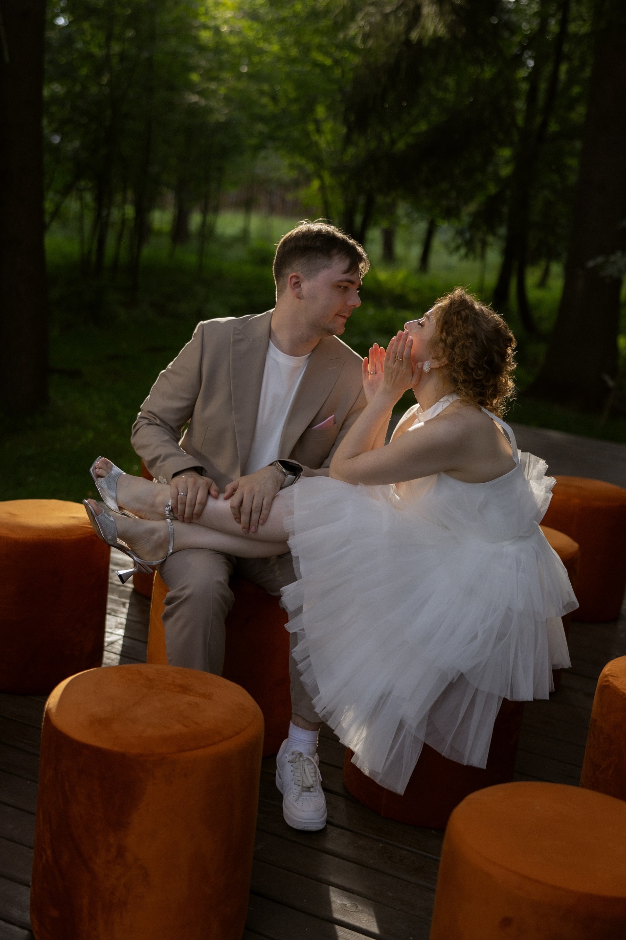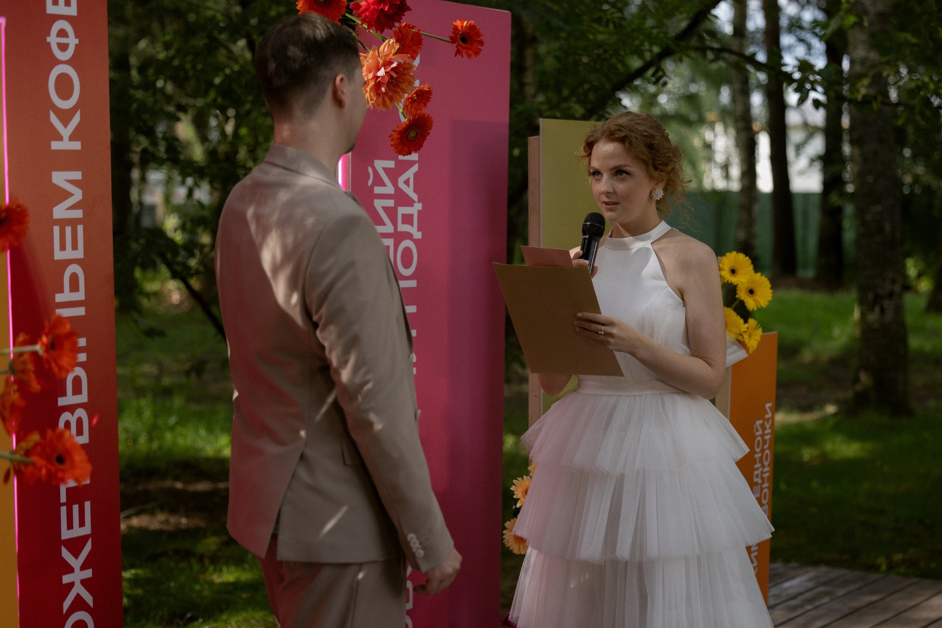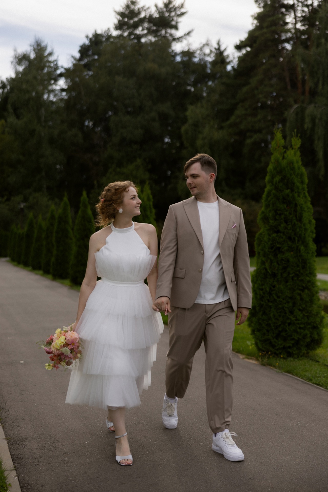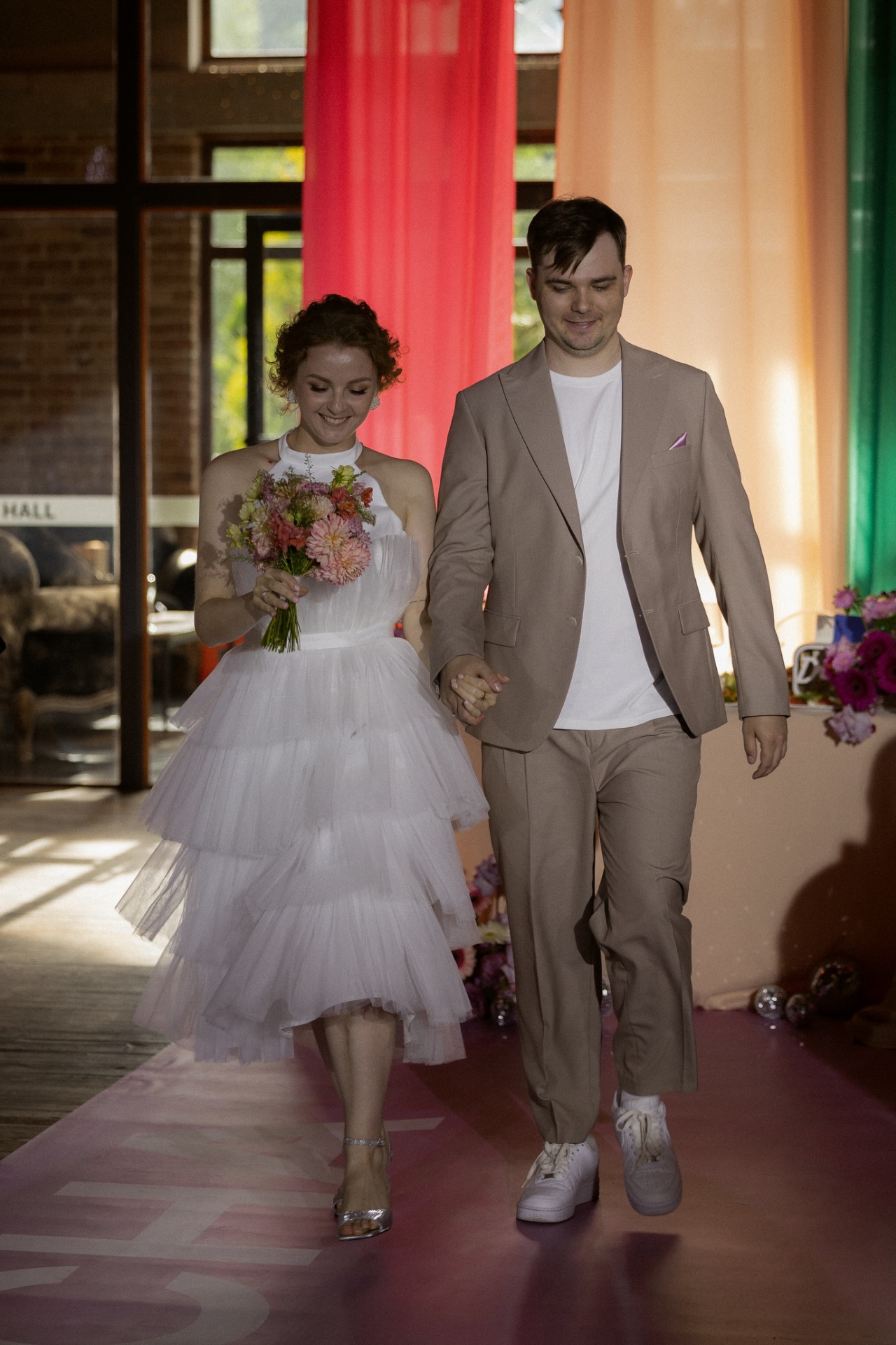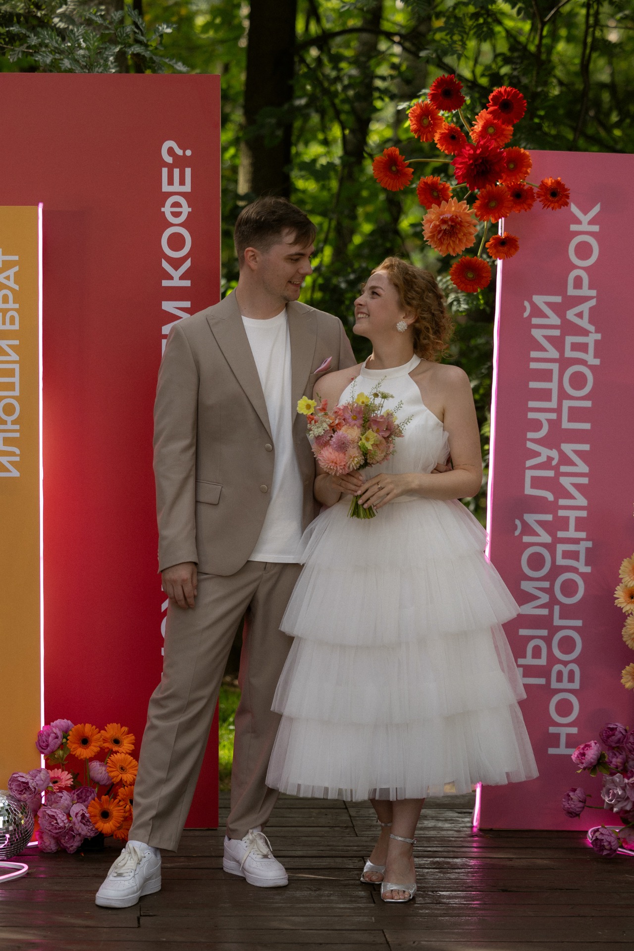 Длинные платья с шлейфами и смокинги — это история не про нас. Мы хотели что-то лёгкое, расслабленное, идеально сочетающееся с концепцией свадьбы.