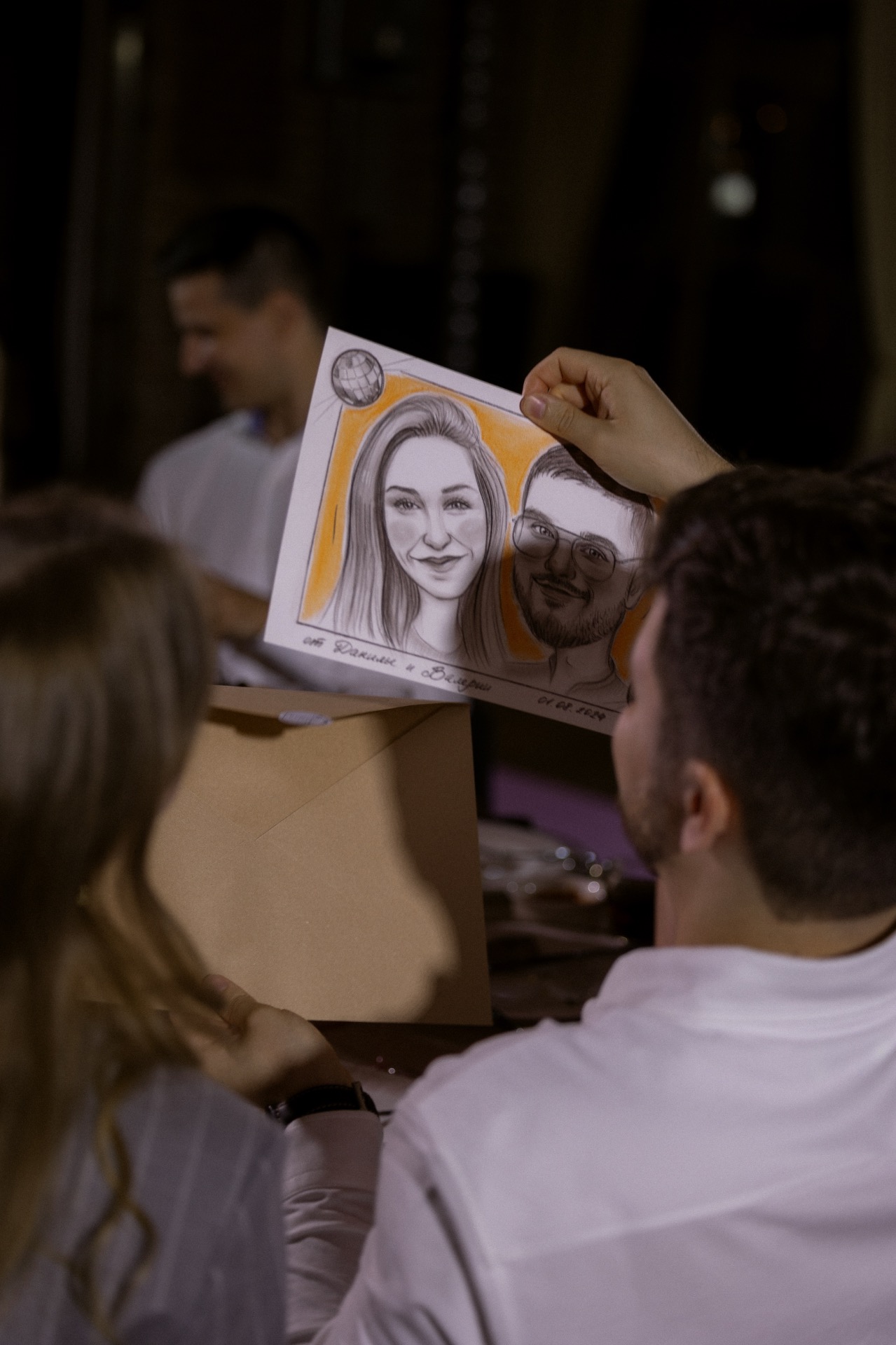 Для каждого гостя мы с организаторами подготовили печенье с индивидуальными предсказаниями, которые тщательно подбирали под каждого приглашённого. Также мы решили поднять всем настроение и сделать памятные подарки — шаржи, которые вручили в конце вечера, вызвав приятное удивление у каждого.