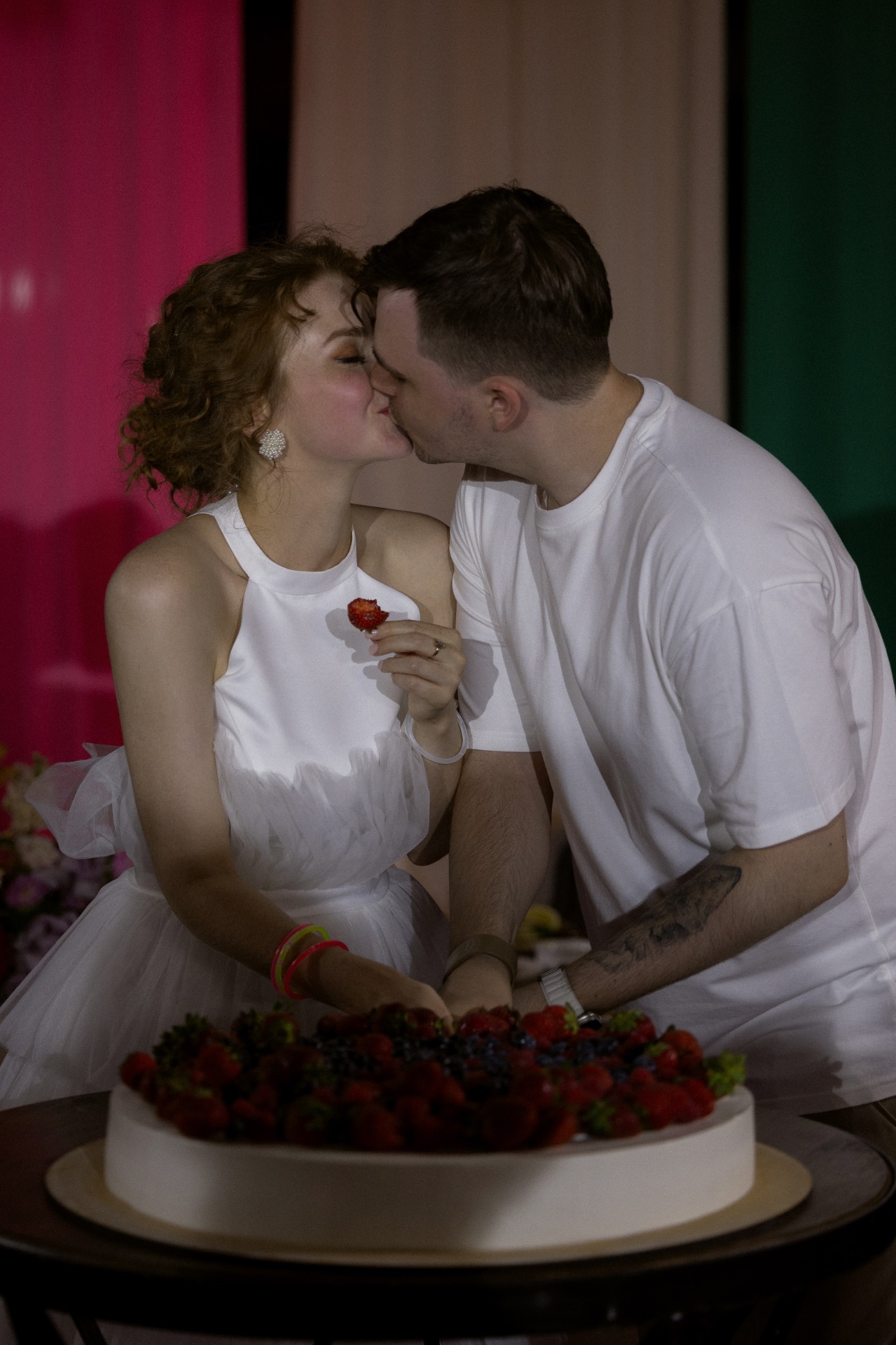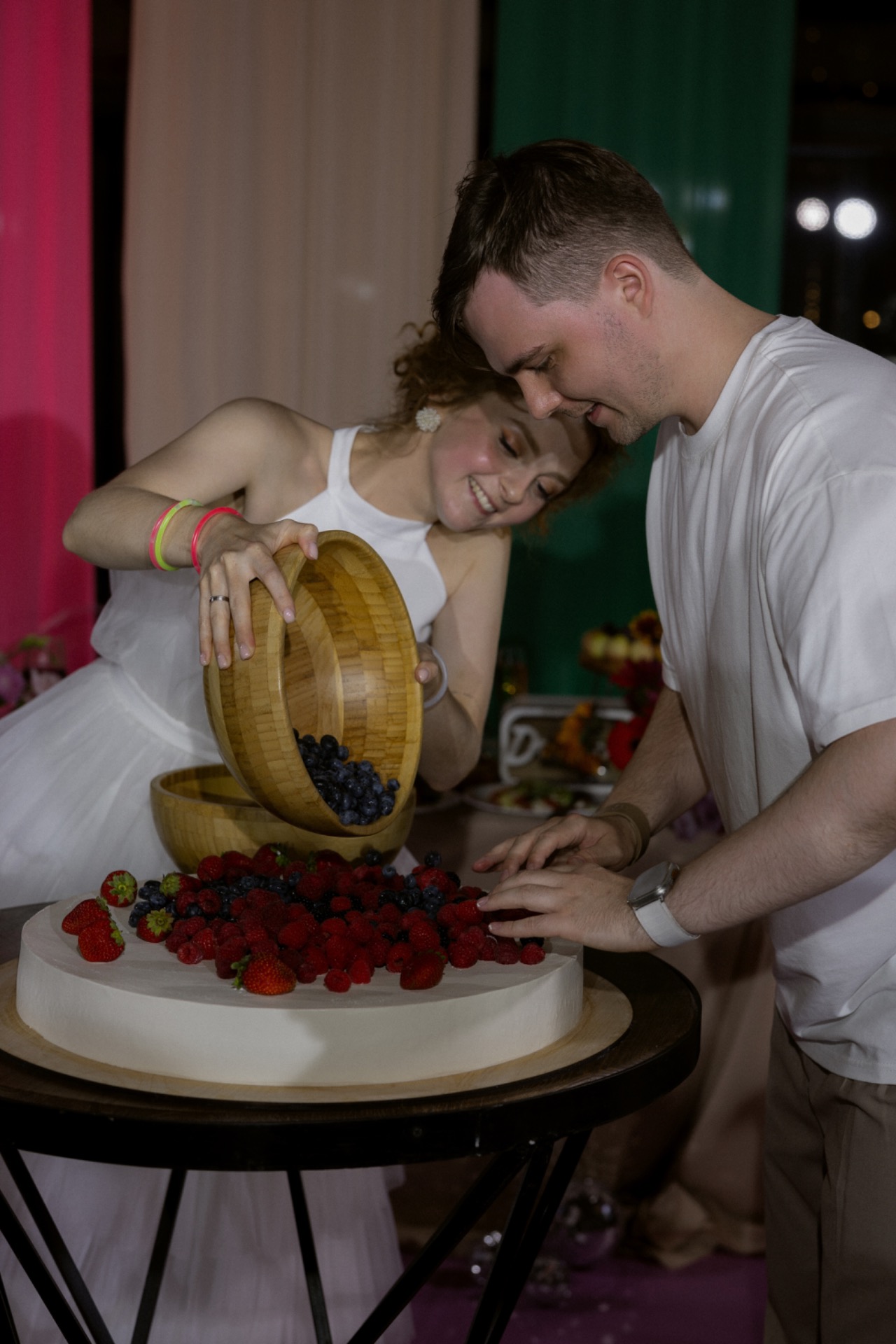 В вопросе торта нам не хотелось чего-то классического и банального, поэтому организаторы предложили сделать украшение самостоятельно. Мы с Данилой украсили десерт ягодами — это было очень мило и трогательно. Результат, на наш взгляд, получился просто вау. А сам торт был невероятно вкусным.
