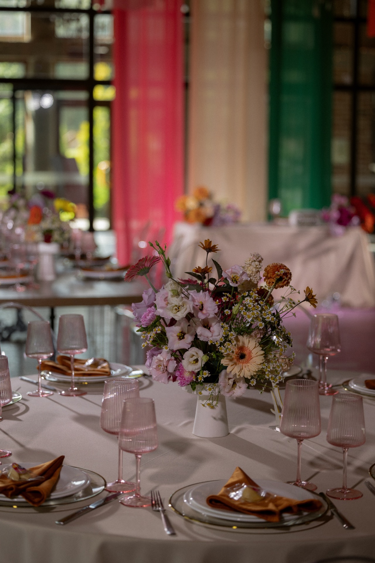 Мне очень нравятся герберы, и, как нам с организаторами показалось, они лучше всего вписались в оформление зоны церемонии. А в зале мы использовали сборные композиции из разных цветов, чтобы дух весны и лёгкости отражался во всём.