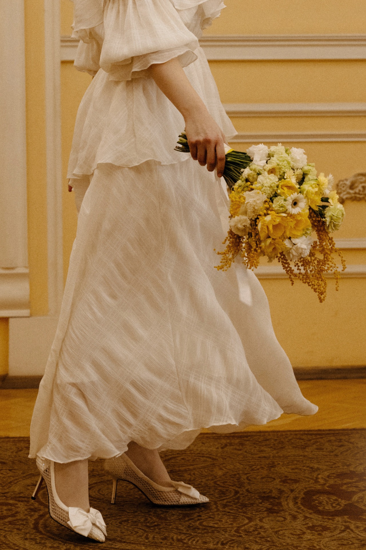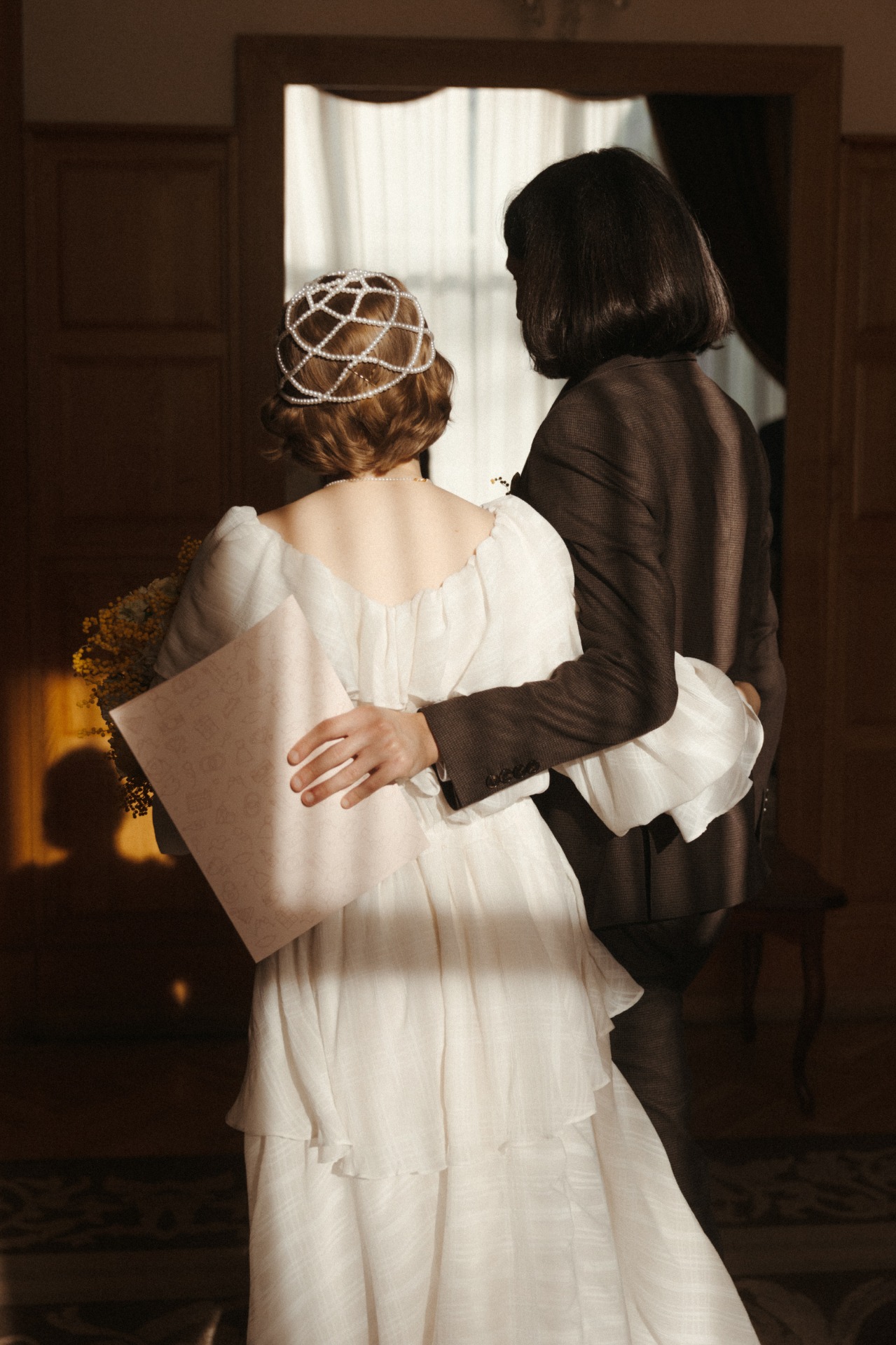 Тем не менее, заветный наряд всё-таки нашёл меня! Ещё за несколько лет до предложения мне приглянулось платье в винтажном стиле от локального петербургского бренда. Я мечтала купить его, но так и не решилась, а вскоре его распродали… Во время подготовки к свадьбе бренд неожиданно опубликовал пост о том, что они снова выпустили ограниченную партию этой самой модели — это было как знак свыше! Я сразу же оформила заказ. Уже при первой примерке я поняла: именно в этом платье я хочу выйти замуж.
