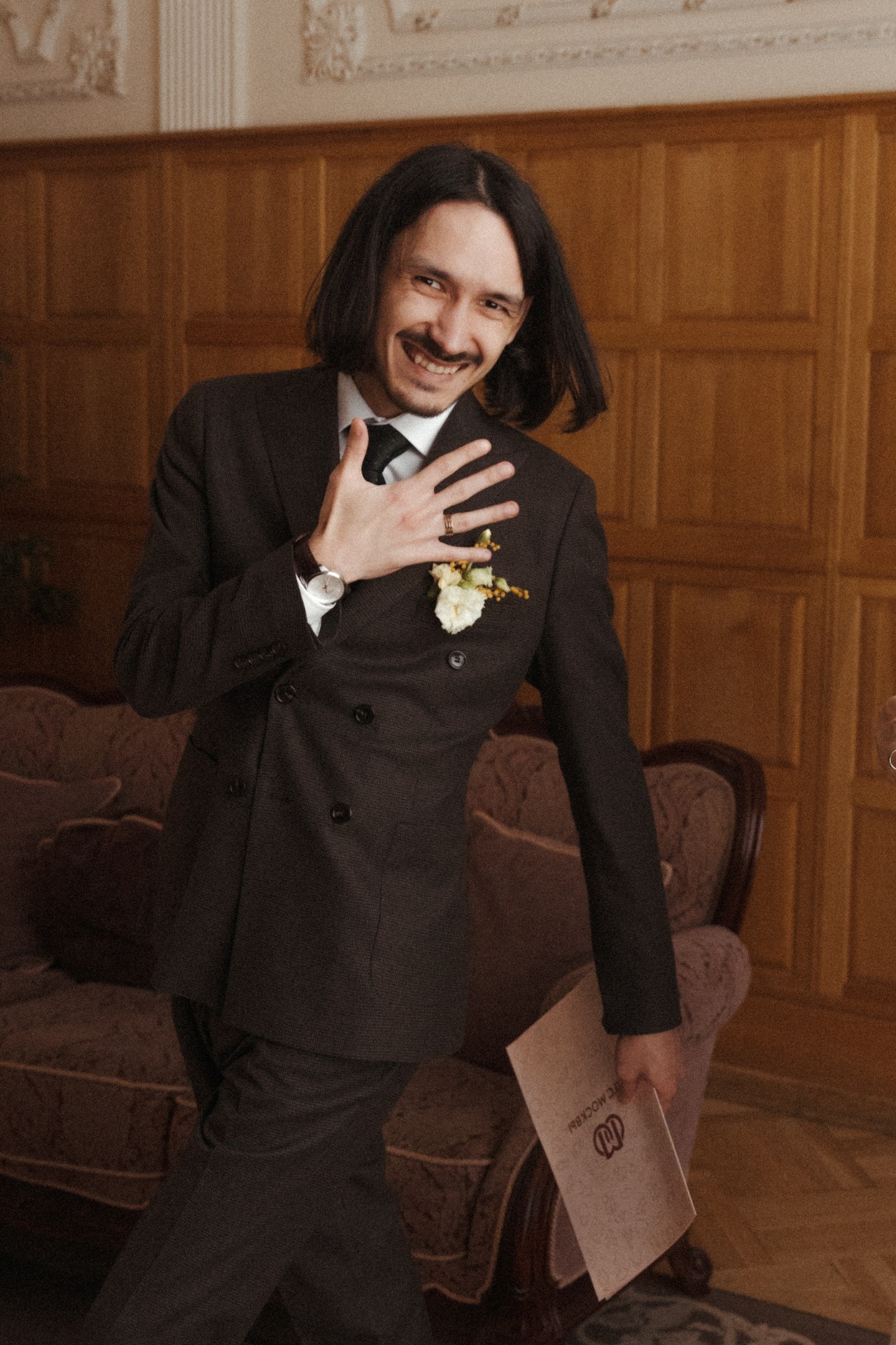 Все остальные элементы образа подбирались уже под платье, чтобы его гармонично дополнить. Жених хотел классический двубортный костюм, но не чёрного цвета. Фасон мы выбирали, отталкиваясь от моего наряда.
