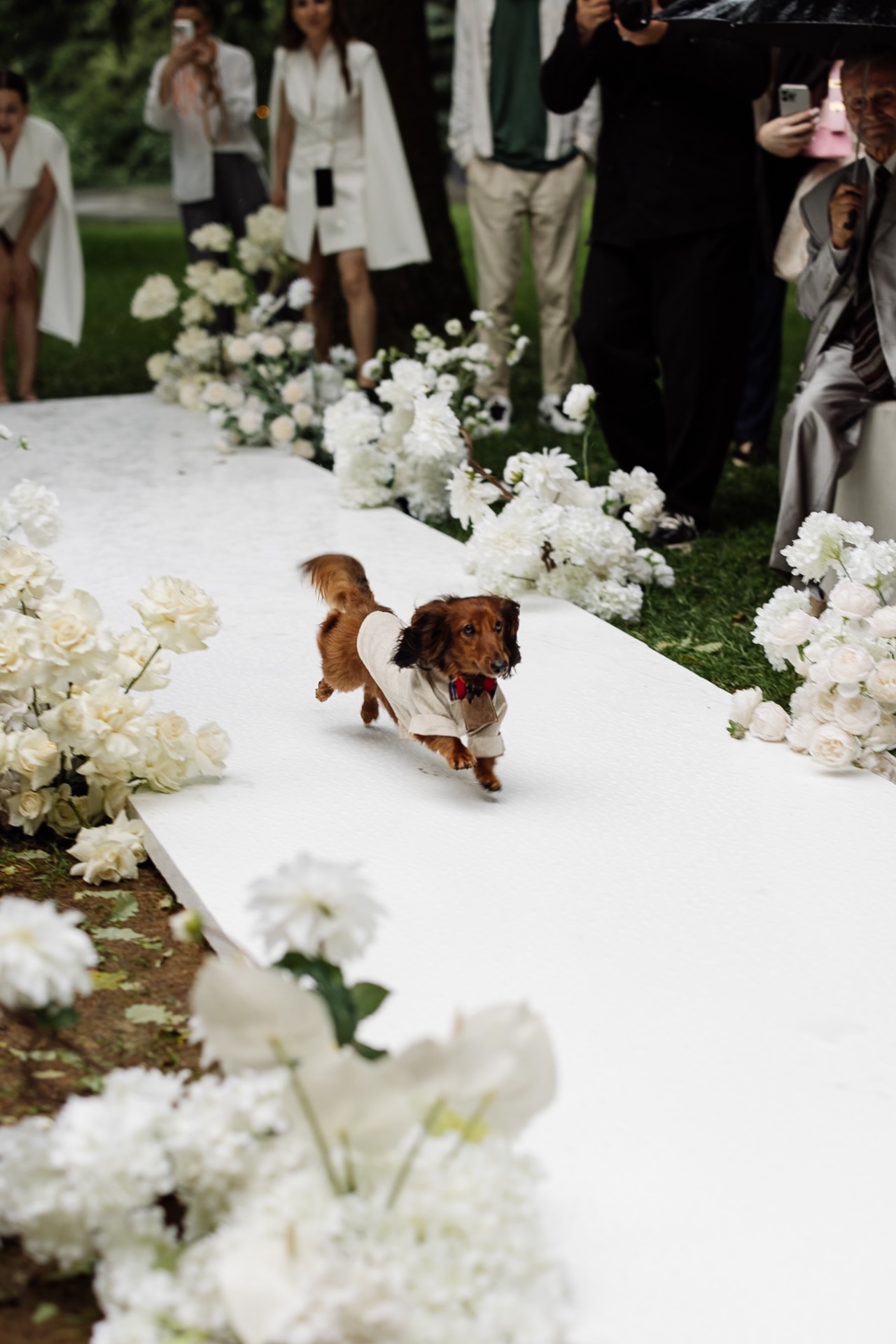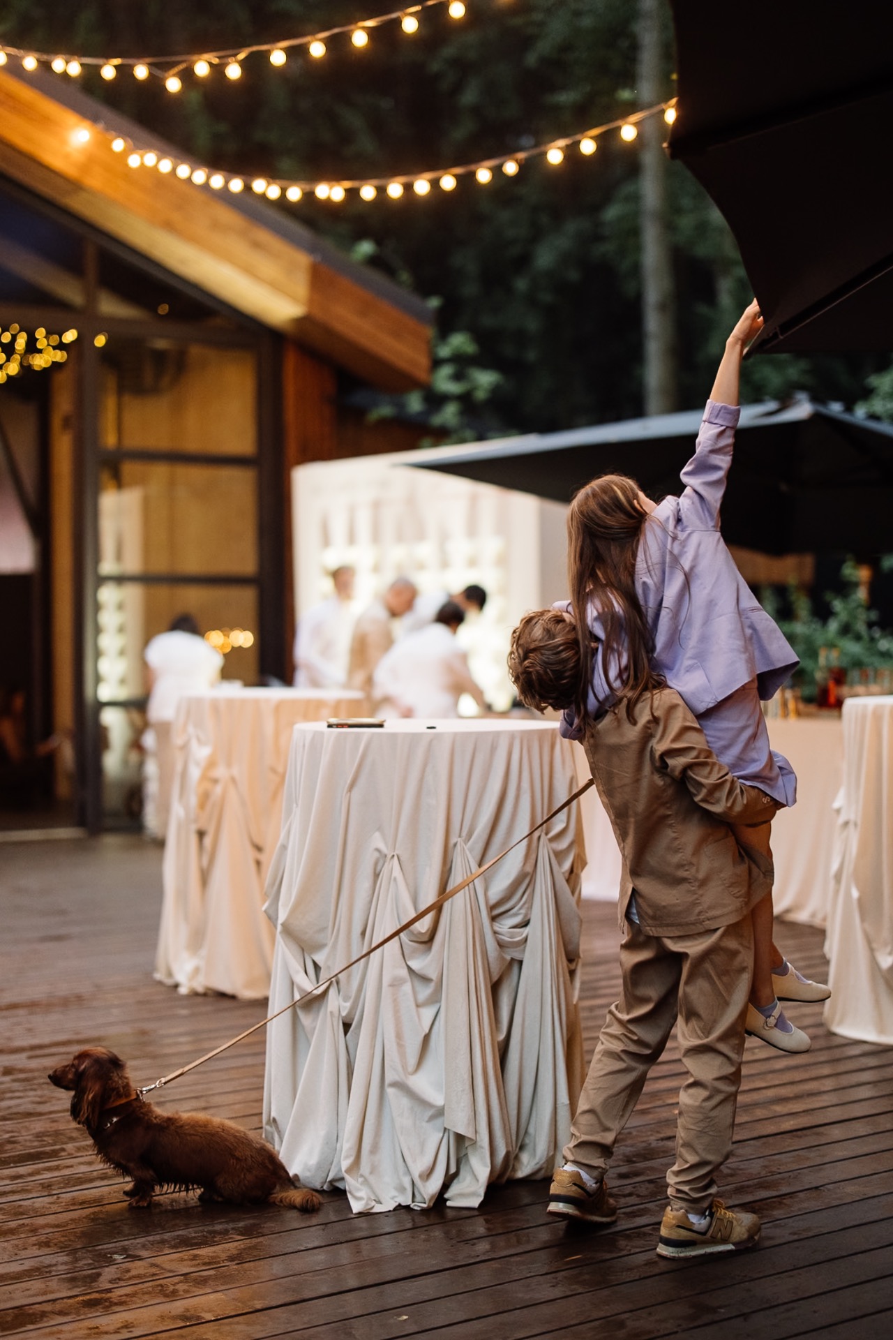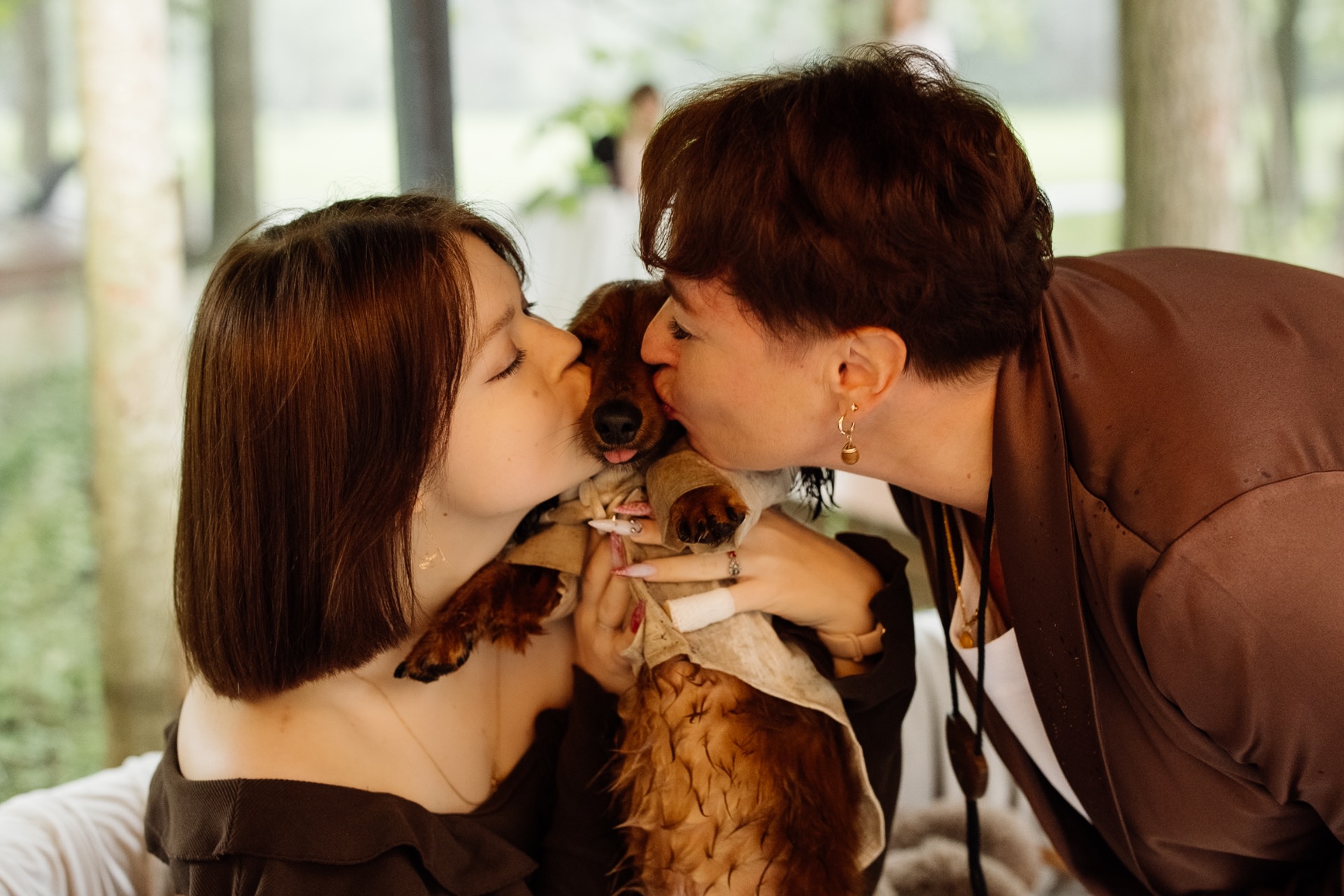 Мы подождали, но дождь не прекращался. Наш пёс, который должен был вынести кольца, успел промокнуть и испачкаться. Мы решили начинать и не дожидаться лучшего момента. Это было по-своему мило и весело. Моя причёска за пять минут превратилась в гнездо, но мне было не до неё. А в момент нашего с Владом поцелуя дождь внезапно закончился.
