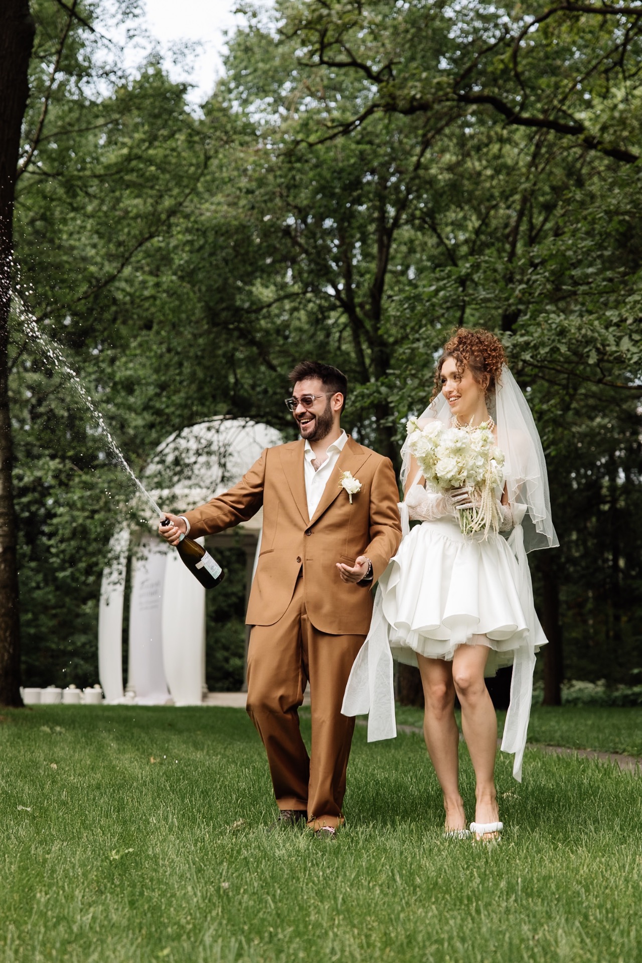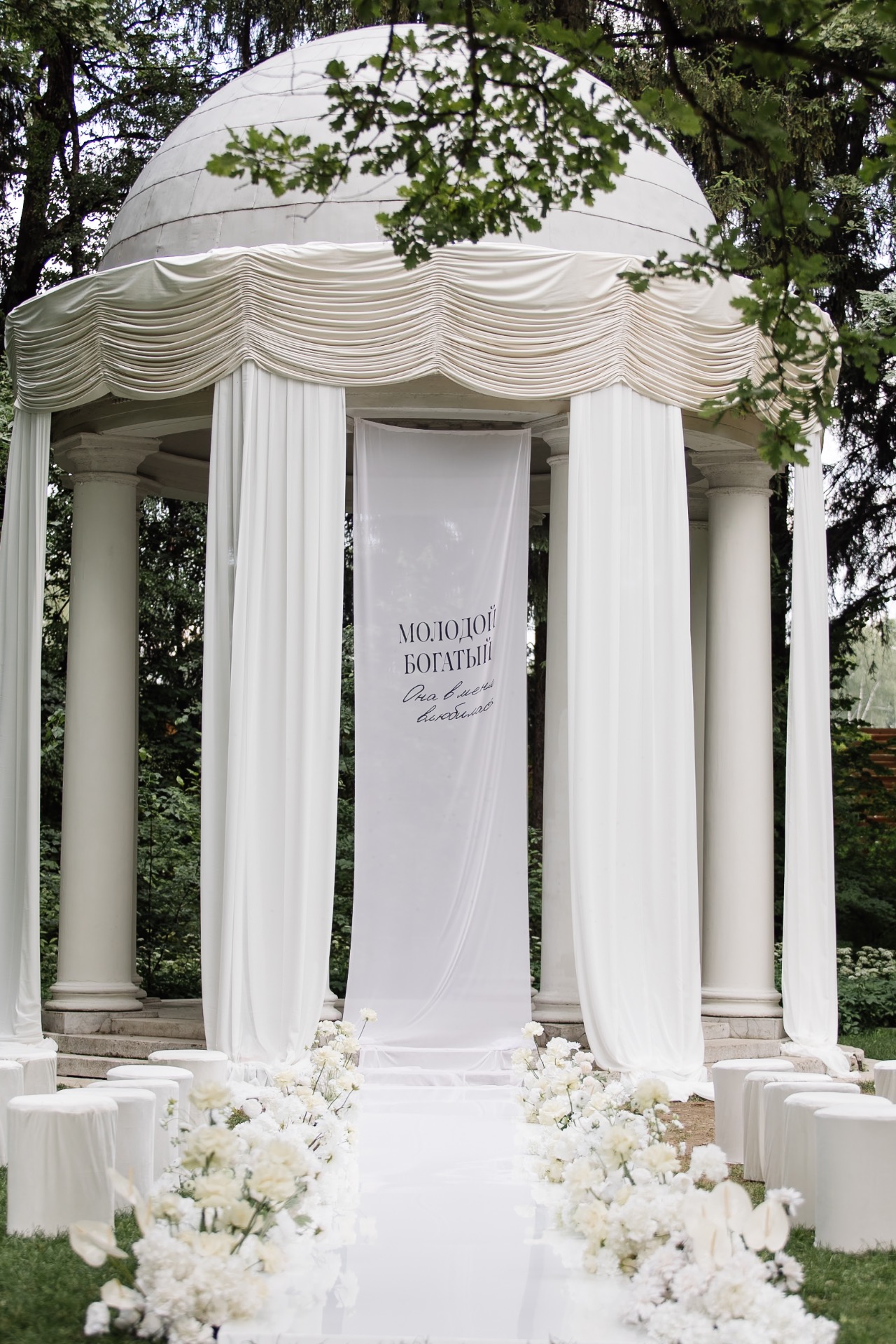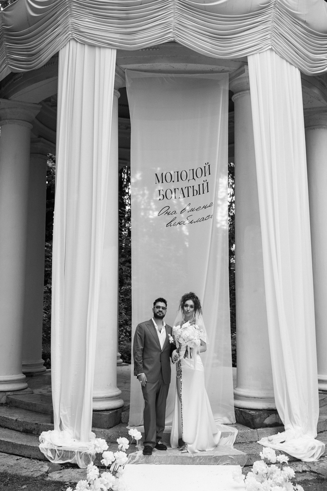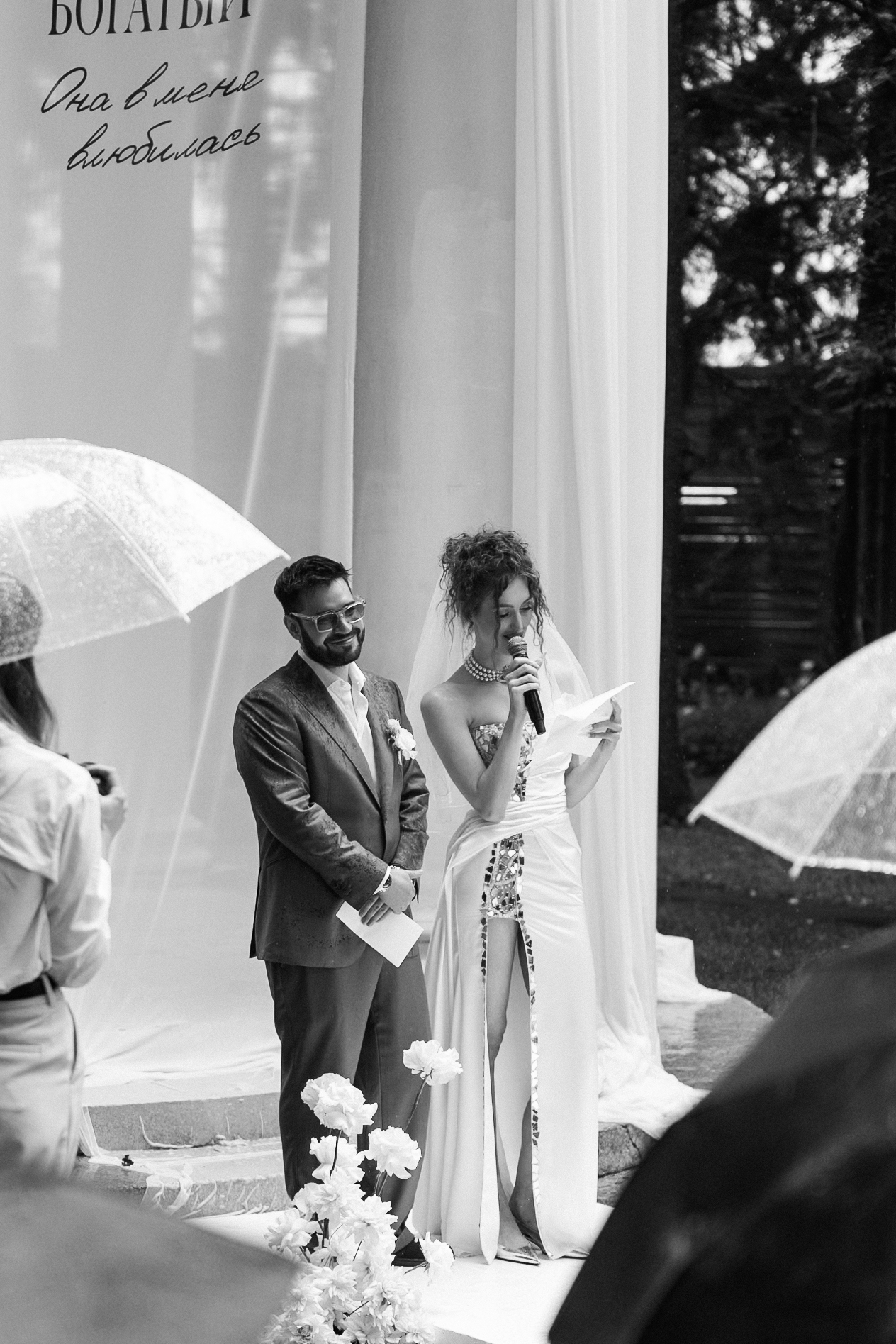 День начался рано: макияж, укладка, подготовка. У нас с Владом была двухчасовая фотосессия, погода стояла отличная. Всё шло идеально до сбора гостей. Начался ливень, а церемония должна была проходить на улице, в ротонде.