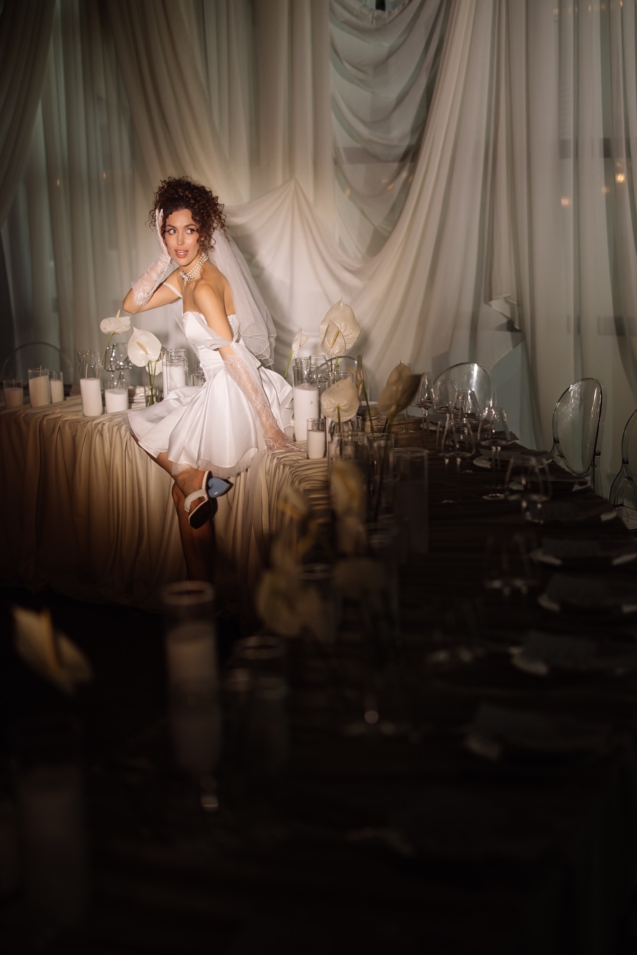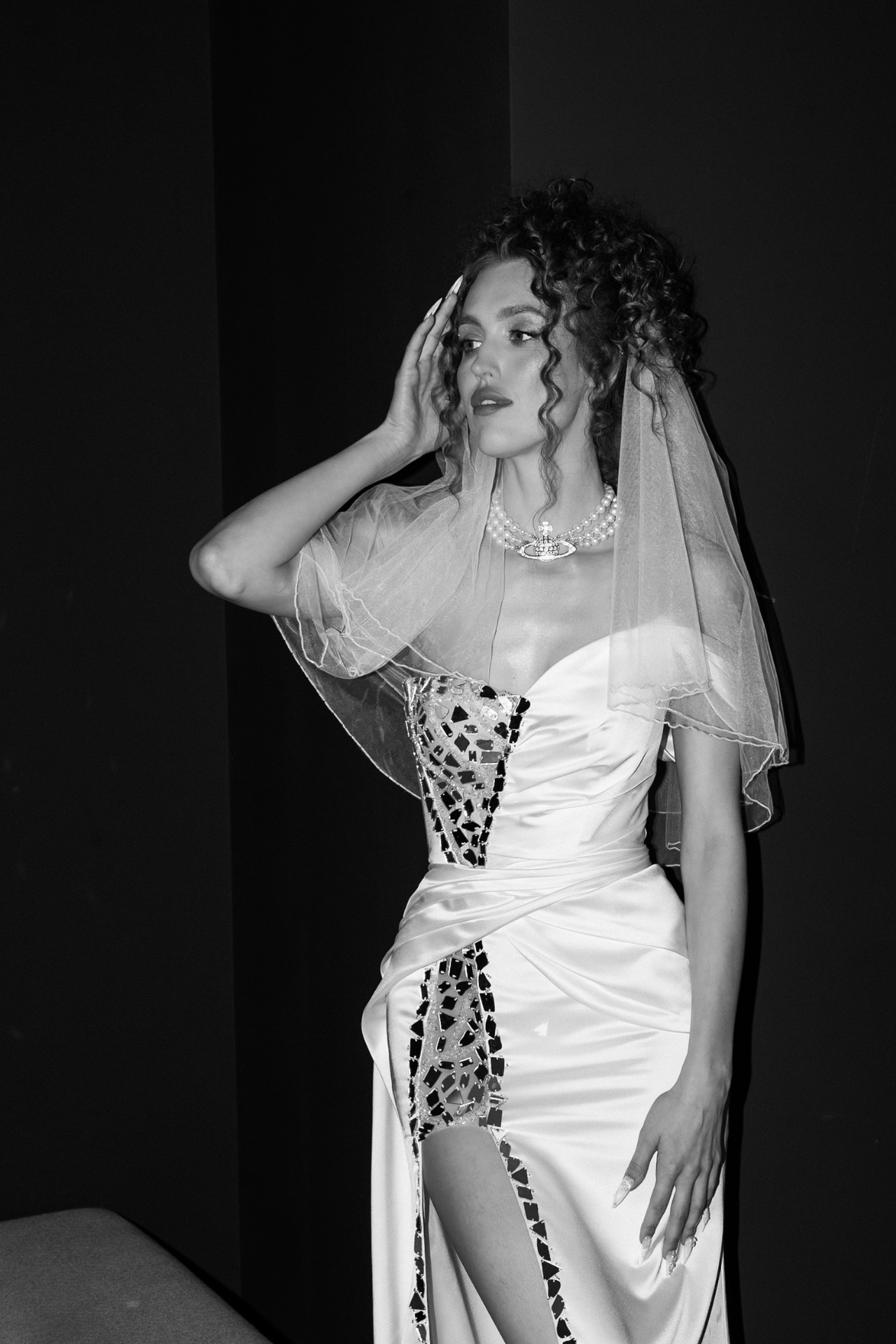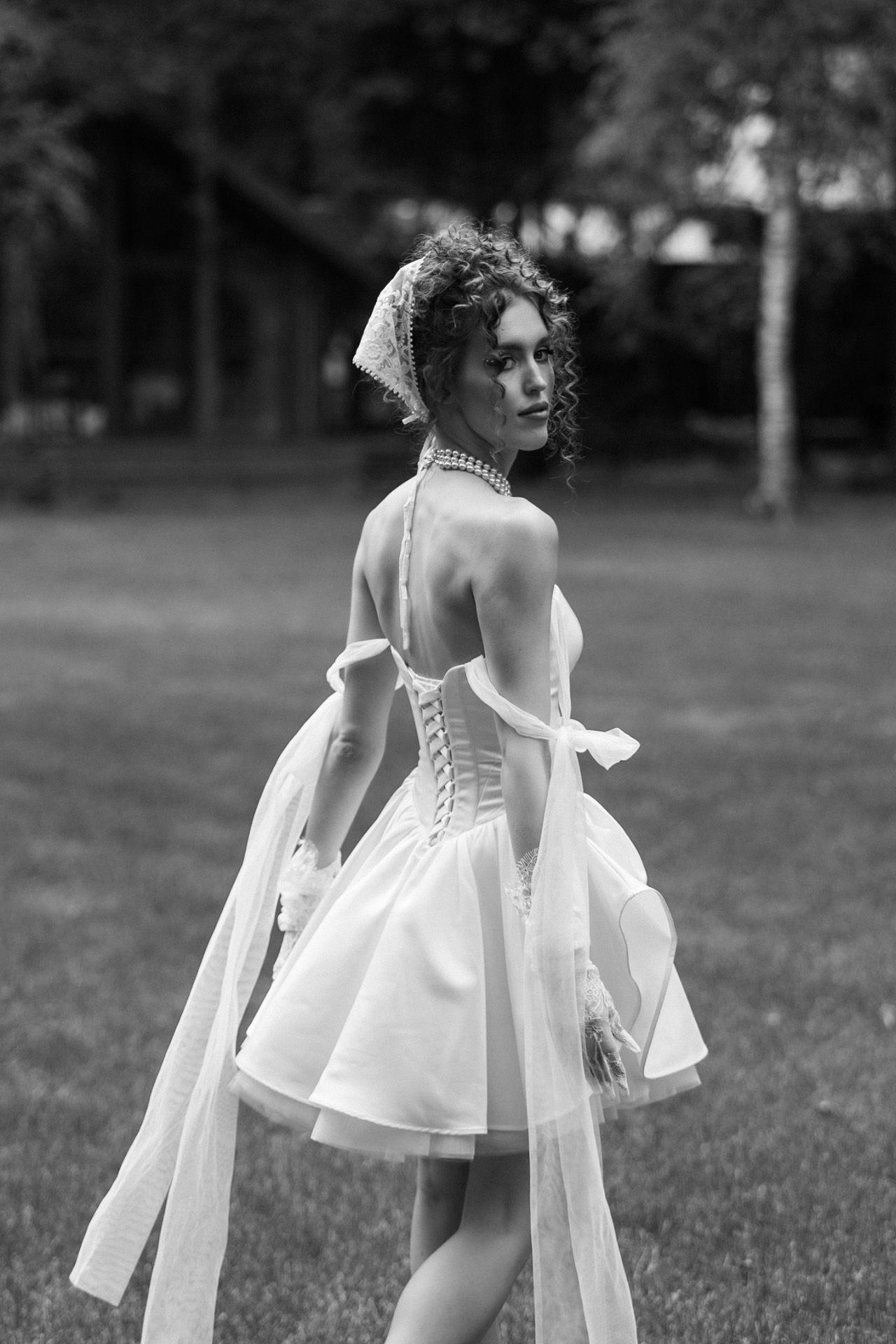 А вот мой образ полностью отражал мой характер: милая и красивая девочка, но немного безбашенная и сумасшедшая внутри. Поэтому платье я выбрала необычное, но элегантное. И дополнила образ объёмной причёской.