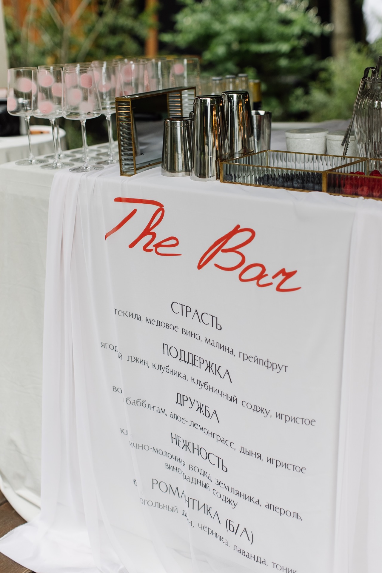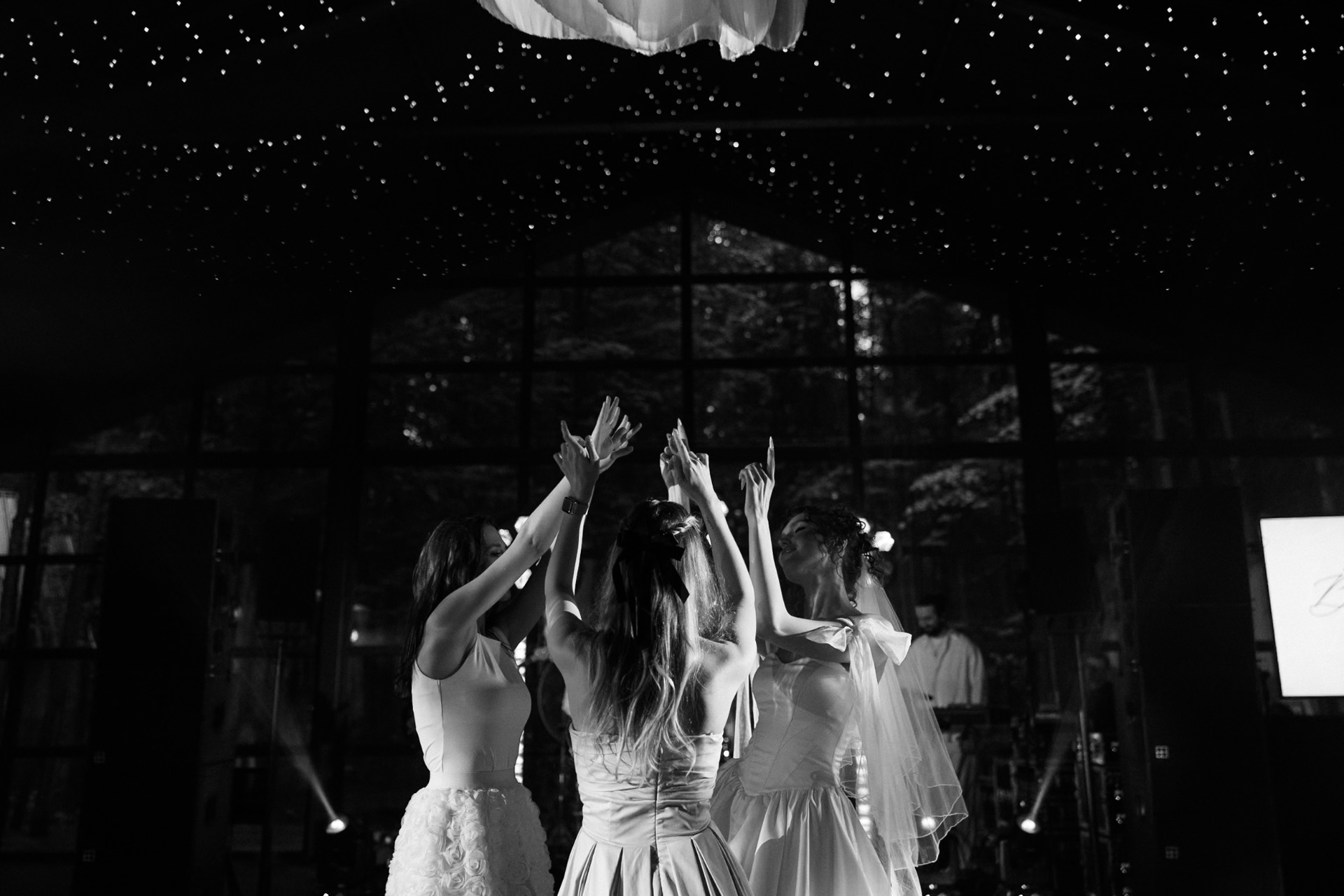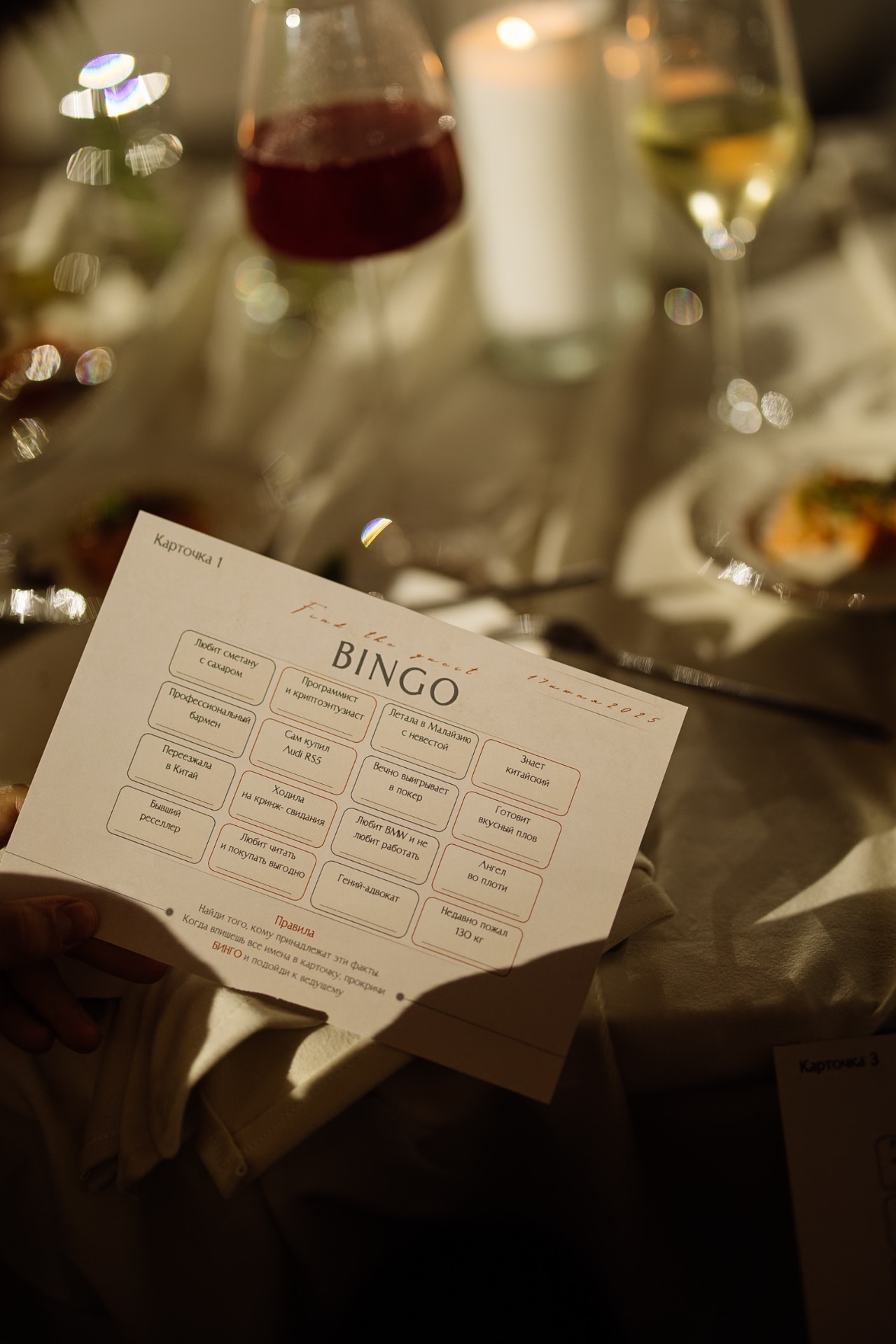 В зале были тосты, много тёплых слов. Из развлечений: свадебное бинго для знакомства гостей, музыкальная викторина «Мальчики против девочек» (нужно было угадать песню по мелодии). Я бросала подругам букет, а парни мерились силой на специальном аппарате, самый сильный из всех получил приз.