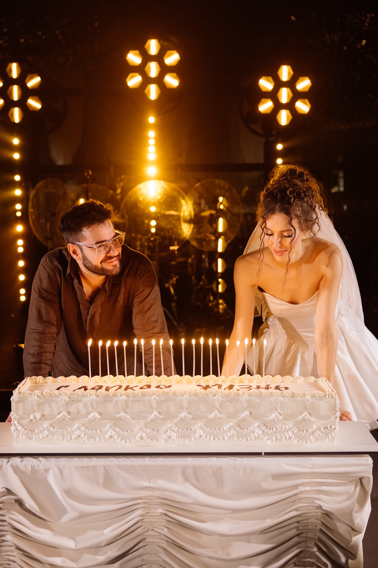 Декором занимались организаторы, от меня требовалось только согласование. Торт мы хотели трендовый, плоский, с идеей задуть свечи от краёв к центру.