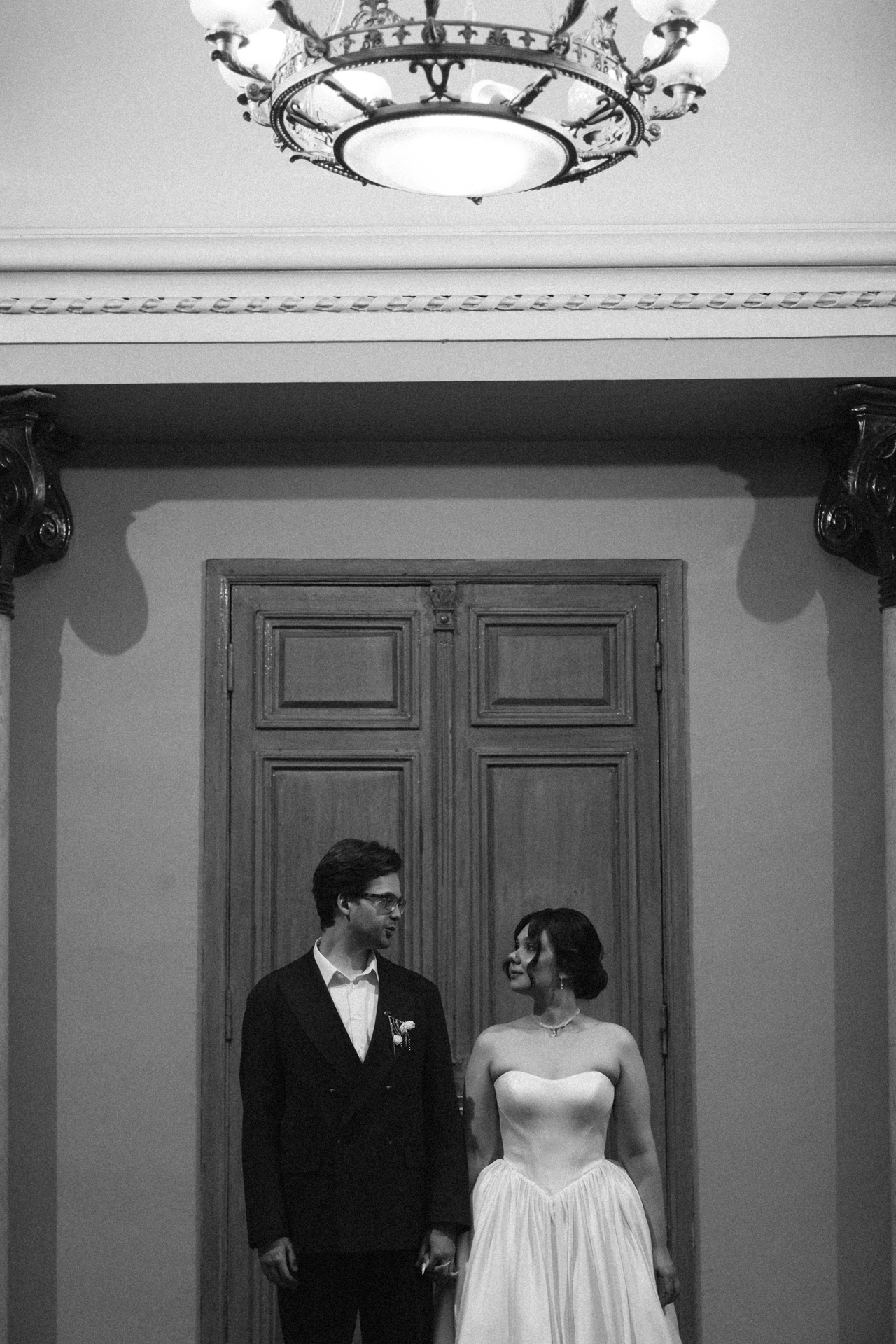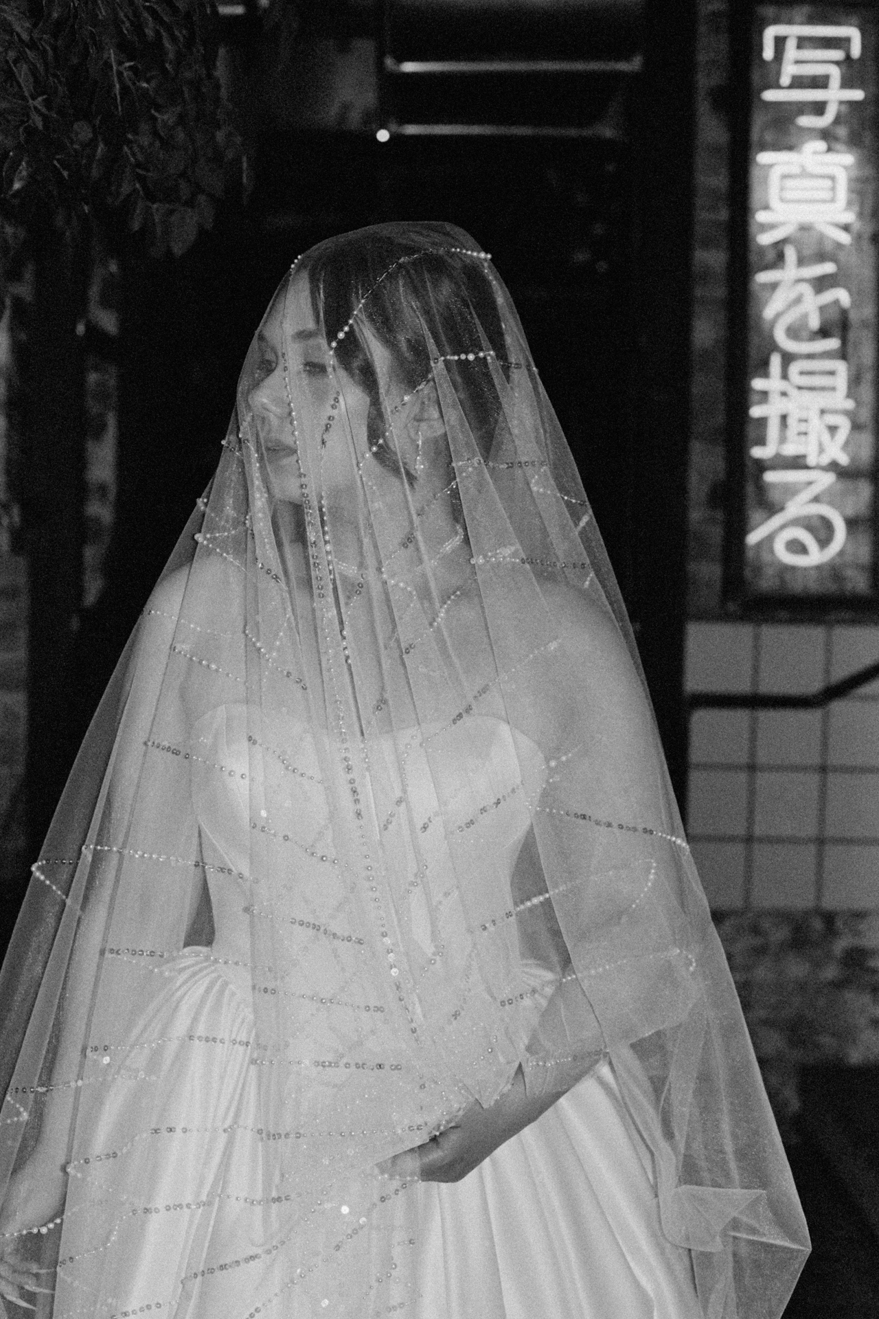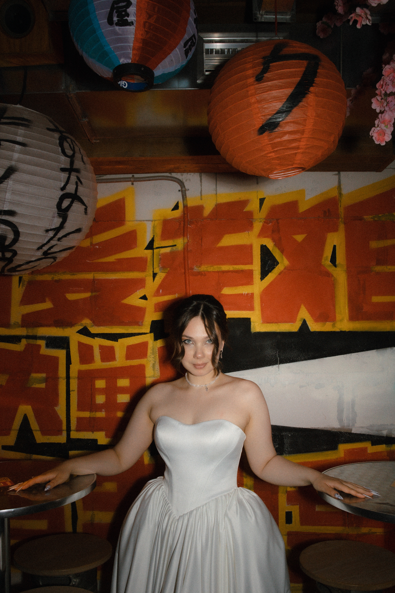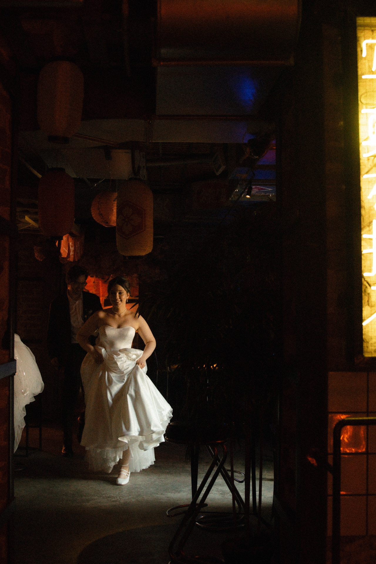 Мы решили объединить это всё воедино, и родилась идея разделить свадьбу на две части. Первая — элегантная и классическая, вторая — неформальная и тусовочная. Это разделение мы подчеркнули и в нашей фотосессии. Первая локация — это художественный музей, вторая — азиатский бар с неоновыми огнями.
